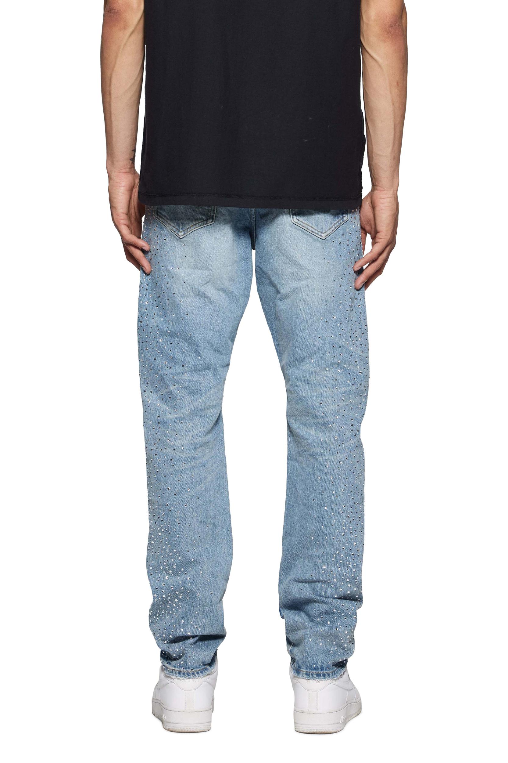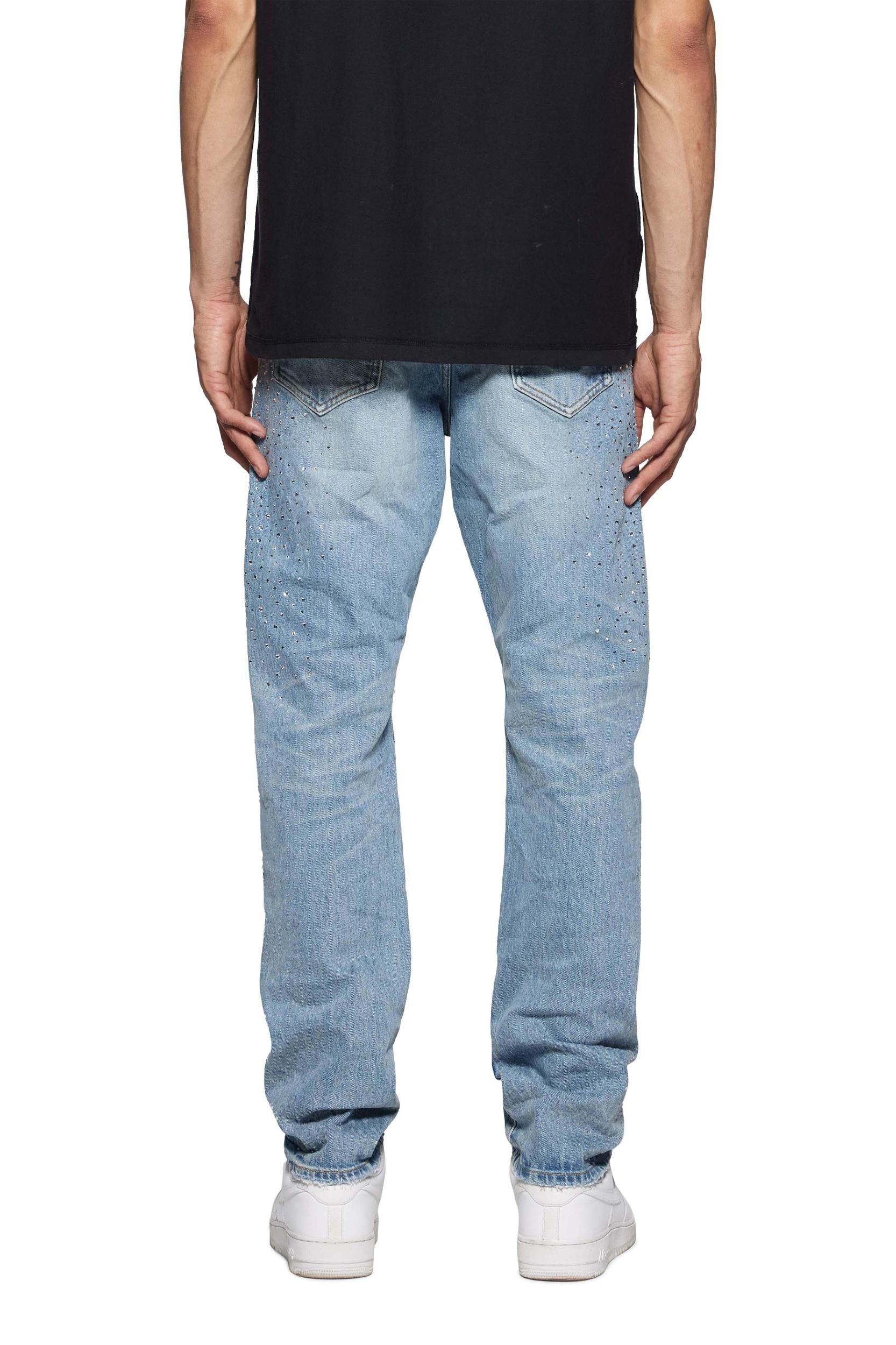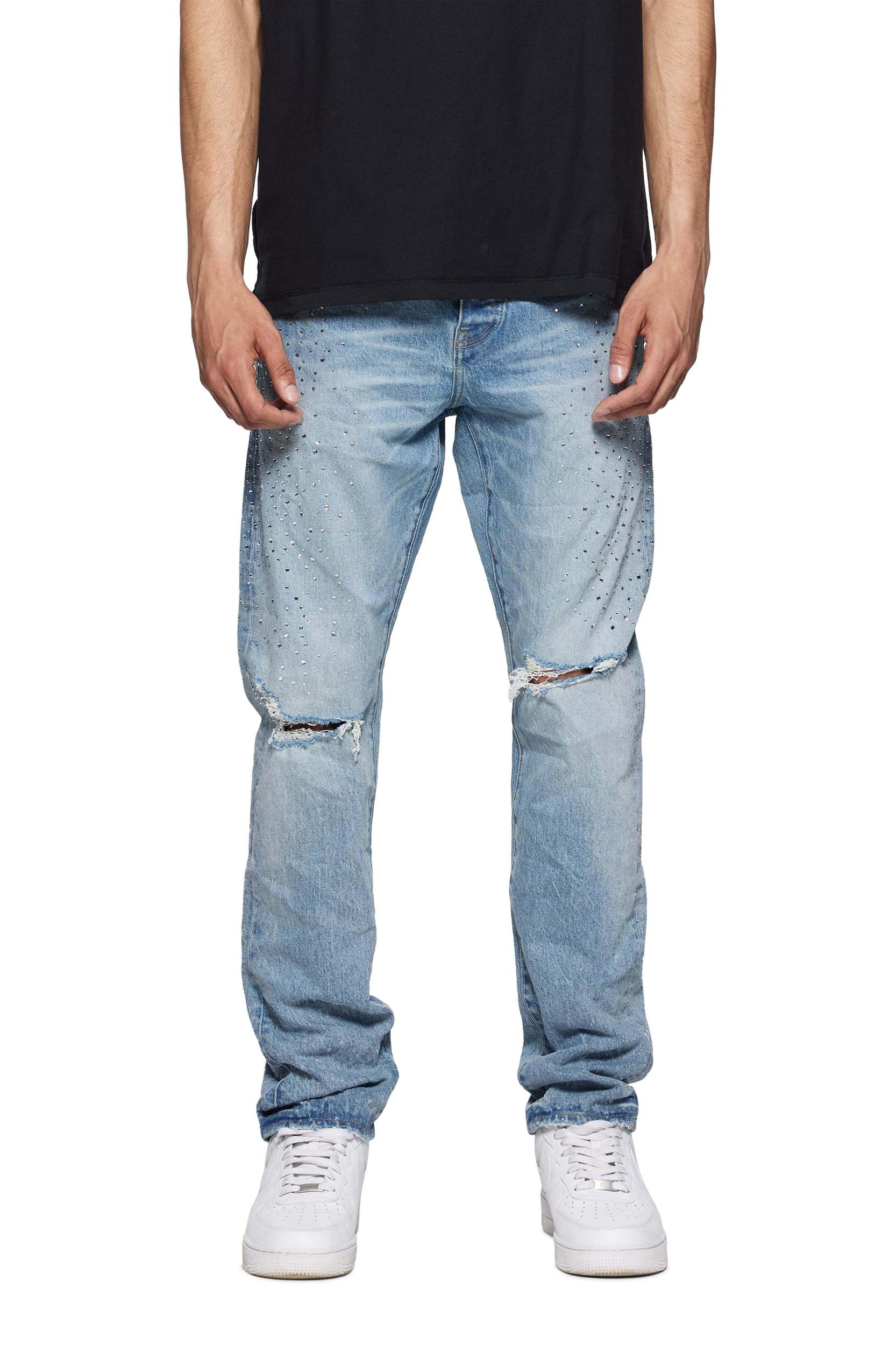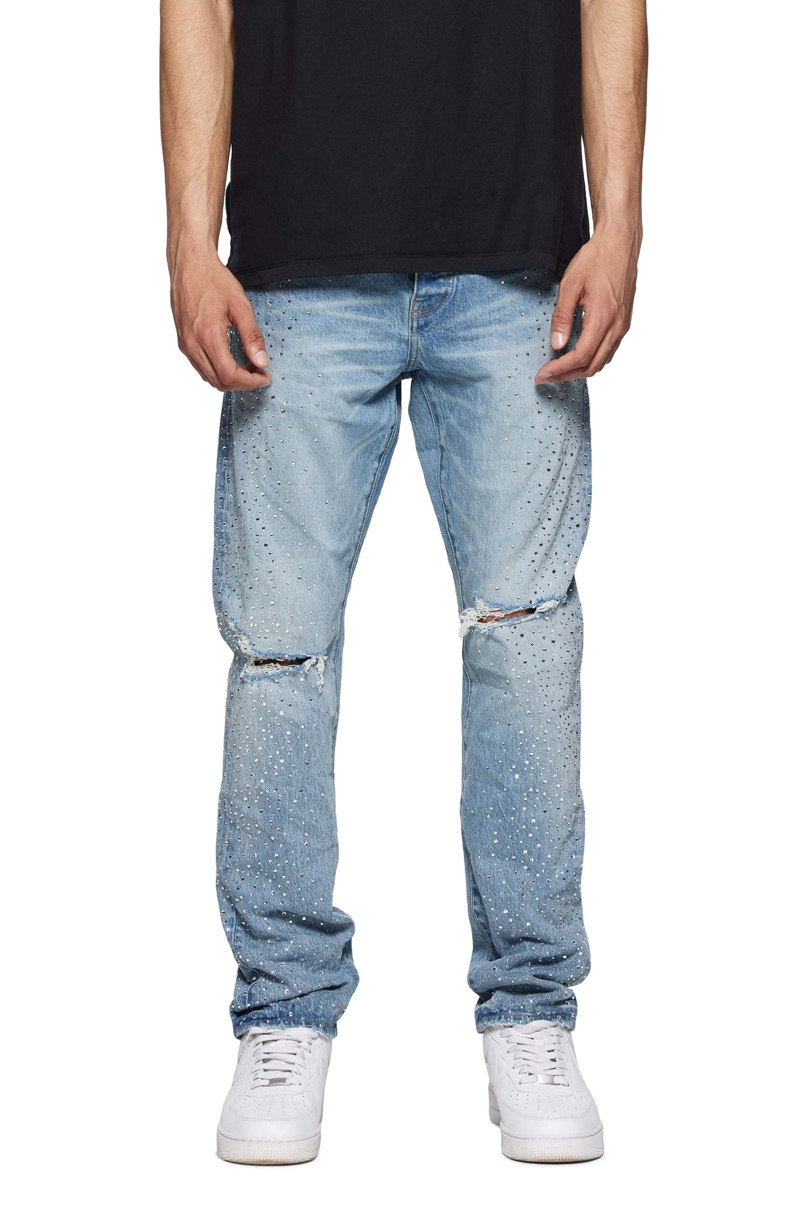 Constructed from light indigo premium stretch denim, faded and whiskered by hand, this mid-rise slim straight leg is detailed with hotfix crystals on the tops of each thigh and knee slits. Pre Spring 2025 White Label Premium stretch denim - 99% Cotton / 1% Elastane Slim Straight Mid Rise Hotfix Crystals 5 Pocket Styling Back Pocket Lining 11 3/4" Front Rise, 15 3/4" Back Rise, 33" Inseam, 7 1/4" Leg Opening Includes signature Purple hangtag and branded leather patch on back Lined back pockets and yoke for comfort and to help retain shape with wear Back pockets feature subtle bar-tack stitching and hidden rivets for added durability Dart between side seam & back pocket to enhance fit Belt loops and front pockets reinforced for durability Button fly All Purple jeans feature unique washes and dye methods and are finished individually by hand - no two pieces are the same. Each jean is packaged and secured with ties to preserve custom details like our the 3D wrinkle effect or custom paint finishes while shipped.