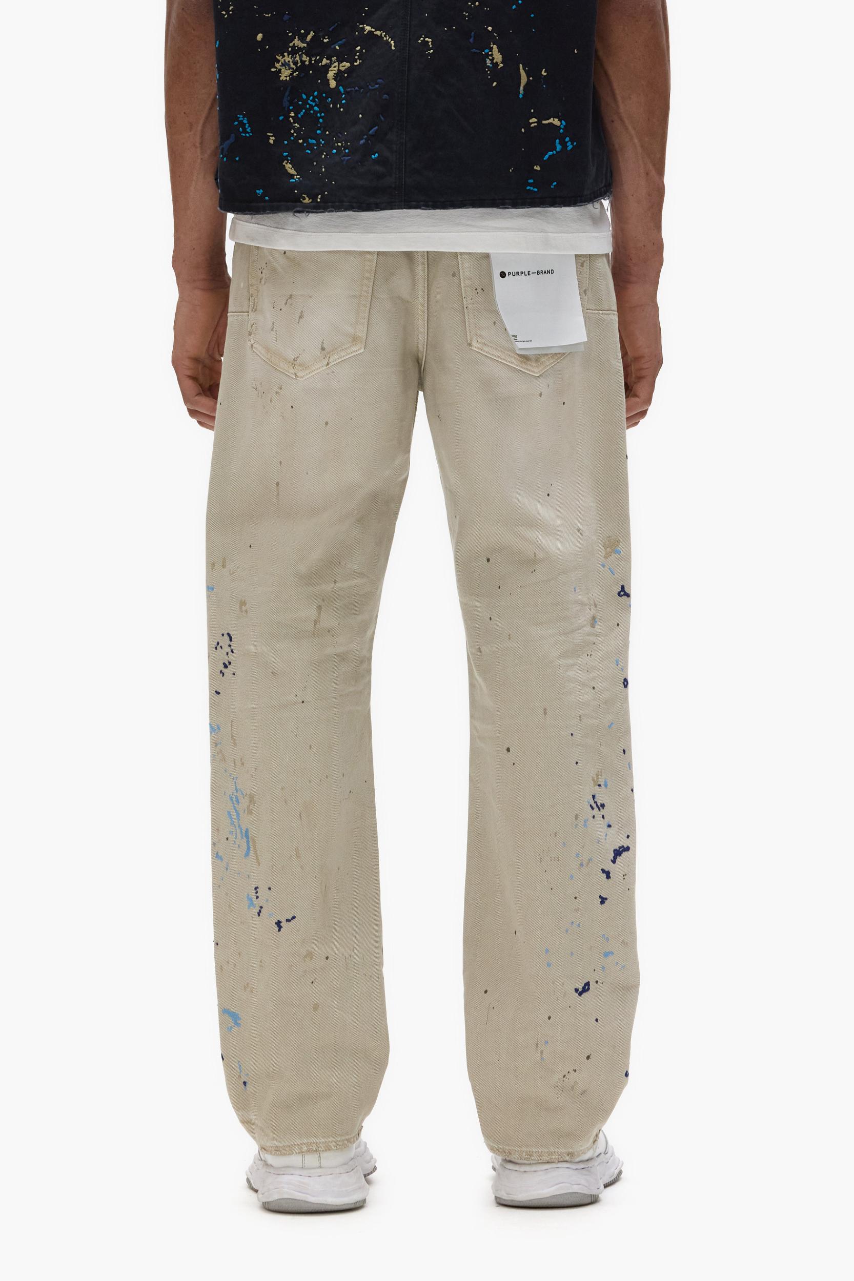 Our P011 is a mid-rise men’s jean, crafted from premium denim with classic five-pocket construction that includes a button-fly closure and reinforced belt loops as well as hidden rivets and an inner lining on the back pockets for durability. It’s cut straight through the thigh to the ankle, and comes overdyed in a khaki wash with paint-splatter embroidery. A custom Purple cowhide leather patch, a back pocket flasher and a logo hangtag lend signature branded finishes. Pre Fall 2025 White Label Premium Stretch Denim - 100% Cotton Overdyed Embroidery Mid Rise 5 Pocket Styling Includes signature Purple hangtag and branded leather patch on back Lined back pockets and yoke for comfort and to help retain shape with wear Back pockets feature subtle bar-tack stitching and hidden rivets for added durability Dart between side seam & back pocket to enhance fit Belt loops and front pockets reinforced for durability Button fly All Purple jeans feature unique washes and dye methods and are finished individually by hand - no two pieces are the same. Each jean is packaged and secured with ties to preserve custom details like our the 3D wrinkle effect or custom paint finishes while shipped.