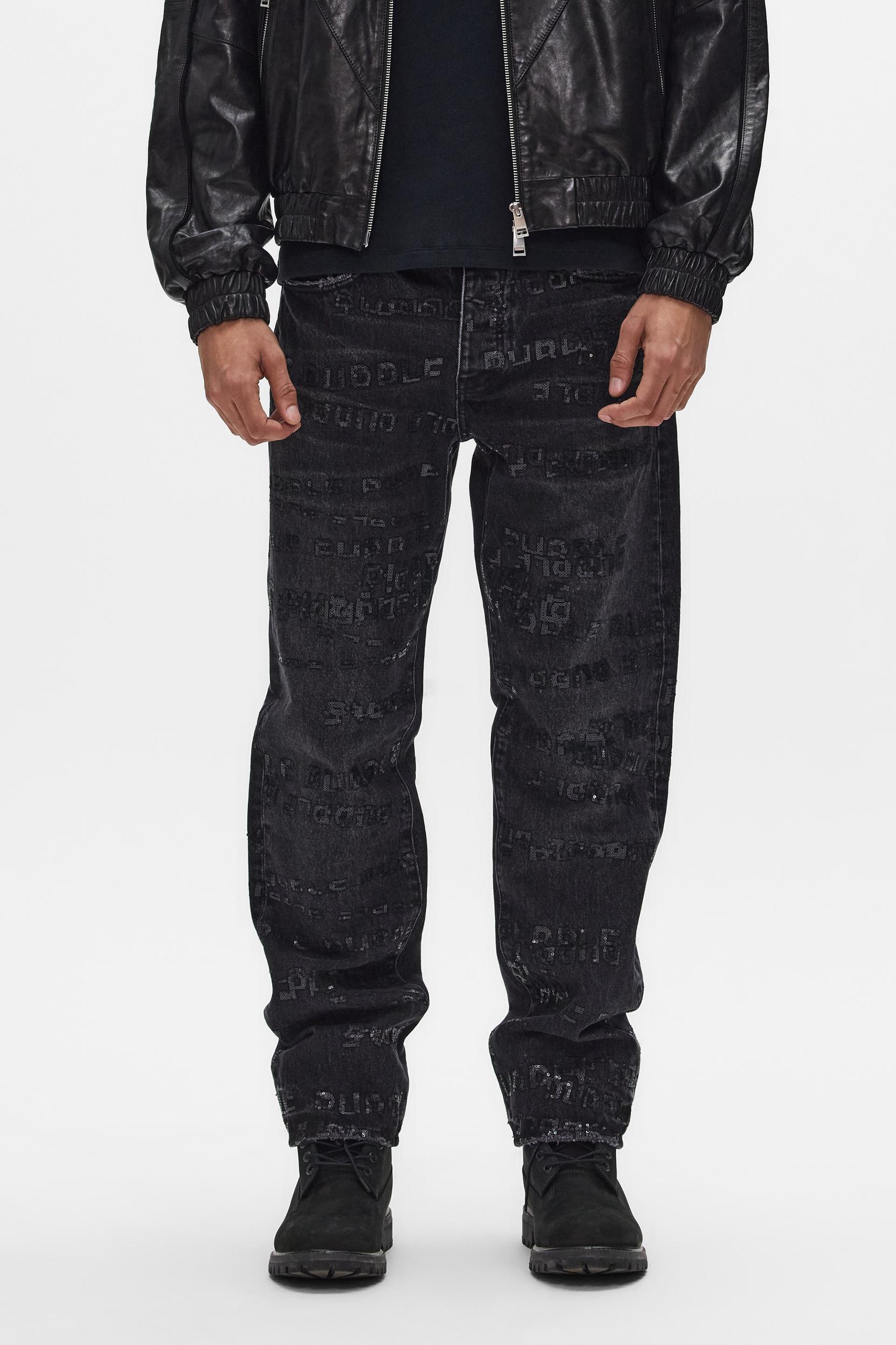 Spring Summer 2026 White Label 100% Cotton Straight Leg Mid Rise All Over Logo Design in Embroidered Sequins Includes signature Purple hangtag and branded leather patch on back Lined back pockets and yoke for comfort and to help retain shape with wear Back pockets feature subtle bar-tack stitching and hidden rivets for added durability Dart between side seam & back pocket to enhance fit Belt loops and front pockets reinforced for durability Button fly 5 Pocket Styling All Purple jeans feature unique washes and dye methods and are finished individually by hand - no two pieces are the same.