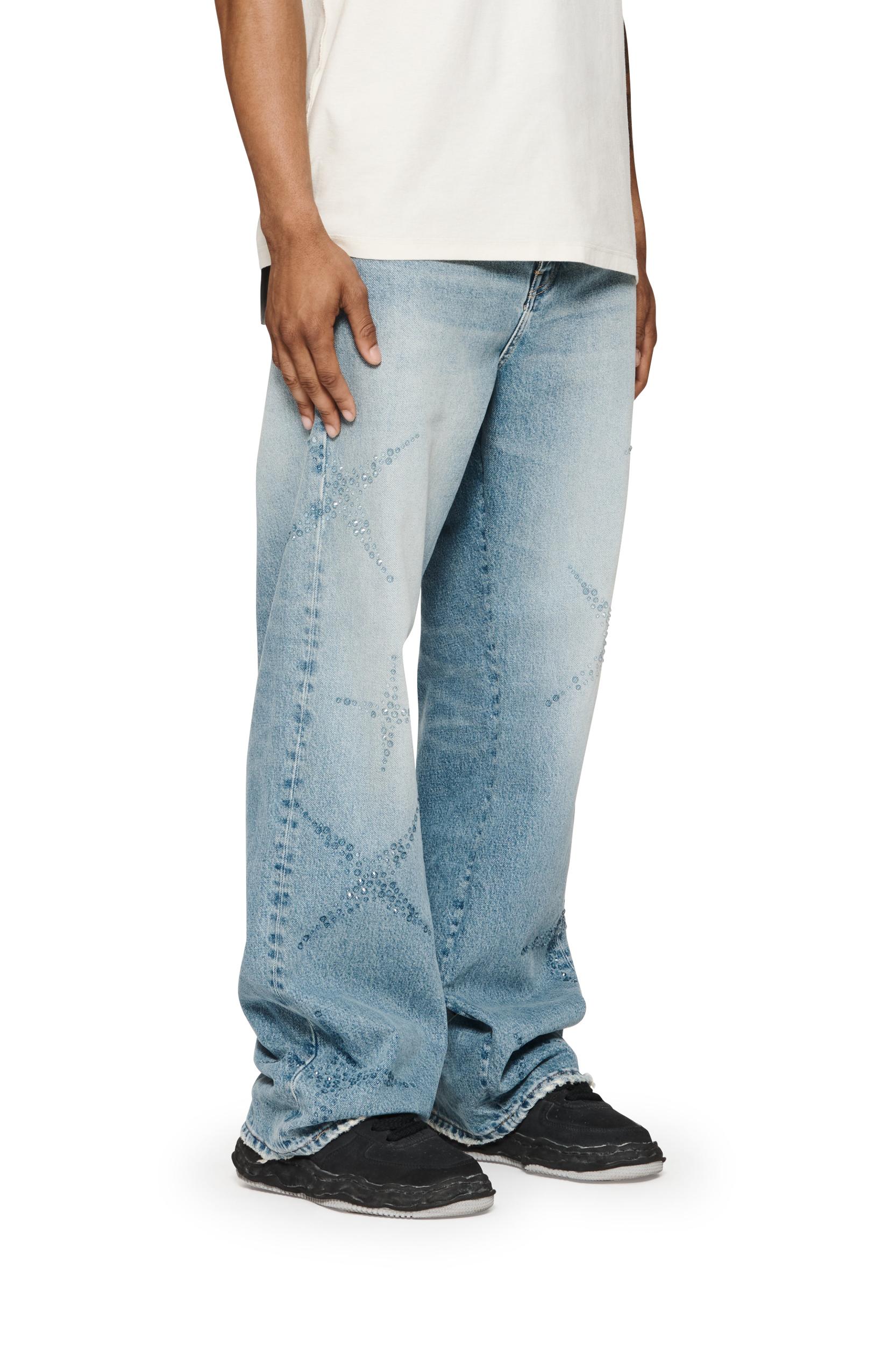 Crafted from premium stretch denim in a light indigo wash embellished with crystals in star shapes, this mid-rise baggy leg is detailed with reinforced belt loops for extra durability, cotton lining for a more comfortable fit. Allover Crystal Star Shapes Premium stretch denim - 99% Cotton / 1% Lycra Includes signature Purple hangtag and branded leather patch on back Lined back pockets and yoke for comfort and to help retain shape with wear Back pockets feature subtle bar-tack stitching and hidden rivets for added durability Dart between side seam & back pocket to enhance fit Belt loops and front pockets reinforced for durability Button fly All Purple jeans feature unique washes and dye methods and are finished individually by hand - no two pieces are the same. Each jean is packaged and secured with ties to preserve custom details like our the 3D wrinkle effect or custom paint finishes while shipped.