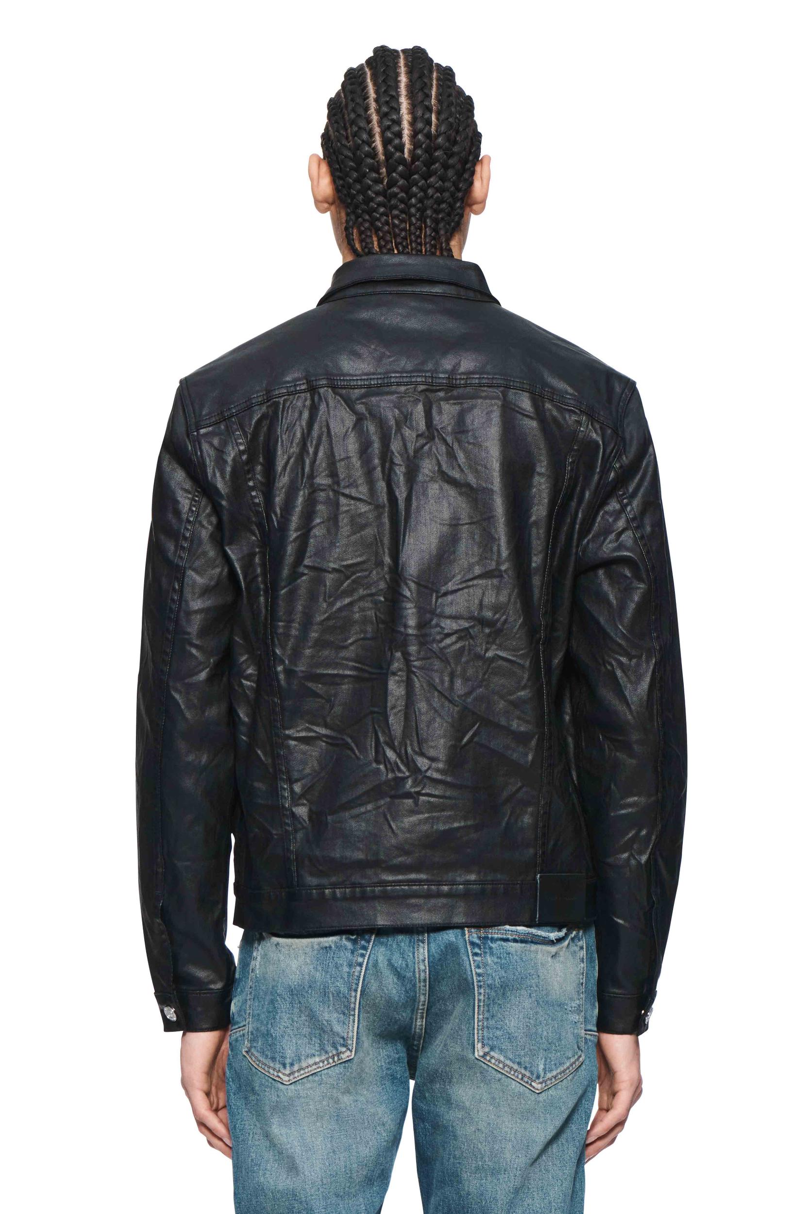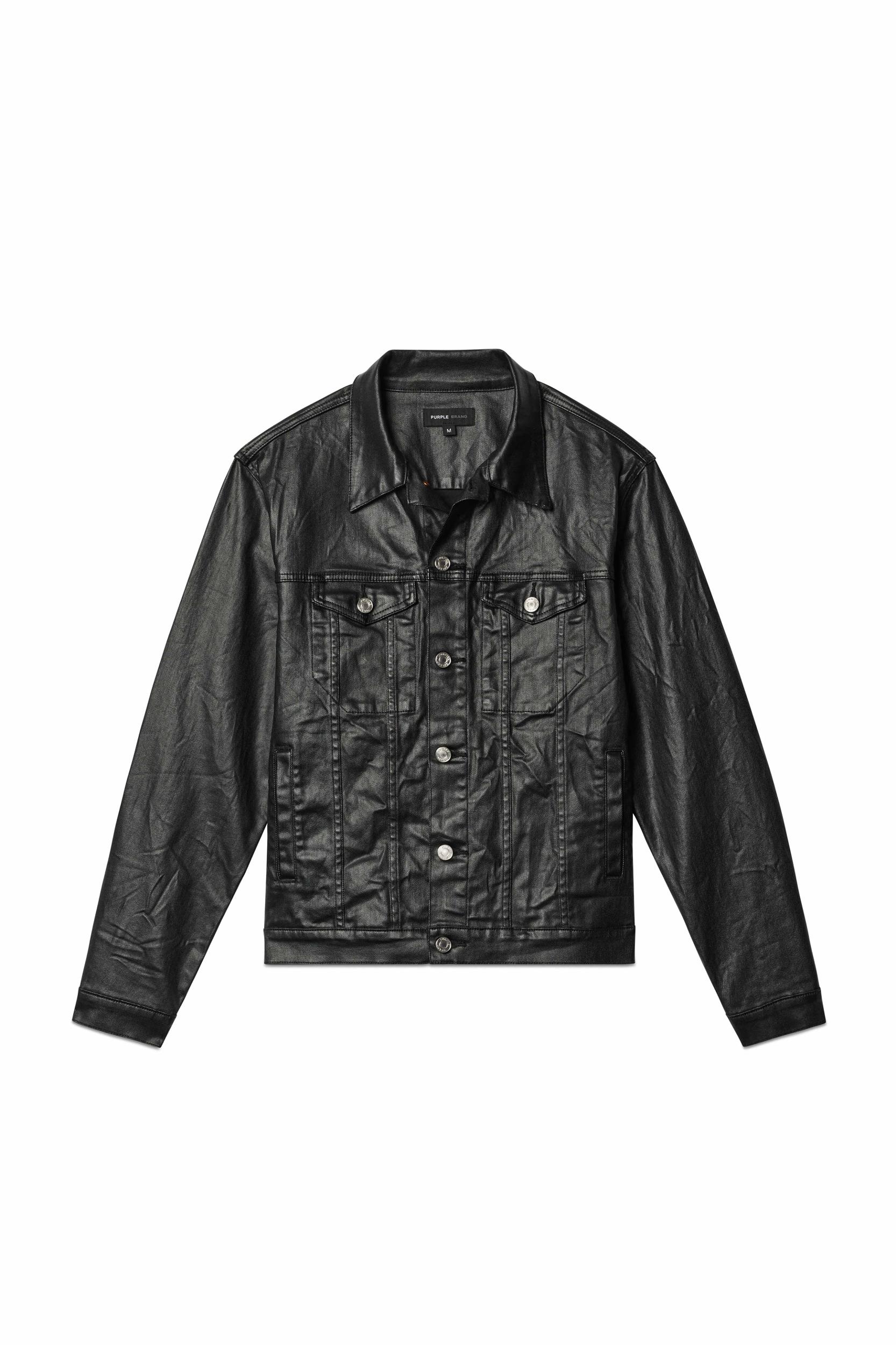 Cut from premium black stretch denim, coated for a patentlike finish, this trucker jacket is designed for a regular fit, with double flap pockets at the chest, double side pockets, adjustable cuffs and, in back, a custom Purple cowhide leather patch at the back of the hem. Fall Winter 2024 White Label 98% Cotton / 2% Lycra 26 3/4" Length, 23 1/2" Chest, 36 1/2" Sleeve