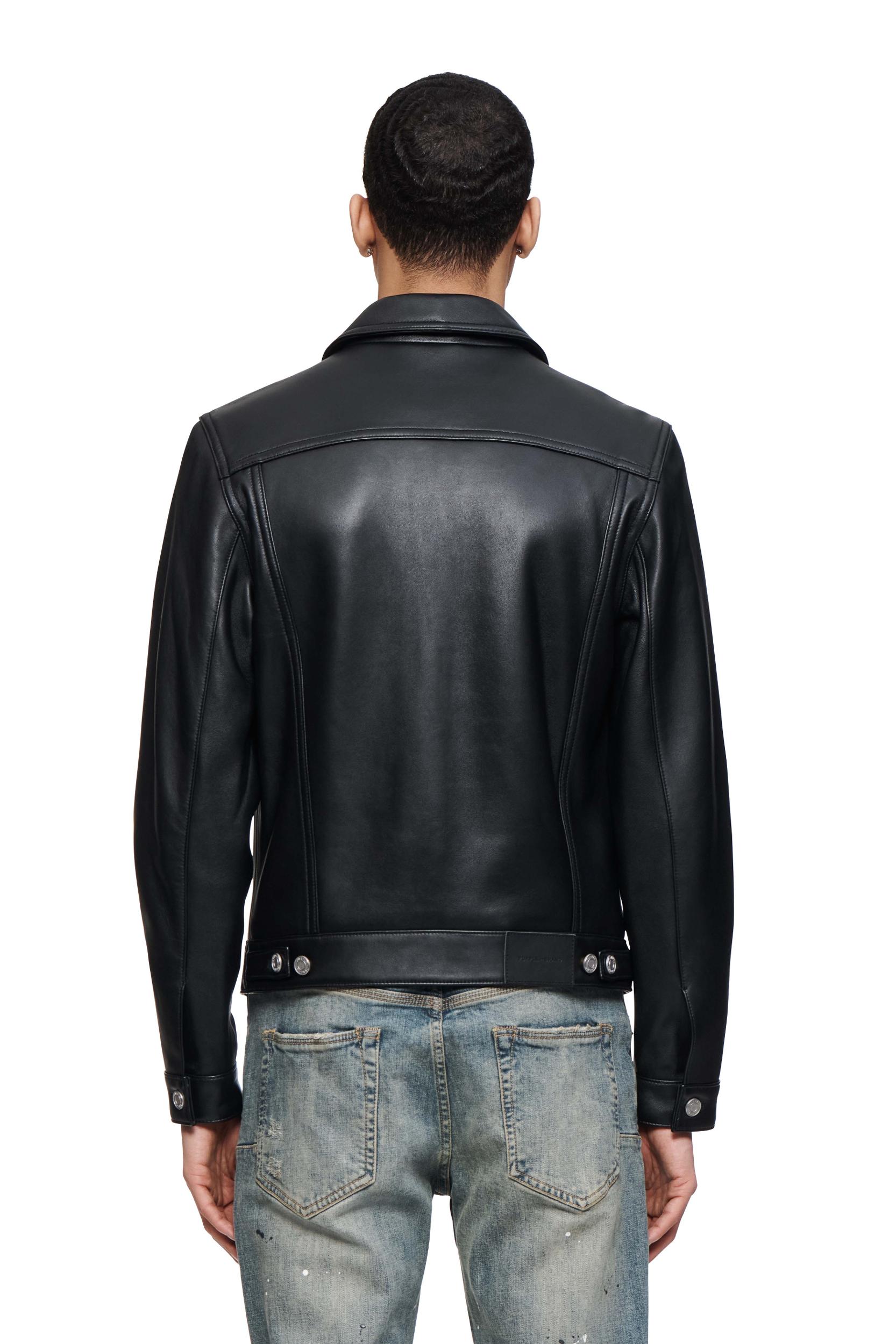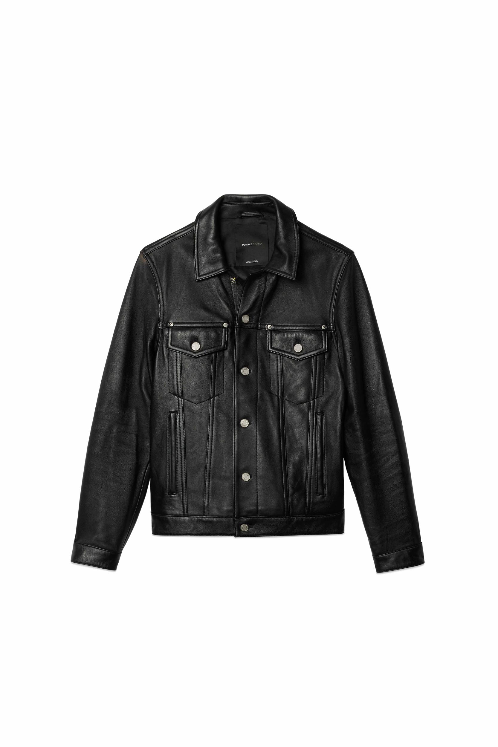 Cut from premium black leather, this trucker jacket is designed for a regular fit, with double flap pockets at the chest, double side pockets, adjustable cuffs and, in back, a custom Purple cowhide patch at the back of the hem. Fall Winter 2024 Black Label 100% Lamb Leather 26 1/2" Length, 20 1/4" Chest, 36" Sleeve Vivolo Patch