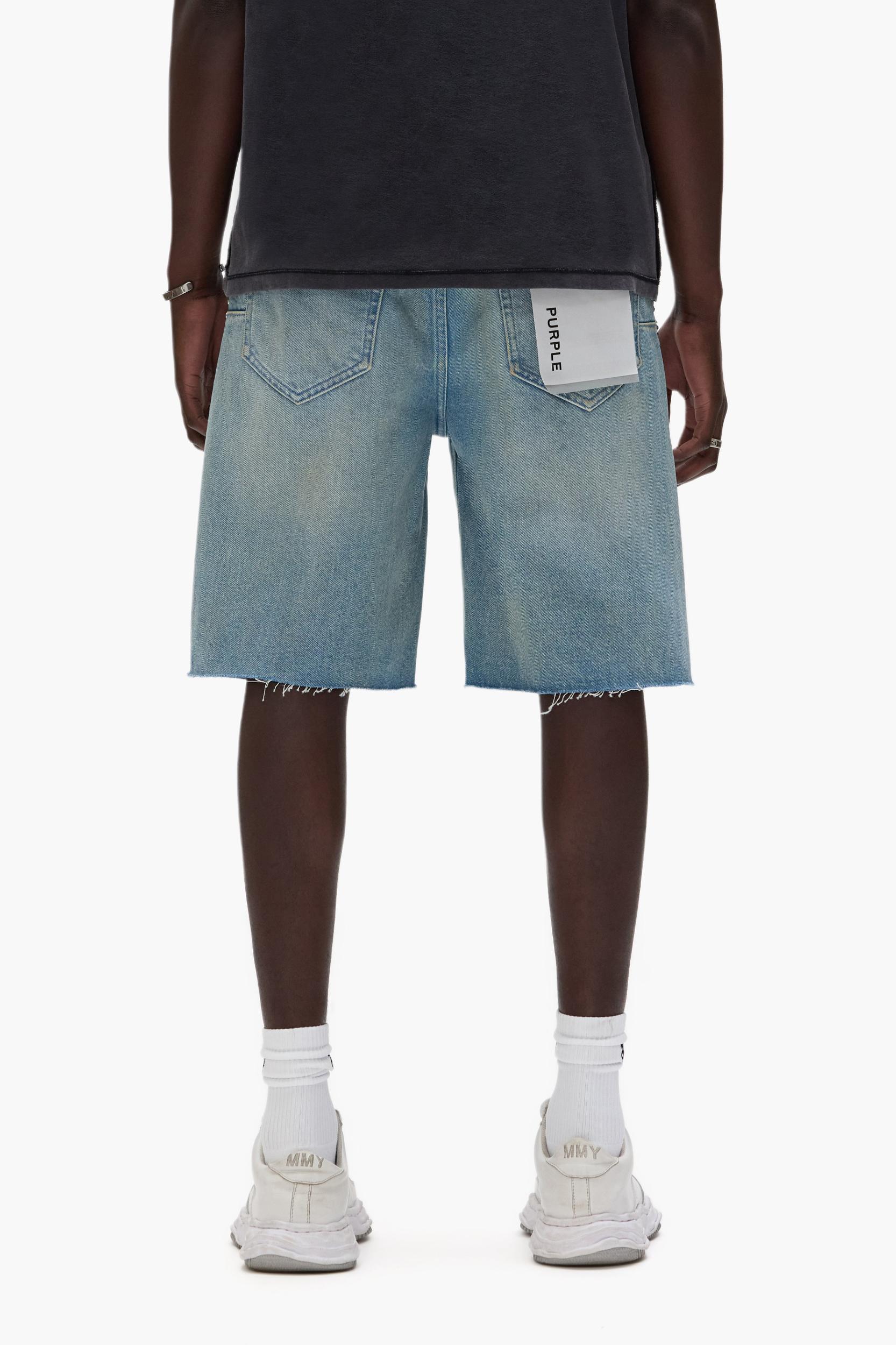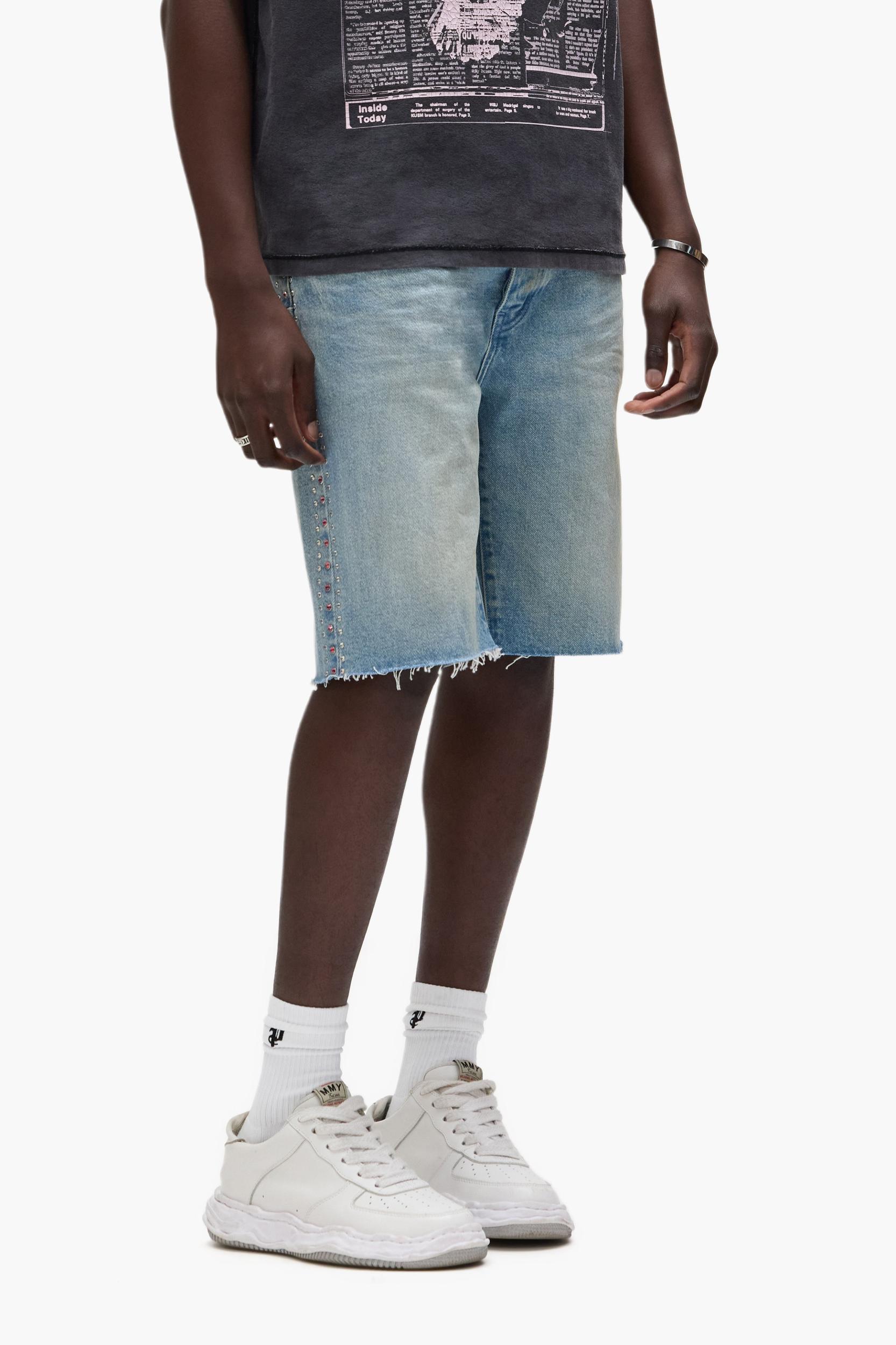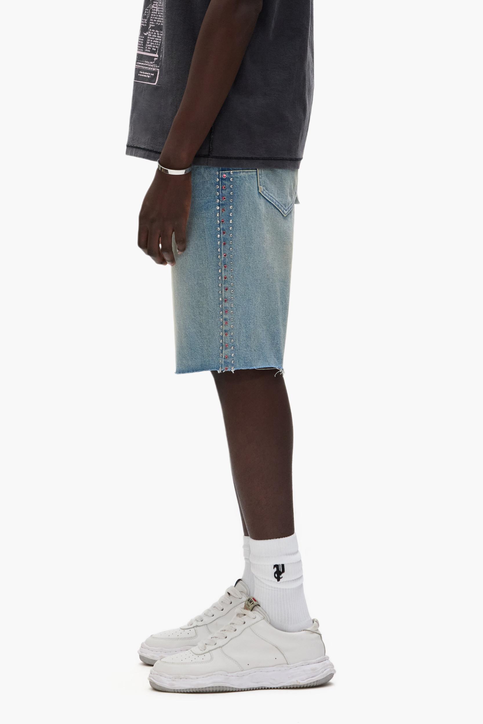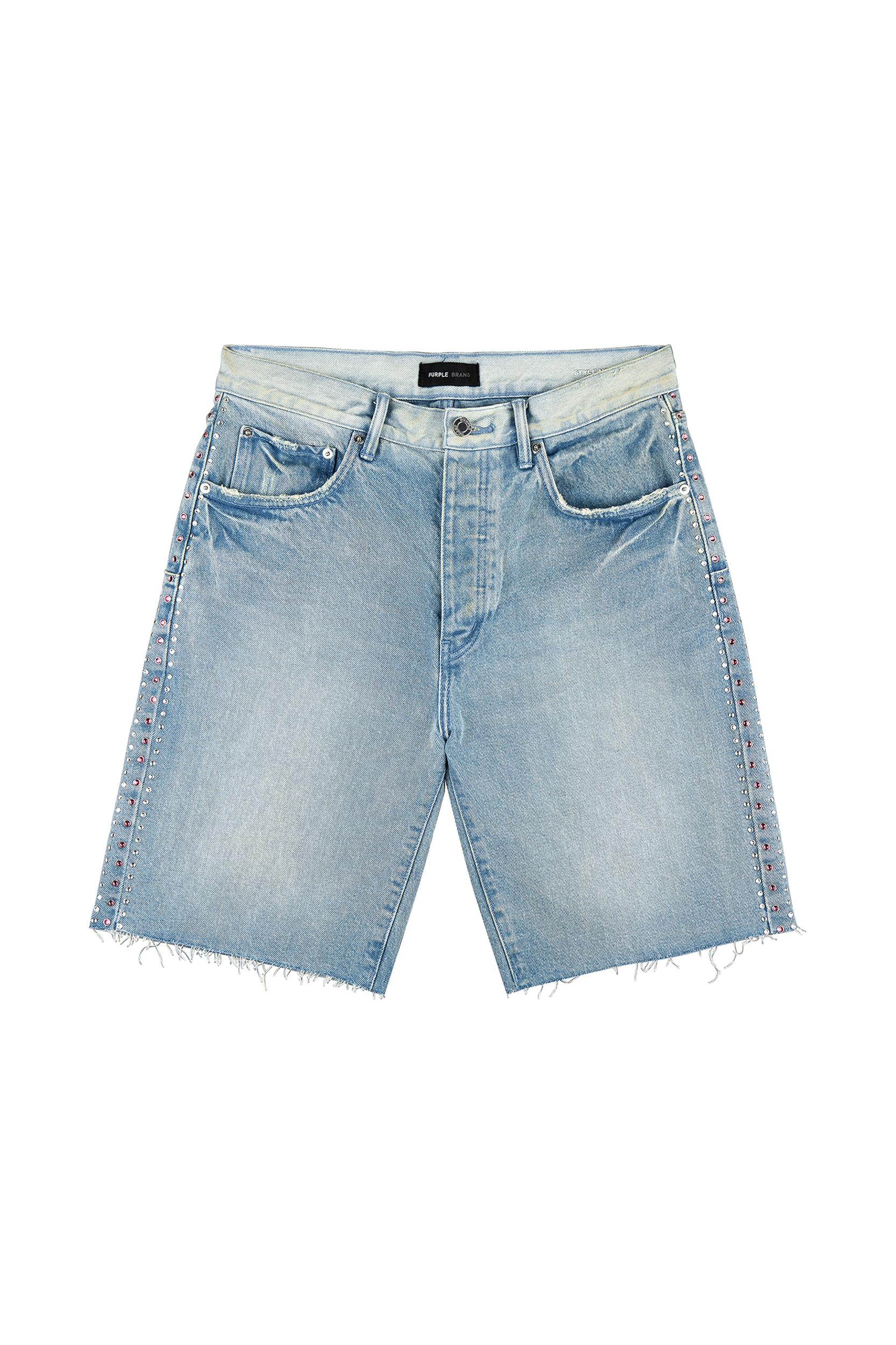 Crafted from light indigo premium stretch denim, these shorts three row crystals on the side seams. The style is detailed with reinforced belt loops and hidden back-pocket rivets for extra durability, cotton lining for a more comfortable fit, bar-tack stitching, a custom Purple cowhide leather patch and signature hang tag branding. Q1 2025 White Label 100% Cotton Relaxed Fit 5 Pocket Styling Button Fly