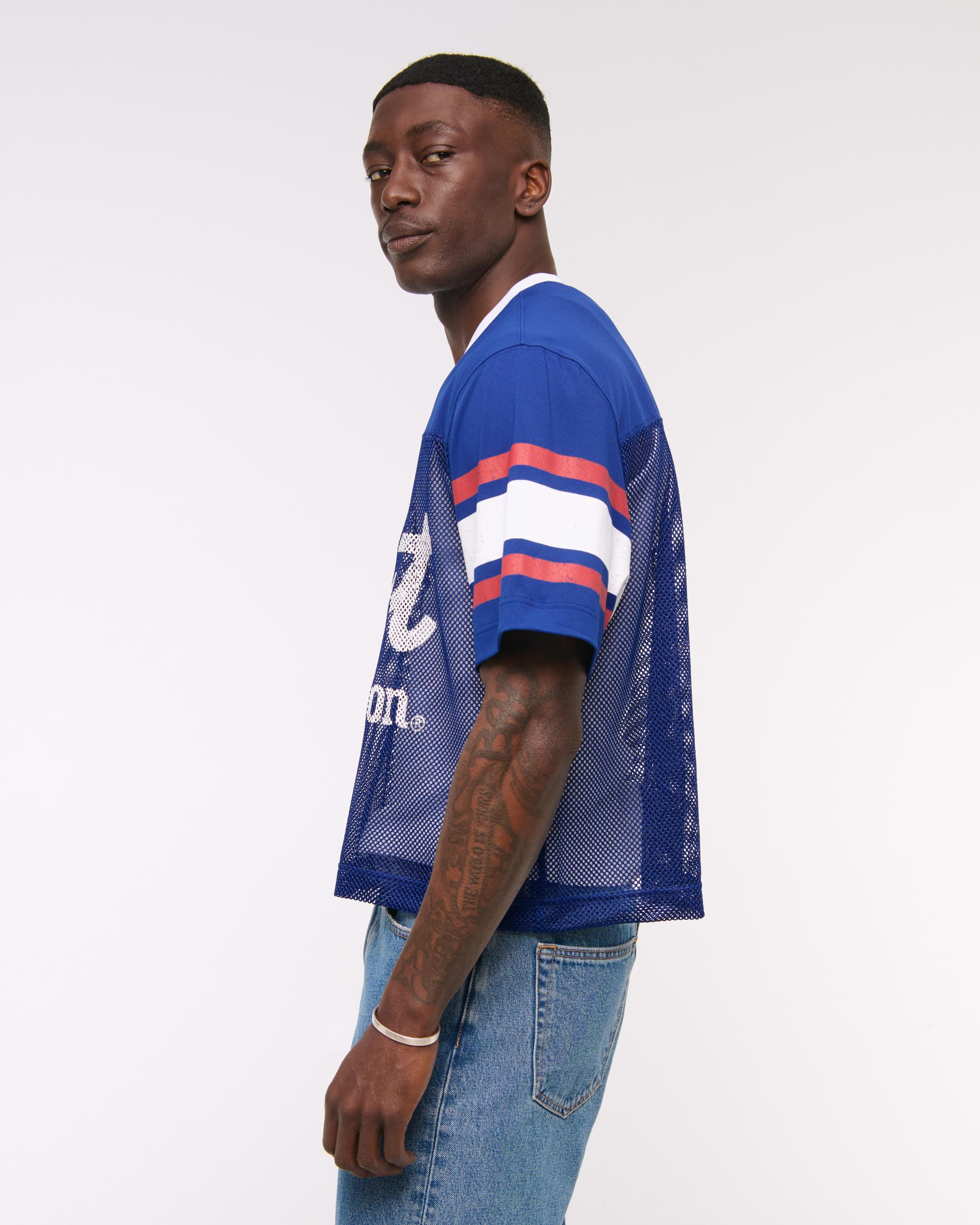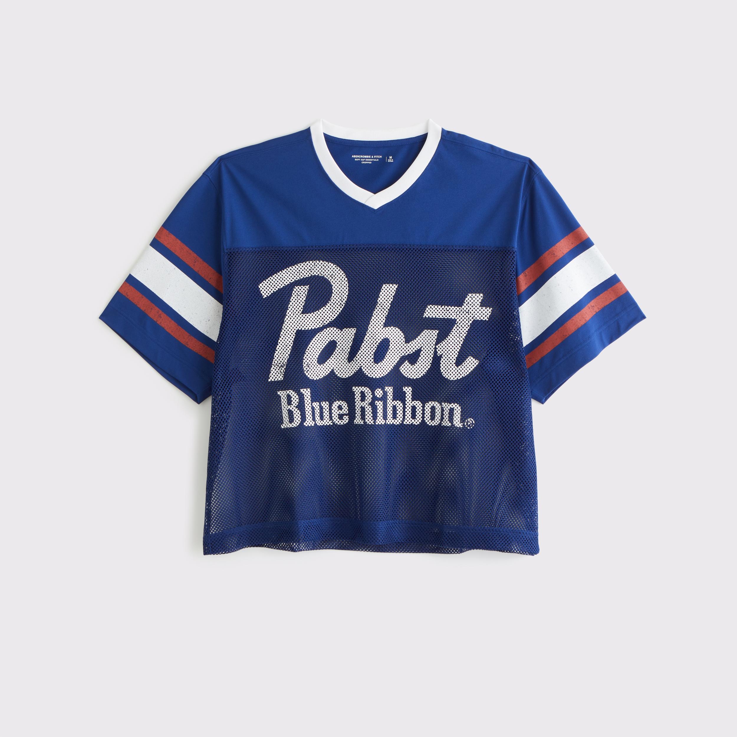 Our new short-sleeve football jersey-inspired tee in a soft mesh fabric, with a more oversized-fit silhouette in width and sleeve length and a subtle cropped length. Features Pabst Blue Ribbon-inspired graphic detail at chest and v-neckline.