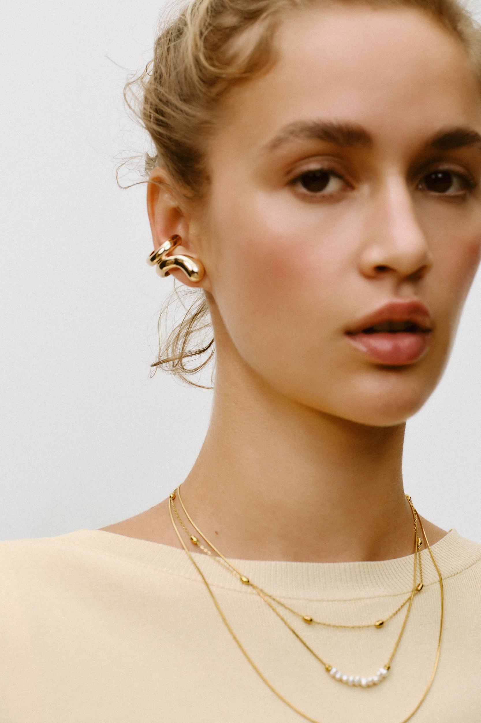 Pack of two earrings: - Embossed metal earring. Butterfly closure. - Embossed metal earcuff earring.