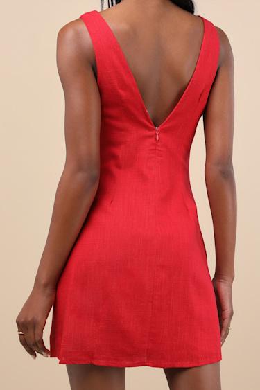 Grab your passport, a sunhat, and the Packing for Positano Red Linen Sleeveless Mini Dress because an overseas adventure is calling for you! This lightweight woven linen-blend dress begins with a flattering V-neck and back, wide straps, and a darted bodice. Shift silhouette continues down to a mini hem. Hidden back zipper/clasp.