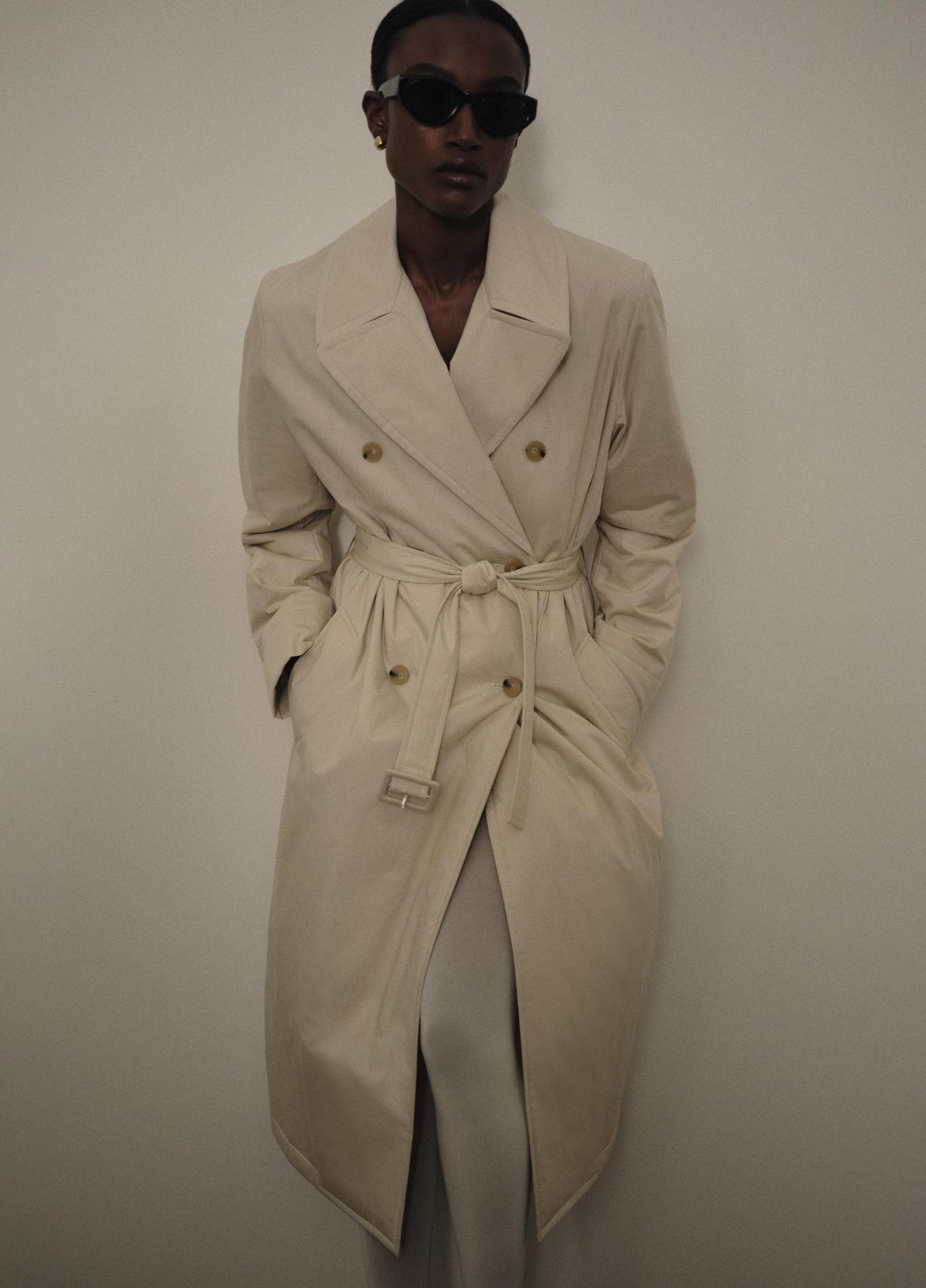 Lightly padded for the perfect transitional weight, our elongated cotton coat is finished with all the classic trench details like a double-breasted front, notched lapels and belted waist.
