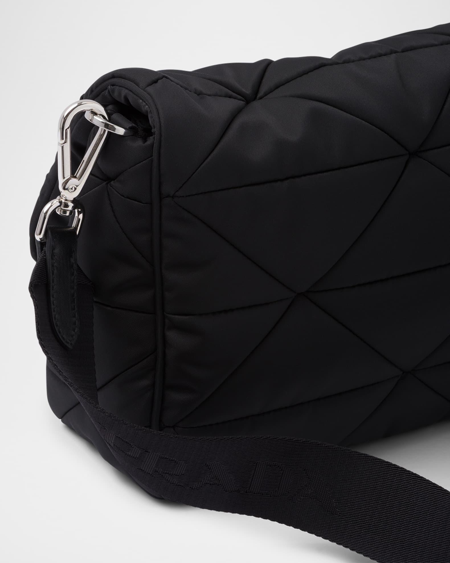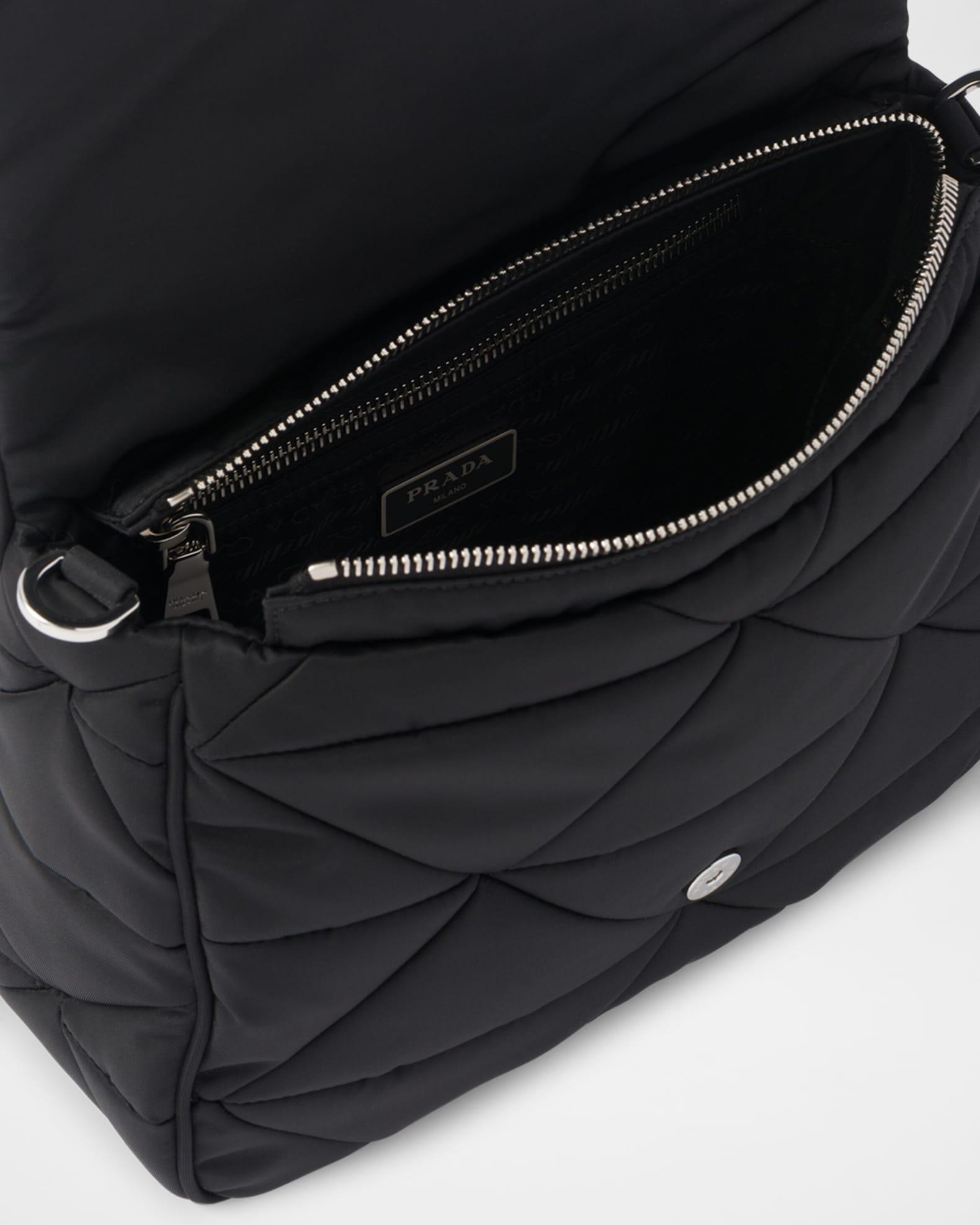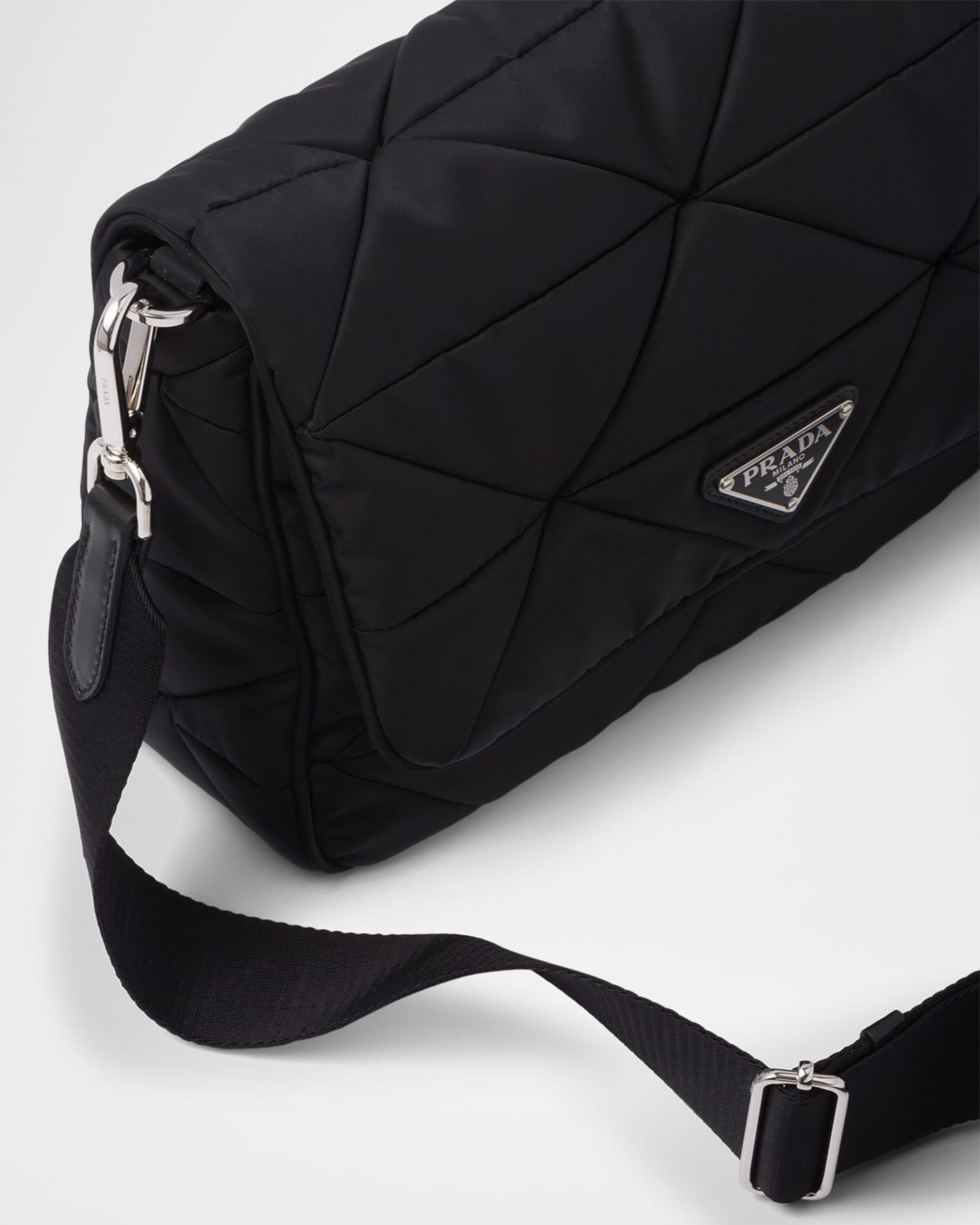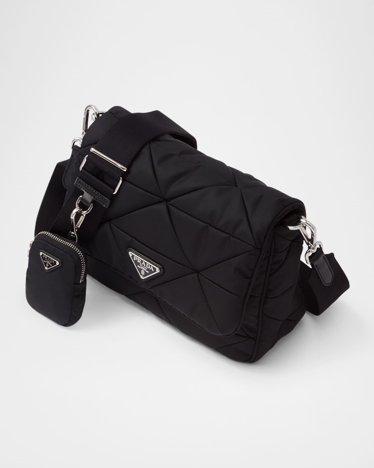 Prada padded shoulder bag in Re-Nylon features a patchwork reinterpretation of the iconic triangle logo Detachable, adjustable woven tape shoulder strap Removable Re-Nylon zipper pouch Flap top with magnetic snap closure and top zipper Signature enameled metal triangle logo Logo-print Re-Nylon lining Interior, one zip pocket and one slip pocket Approx. 6.9"H x 9.4"W x 3.3"D Imported