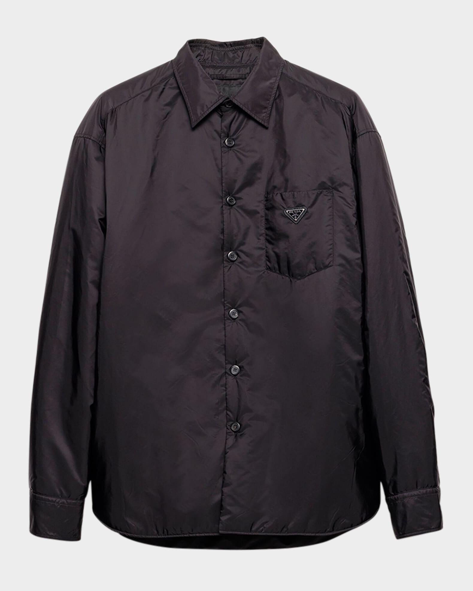 Prada padded Re-Nylon shirt featuring an enameled metal triangle logo and folds created through a pressing process Approx. 29.9"L from shoulder to hem Point collar; button front Long sleeves; button cuffs Chest patch pocket Relaxed fit Shirttail hem Recycled nylon/polyamide Imported