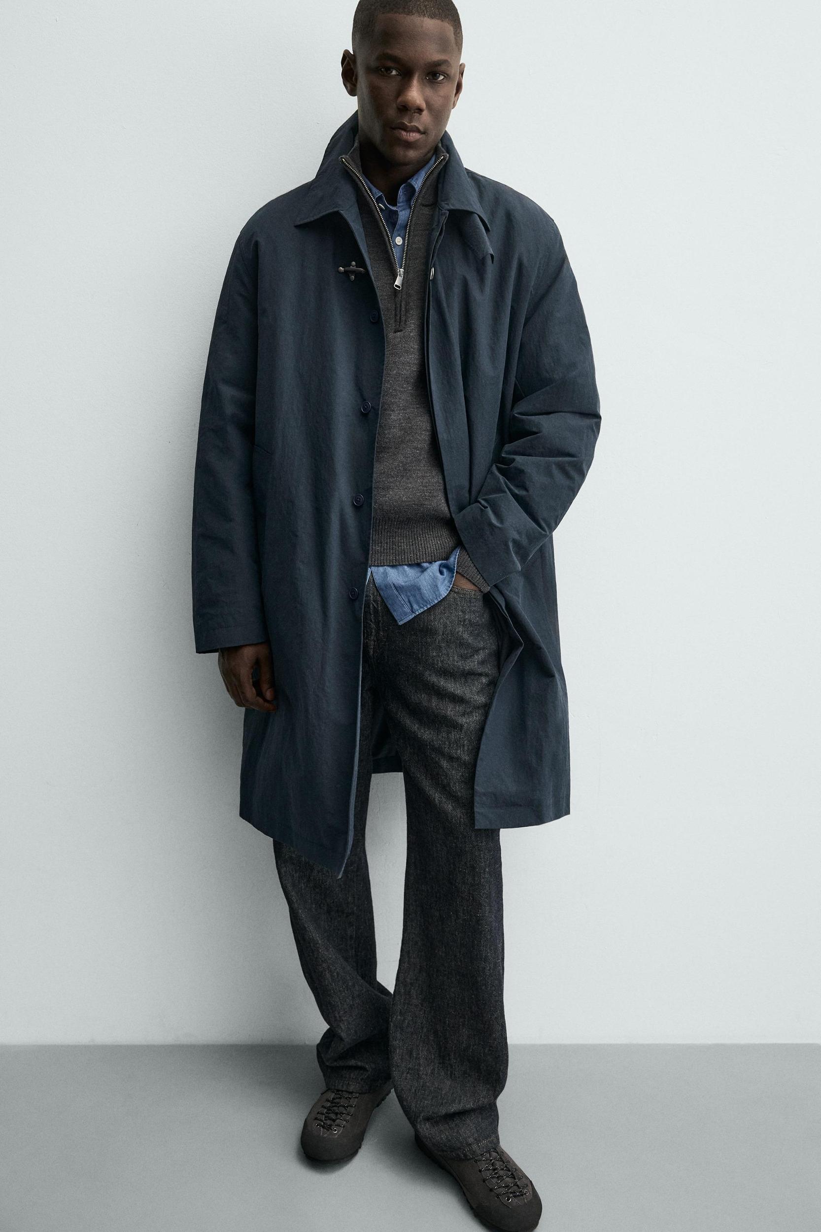 Regular fit trench coat made of technical fabric with a lightly padded interior. Lapel collar and long sleeves. Welt pockets at the hip and an interior pocket detail. Hem with a central back vent. Front hidden zip closure with a flap and metallic fireman clasp.