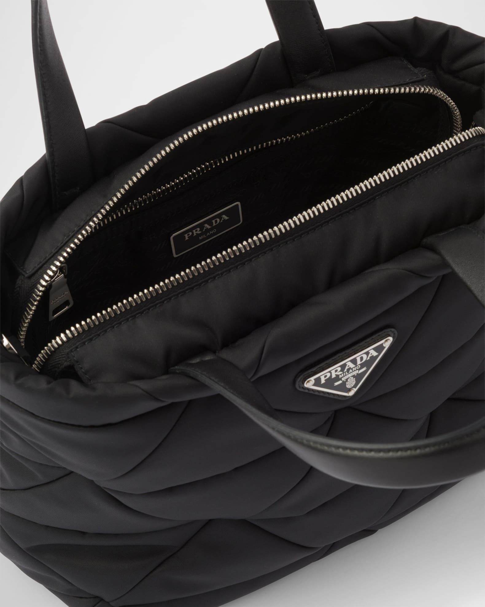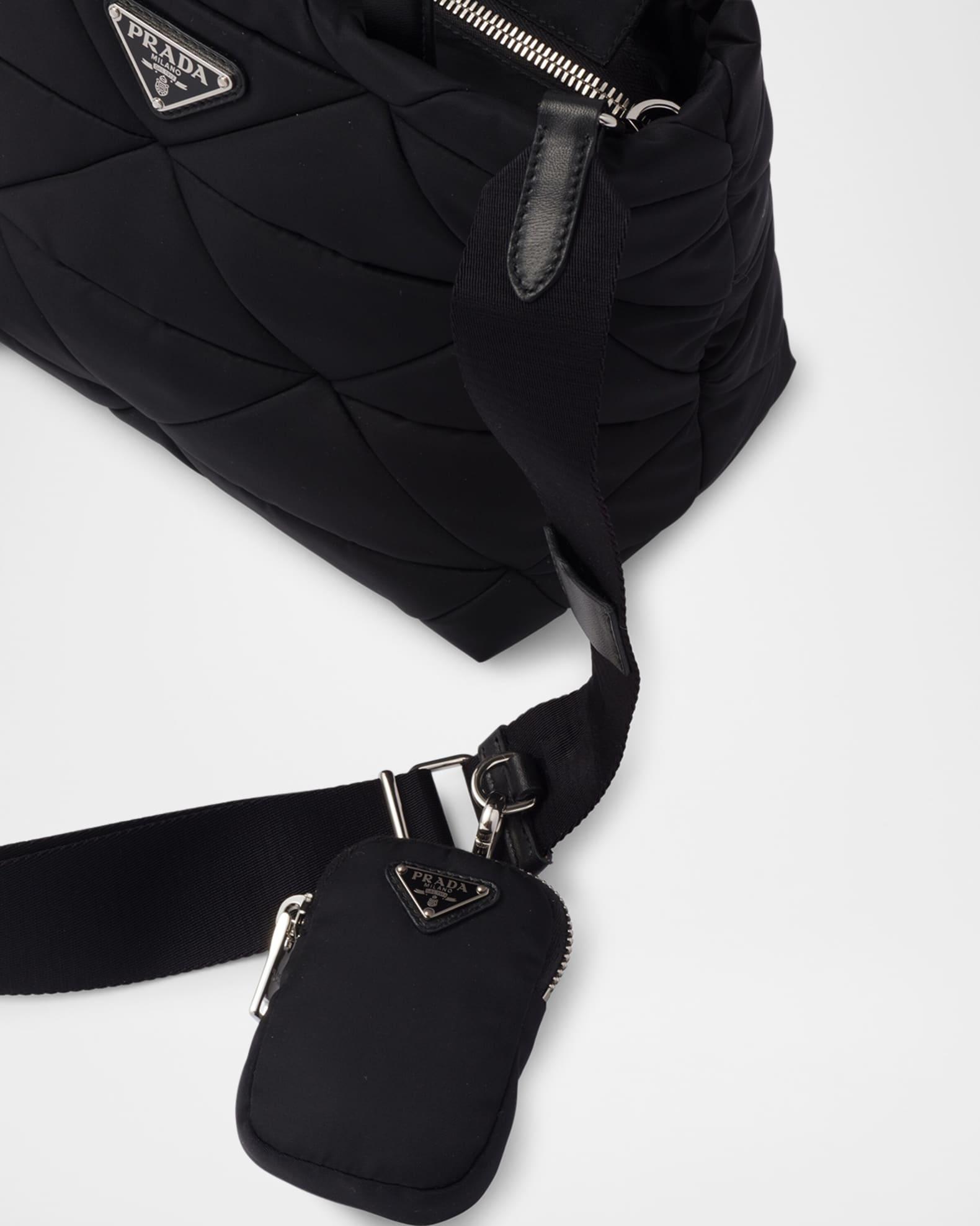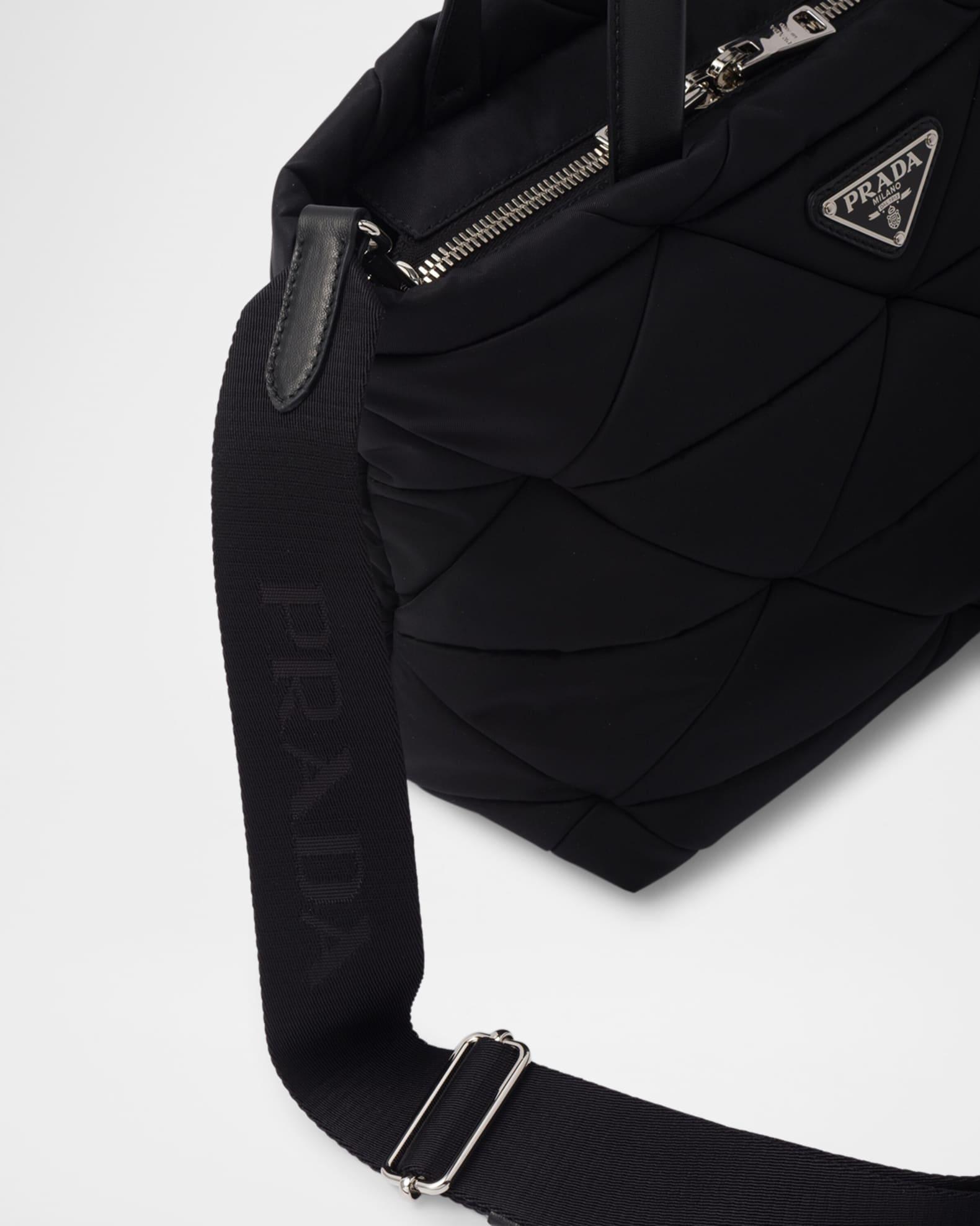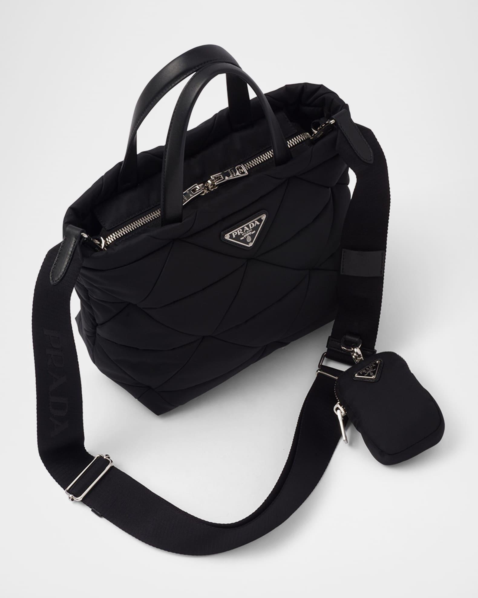 Prada tote bag in Re-Nylon, quilted in the iconic triangle design reinterpreted in a patchwork motif Nappa leather top handles Detachable, adjustable logo-print nylon crossbody strap, 37.4" drop Can be worn as a top handle or crossbody bag Removable Re-Nylon zipper pouch Two-way zip top closure Signature enameled metal triangle logo Logo-print Re-Nylon lining Interior, one zip pocket and one slip pocket Approx. 8.3"H x 9.4"W x 5.1"D Imported
