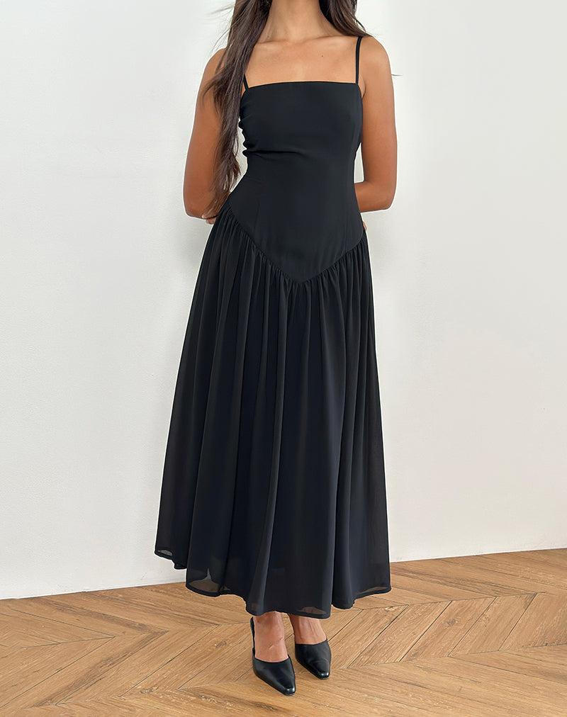 The Paduri dress in chiffon black features thin shoulder straps, a square neckline and drop waistline. Complete with a flowy midi length. MODEL WEARS SIZE: EXTRA SMALL - MODEL HEIGHT:5'7