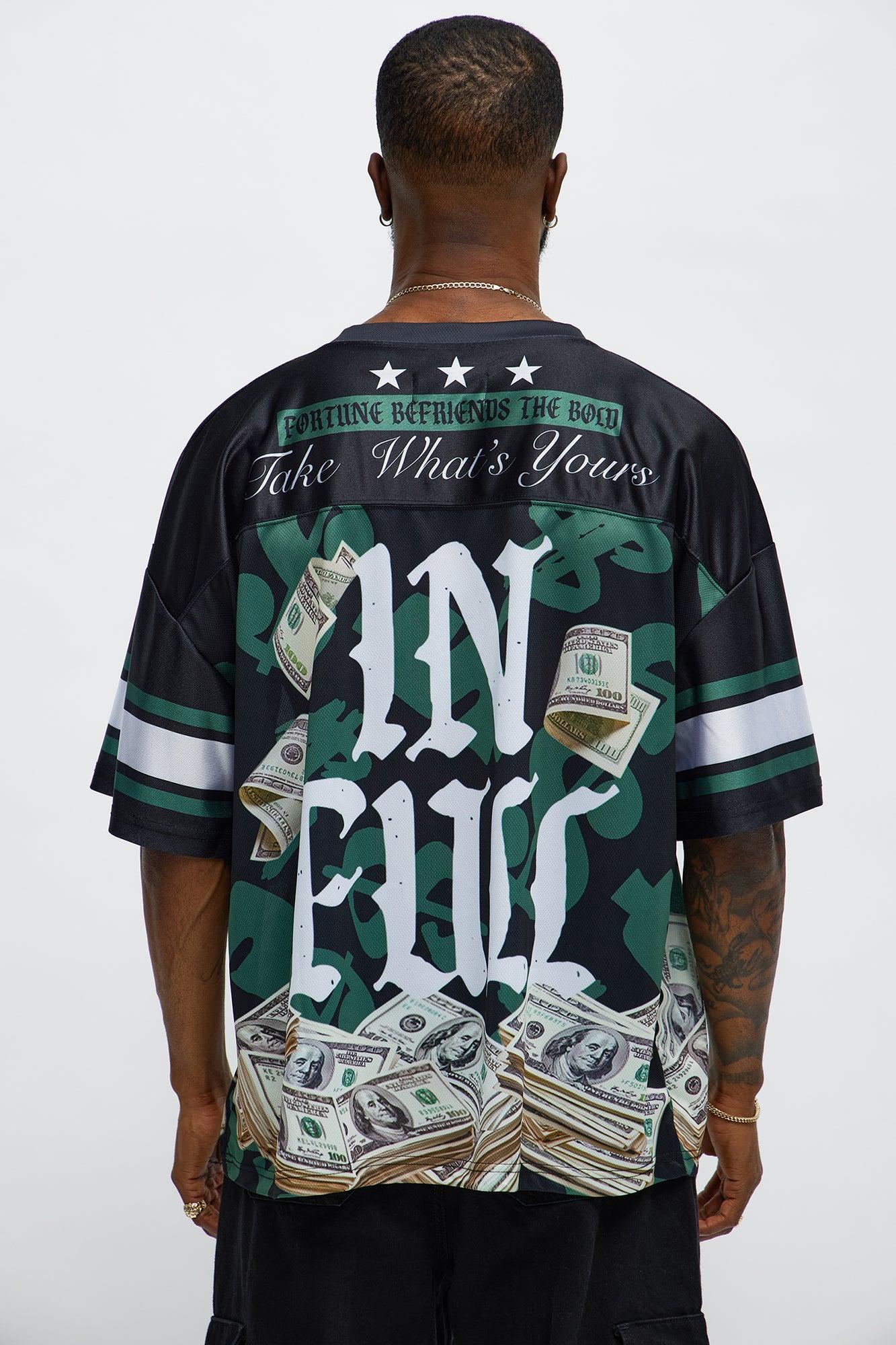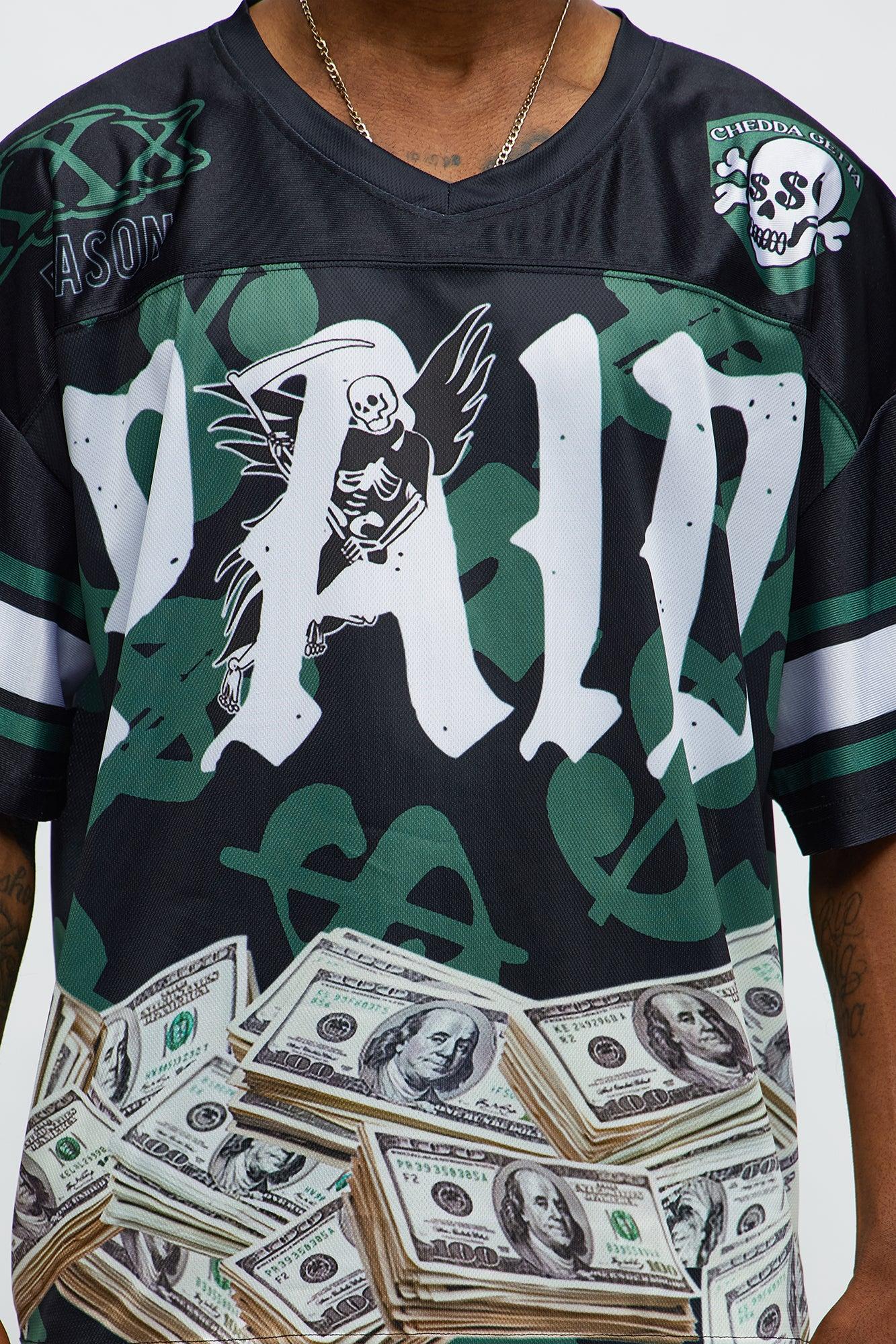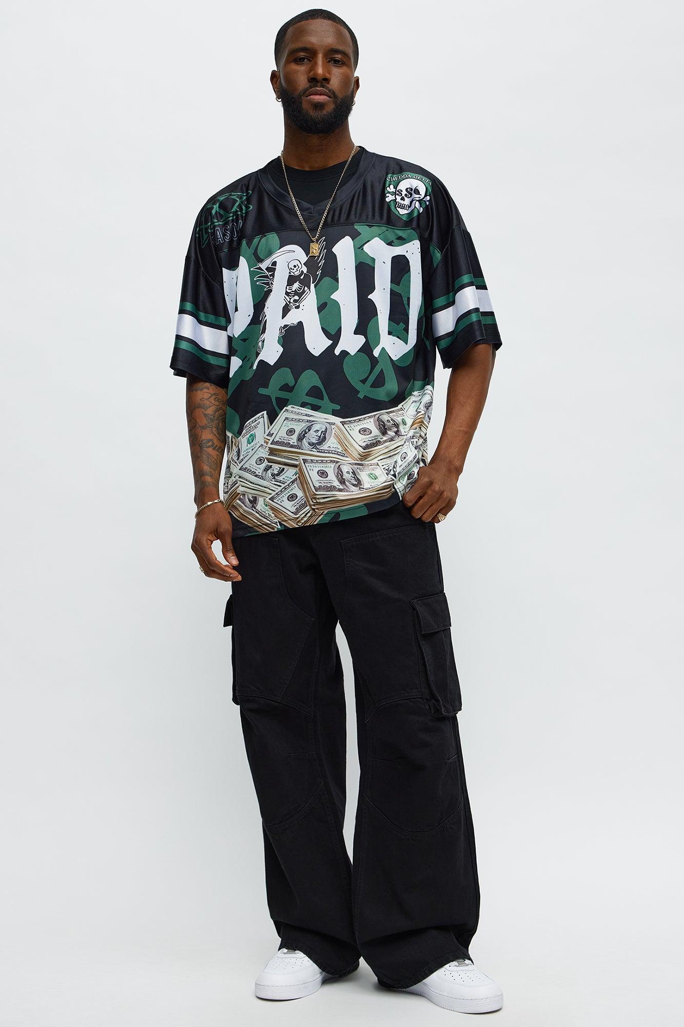 Available In Black/combo. V-Neck Front "Paid" Money Graphic Details Back "In Full" Graphic Details Printed Money Details Contrast Trim Striped Sleeve Details Short Sleeves Disclaimer: Due To The Printing Process A Difference In Saturation May Occur. Each Garment Is Unique. 100% Polyester Imported