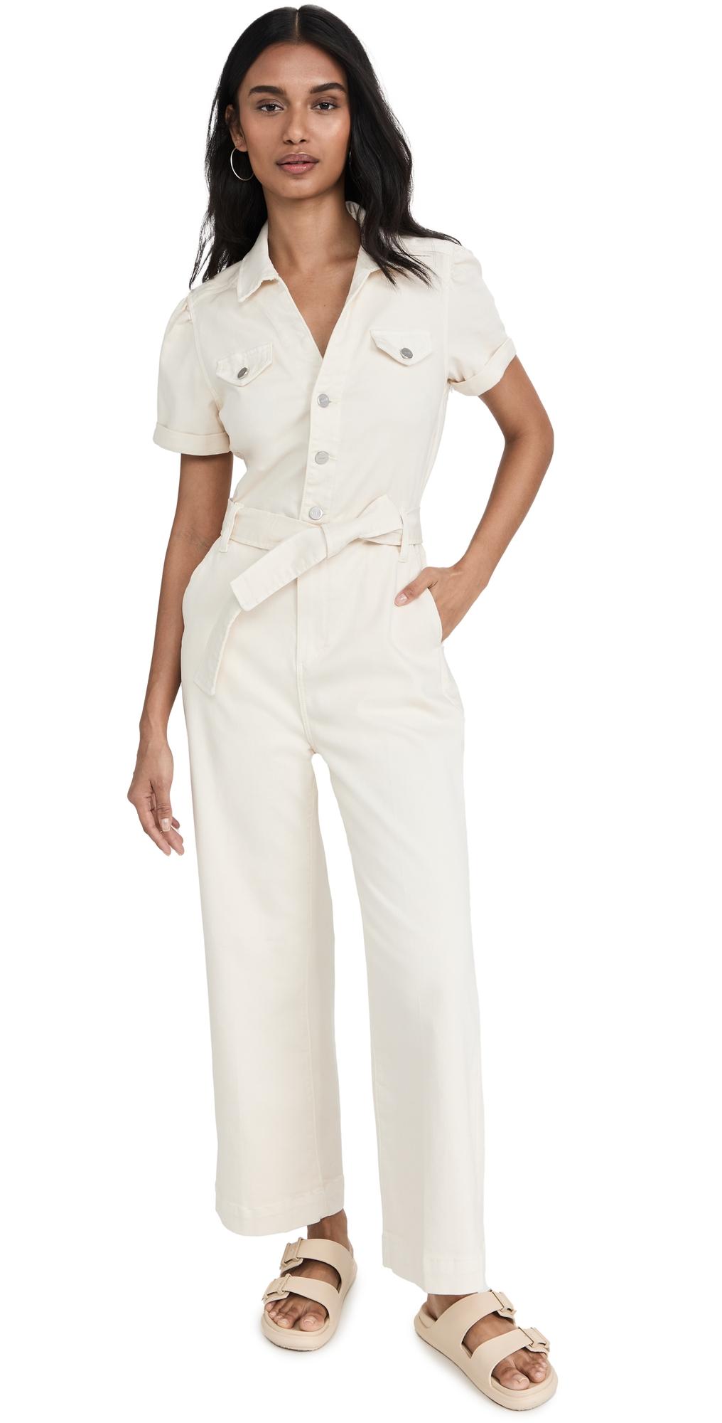 Whatever youve got planned for the day, this tailored yet easygoing belted jumpsuit will let you fulfill your mission in utilitarian comfort. Spread collar Short sleeves 57% cotton, 34% rayon, 6% elasterell-p, 3% Lycra spandex Dry clean Imported
