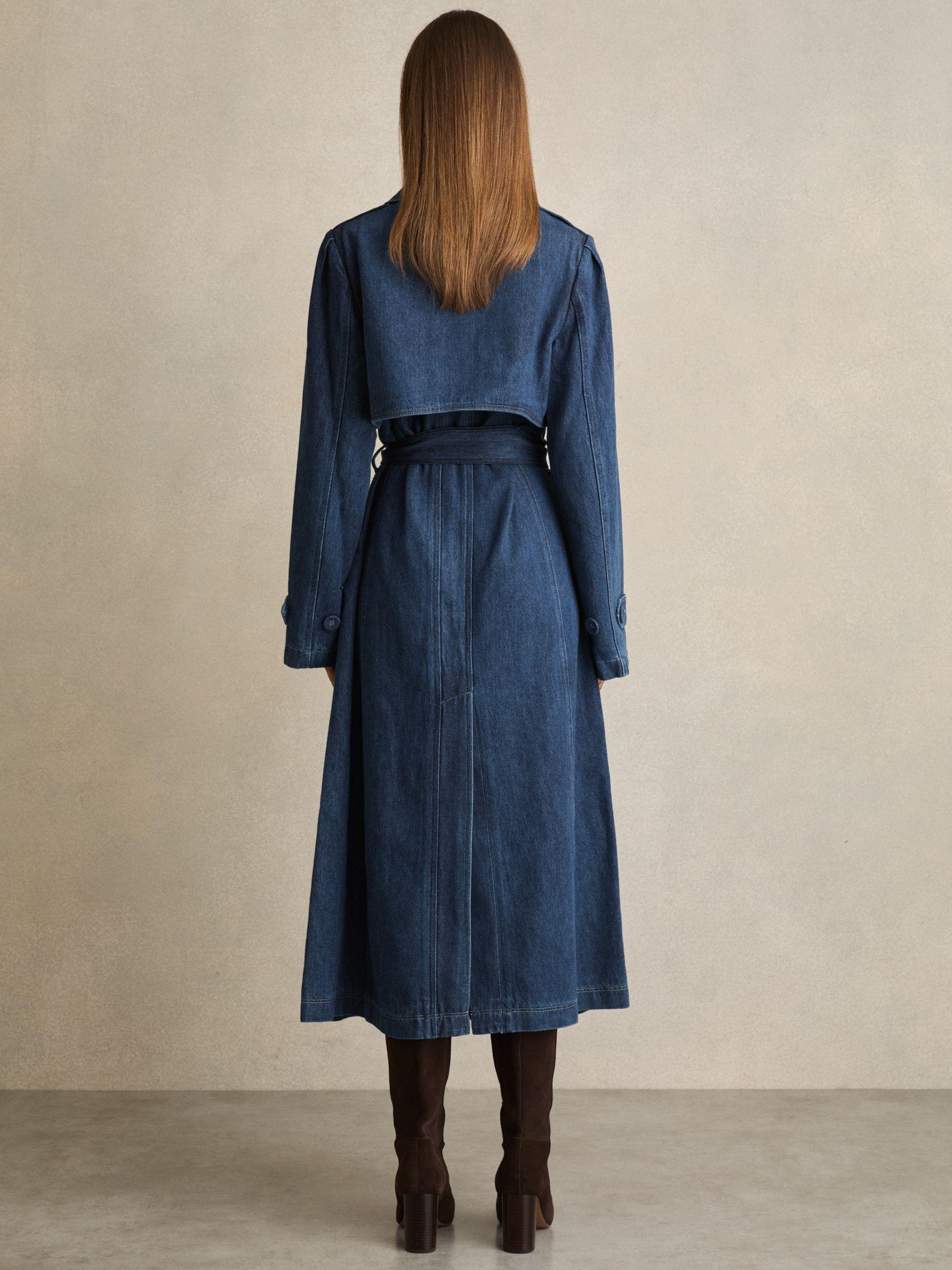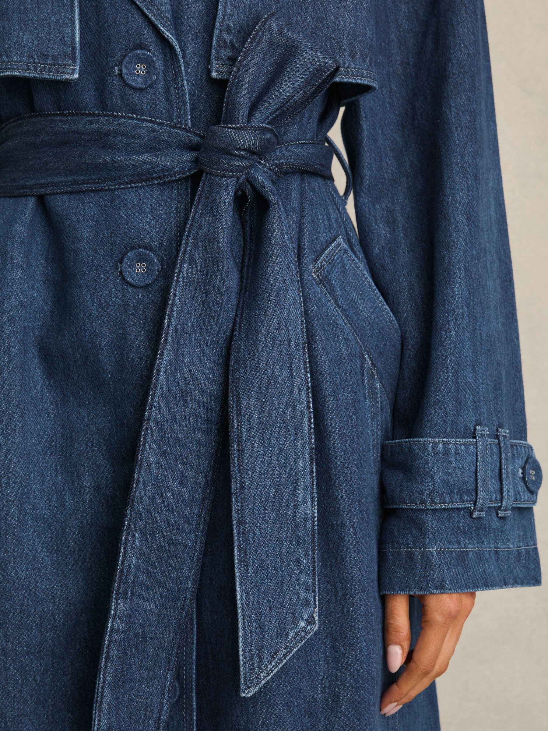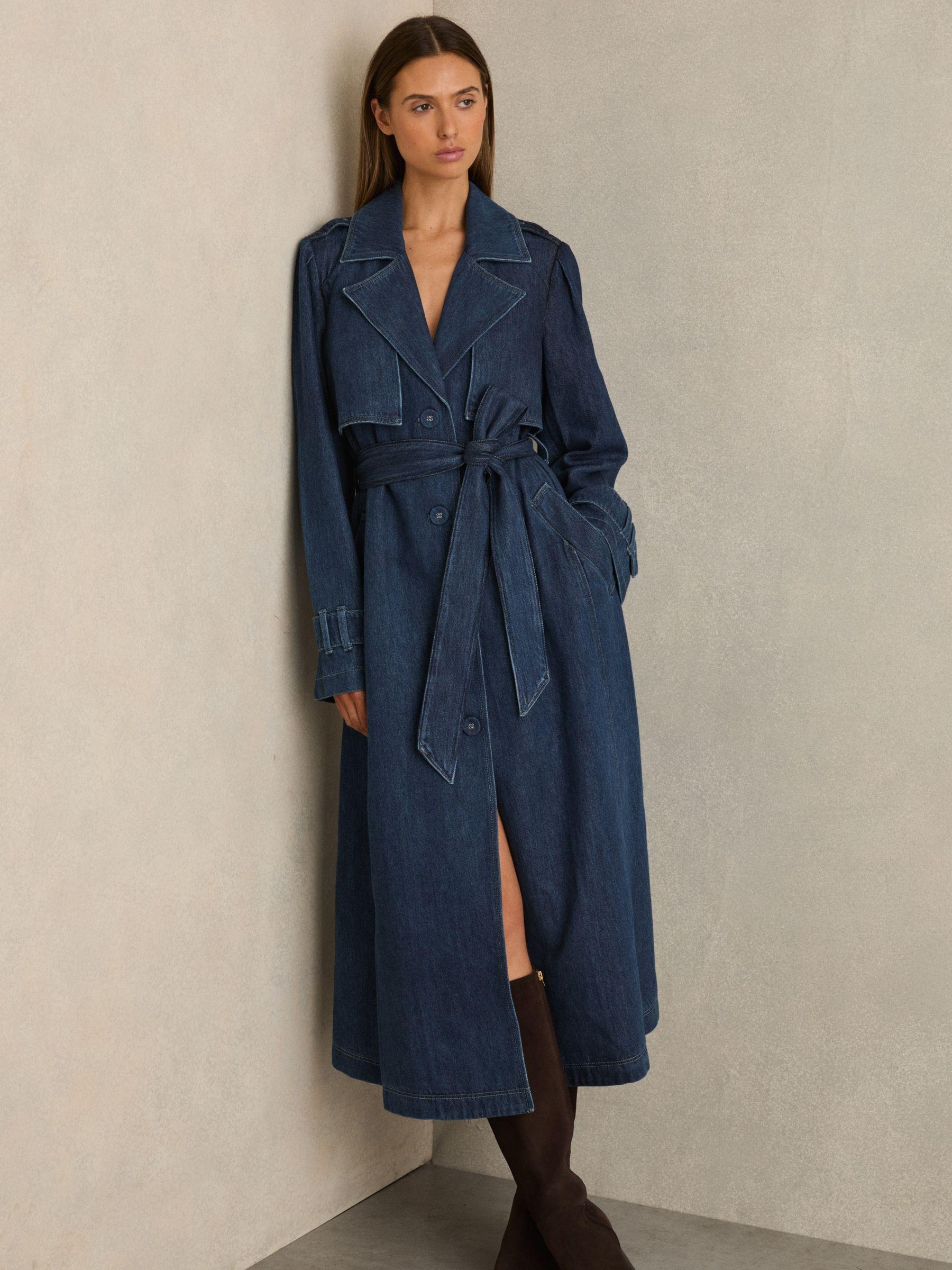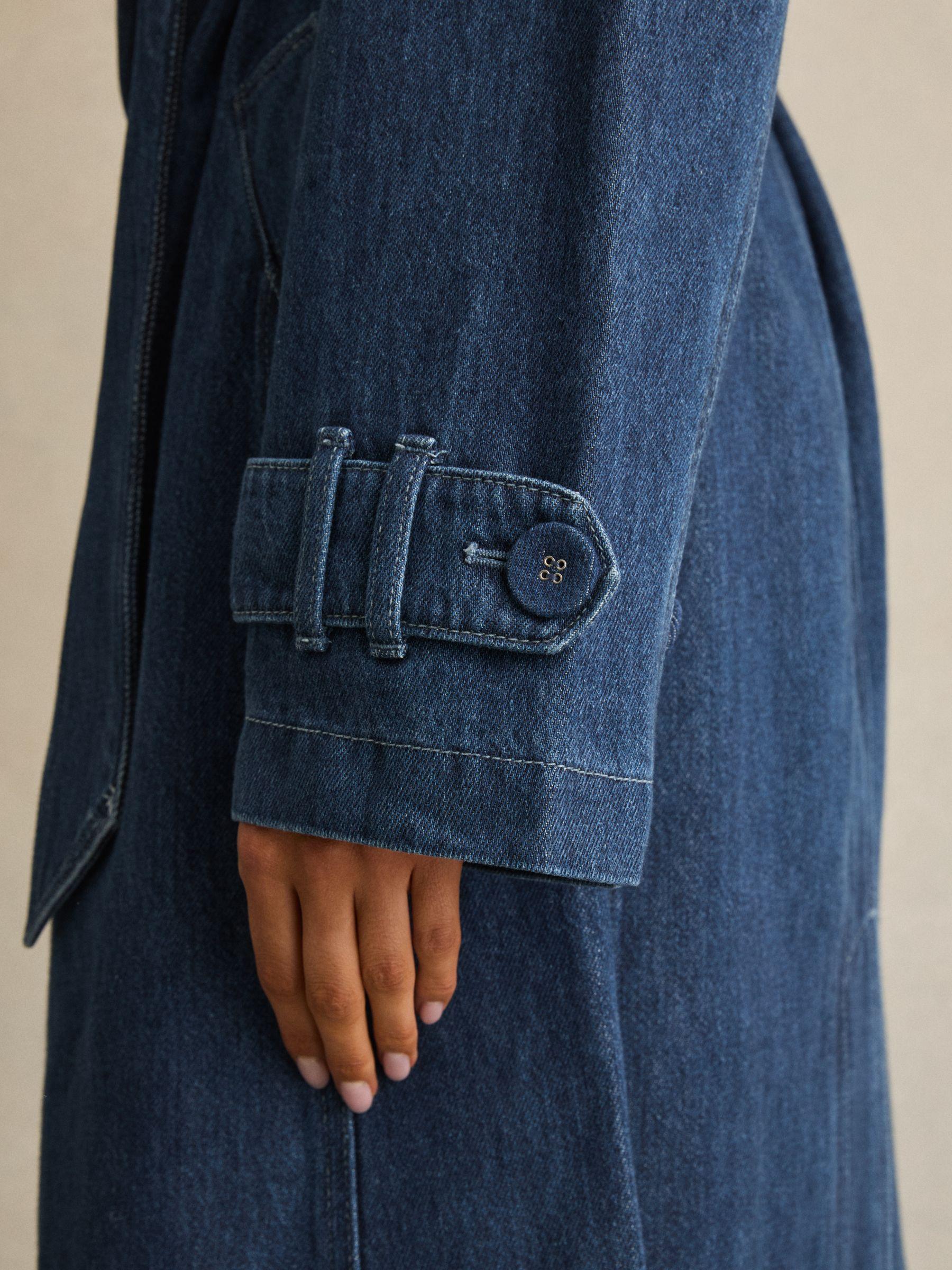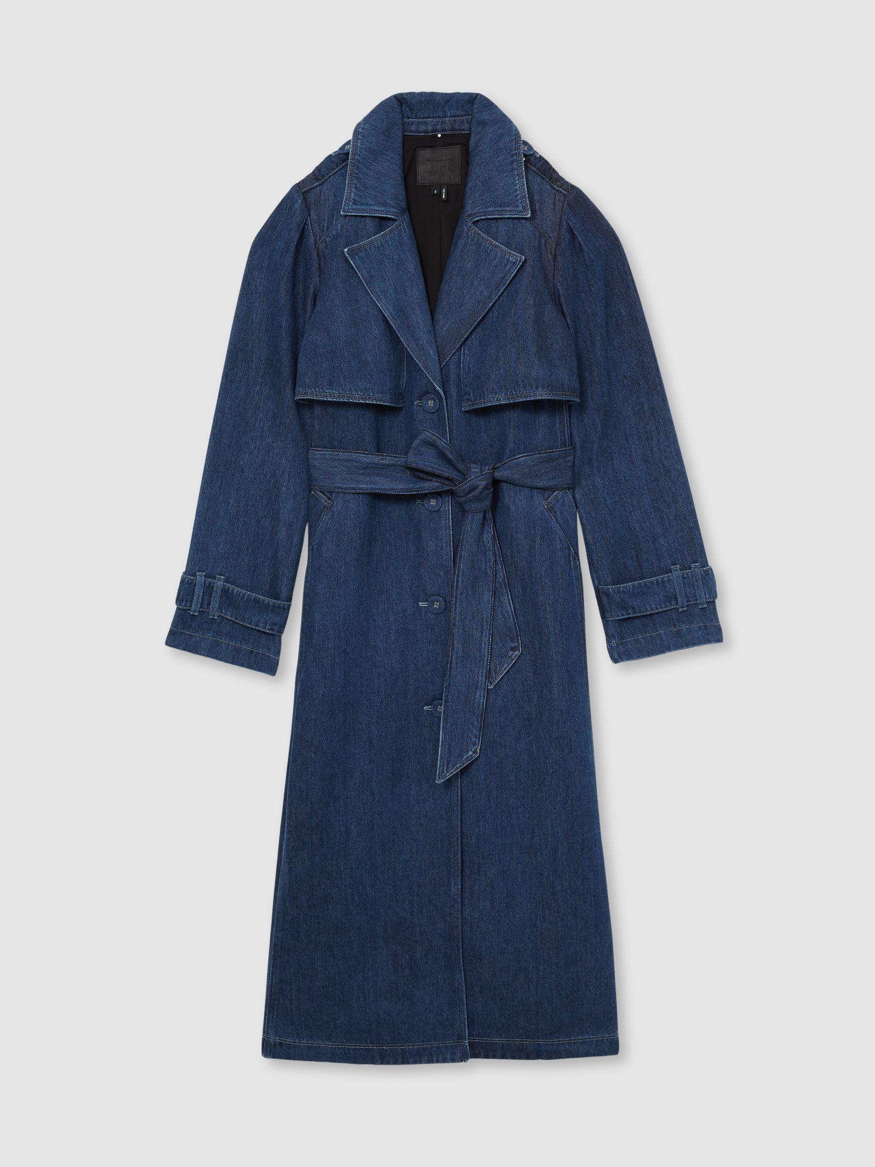 The Raina trench coat offers a modern twist on a timeless silhouette, crafted from cotton-lyocell denim. The single-breasted layer retains classic trench details such as storm flaps and cuff straps, enhanced by self-covered buttons and a coordinating self-tie belt. Cotton-lyocell denim Storm flaps Notch lapels Self-tie belt Self-cover buttons Single vent to reverse Paige applies fabric technology, expert fit know-how and a Los Angeles style sensibility to create unique denim wear and lifestyle garments with enduring appeal.