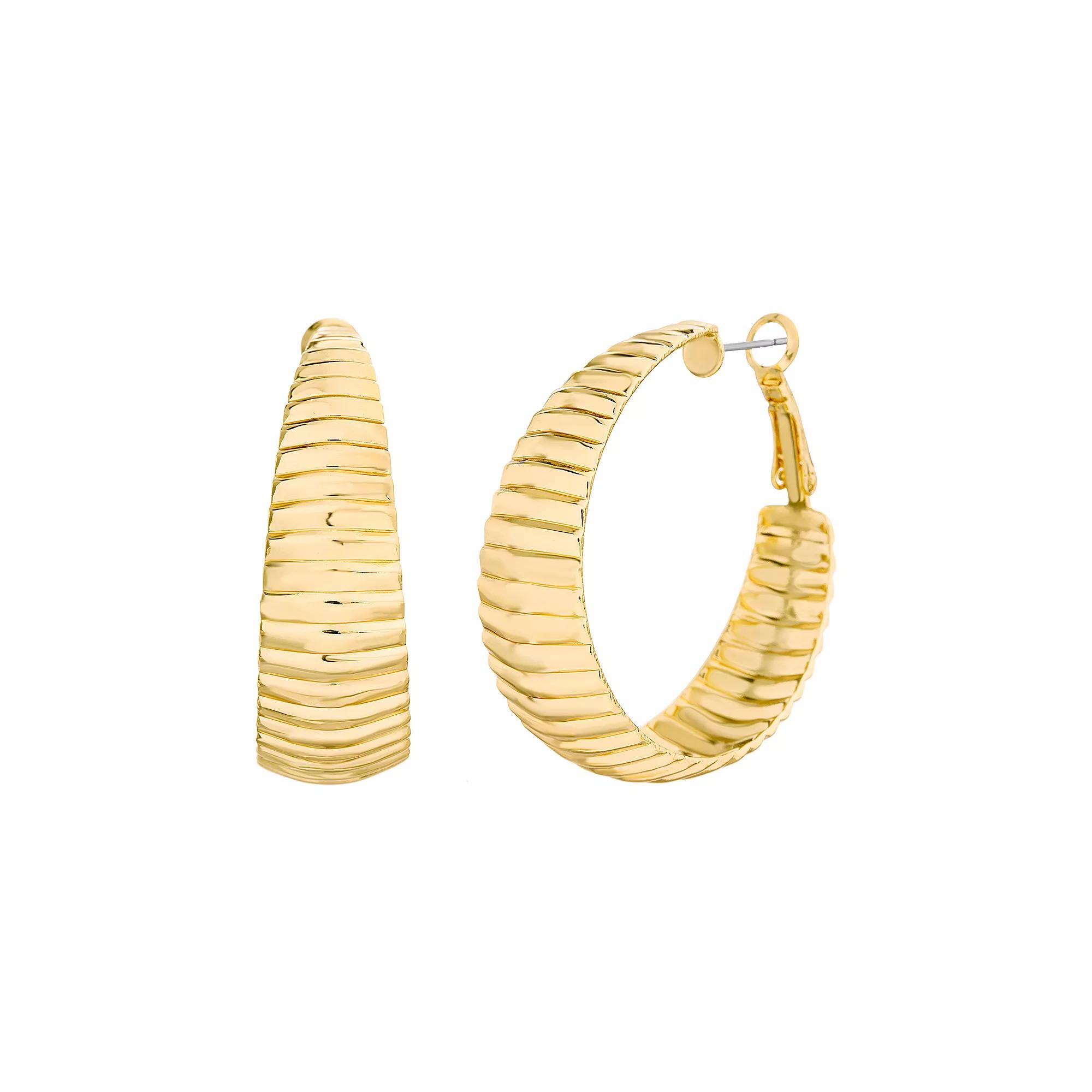 Finish off your ensemble in eco-friendly style with these 14k gold over recycled brass Paige Harper textured hoop earrings. Finish off your ensemble in eco-friendly style with these 14k gold over recycled brass Paige Harper textured hoop earrings. Diameter: 44mm Backings: click-it Nickel free Metal: 100% recycled brass Plating: 14k gold Finish: polished Packaging: boxedSUSTAINABILITY FEATURES Contains recycled materials Size: One Size. Color: Multicolor. Gender: female. Age Group: adult.