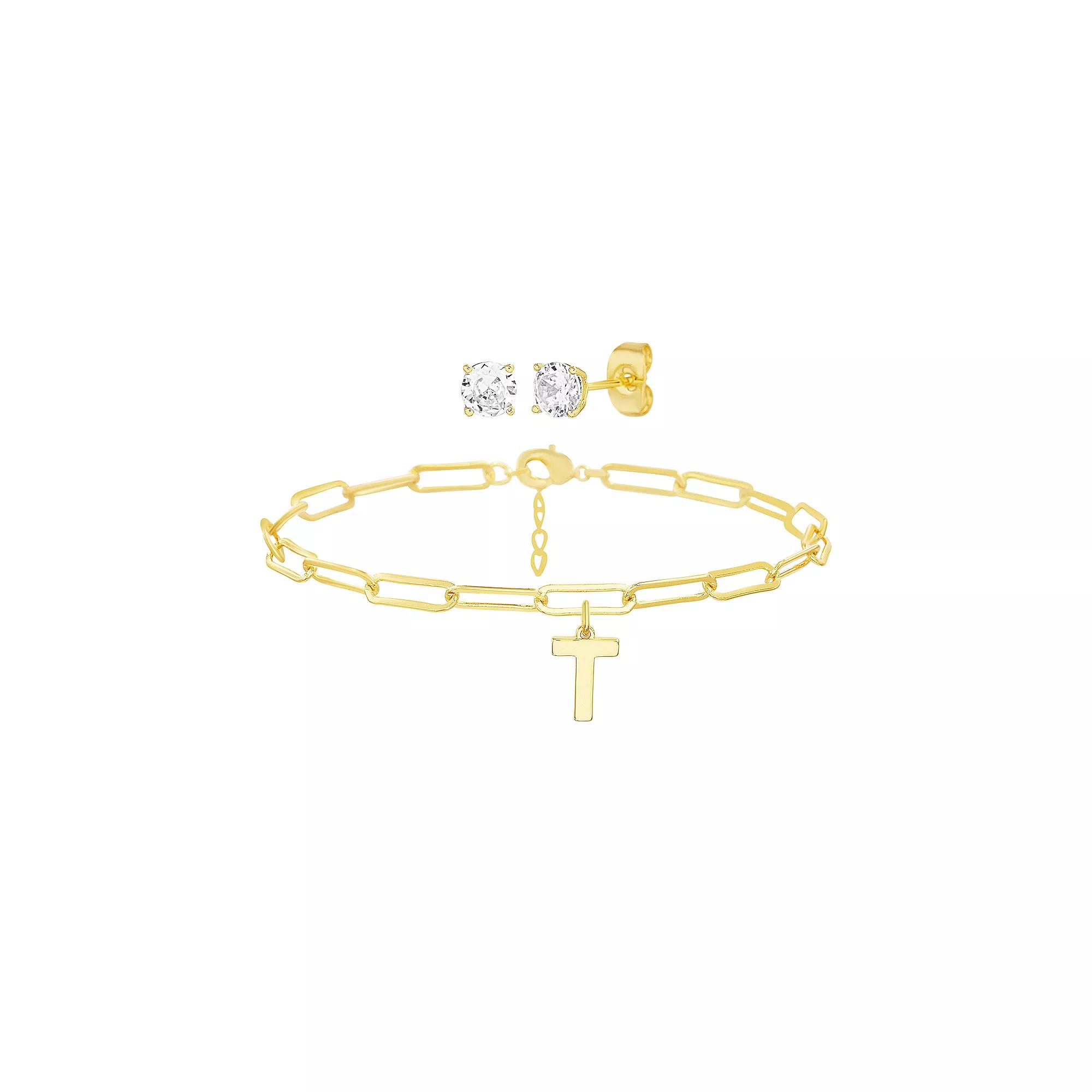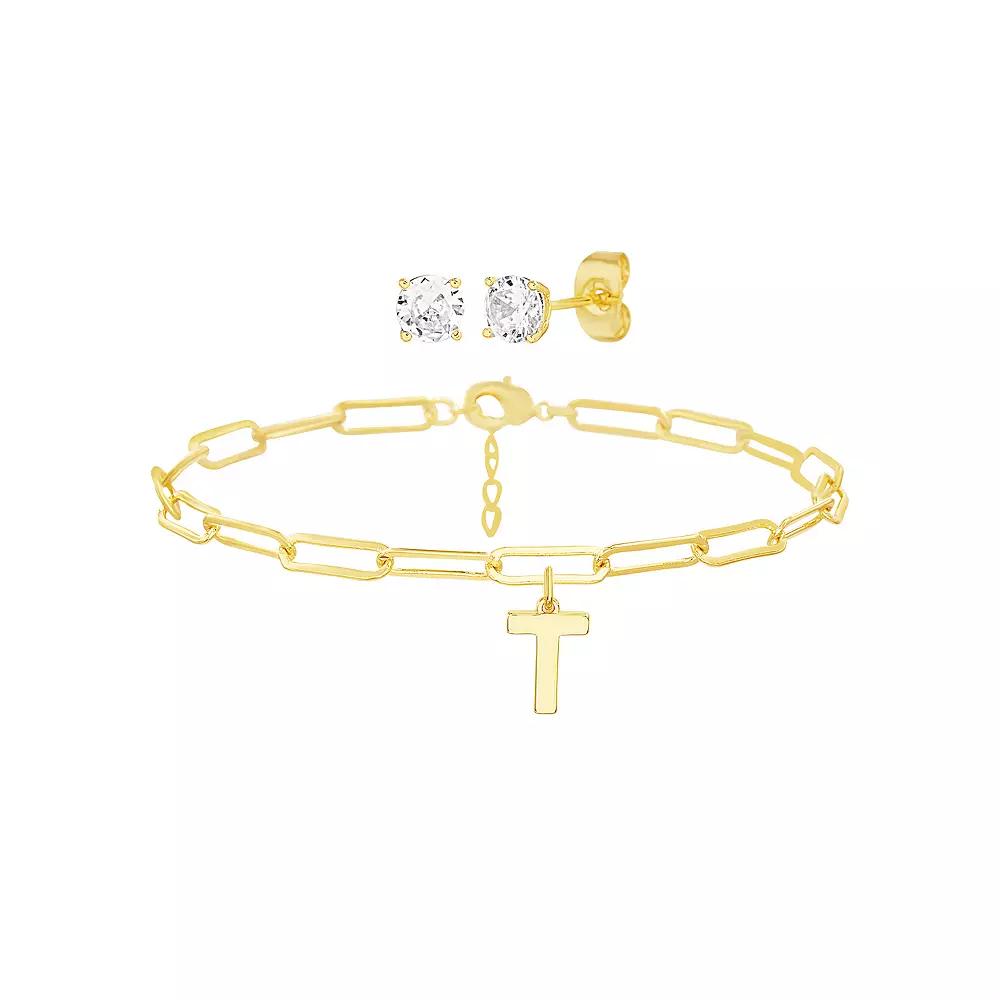 Add a personal touch to your style with this Paige Harper 14K Gold Plated Initial Charm Bracelet & Cubic Zirconia Stud Earring Set. The 7.5-in. paper clip chain bracelet, complete with a 1-in. extender, features a chic initial charm for a customized look. Paired with classic 5-mm round CZ stud earrings, this elegant set is perfect for everyday wear or gifting. Click on this JEWELRY & WATCHES GUIDE to learn about fit, styles, materials and more! Add a personal touch to your style with this Paige Harper 14K Gold Plated Initial Charm Bracelet & Cubic Zirconia Stud Earring Set. The 7.5-in. paper clip chain bracelet, complete with a 1-in. extender, features a chic initial charm for a customized look. Paired with classic 5-mm round CZ stud earrings, this elegant set is perfect for everyday wear or gifting. Click on this JEWELRY & WATCHES GUIDE to learn about fit, styles, materials and more! FEATURES Chain length: 7.5 in. + 1-in extender Chain type: paper clip Clasp: lobster-claw Earring diameter: 5 mm Backings: post Nickel free Metal: brass Plating: 14k gold flash plated Finish: polished Packaging: boxed ImportedSTONE DETAILS Stone type: cubic zirconia Total weight: 9/10 ct. Shape: round Setting: prong Gemstones may have been treated to enhance their appearance. Special care may be required. Please visit our Gemstone Treatment & Special Care Guide for more information. Size: 7.5-8.5"AD. Color: Gold Tone T. Gender: female. Age Group: adult.