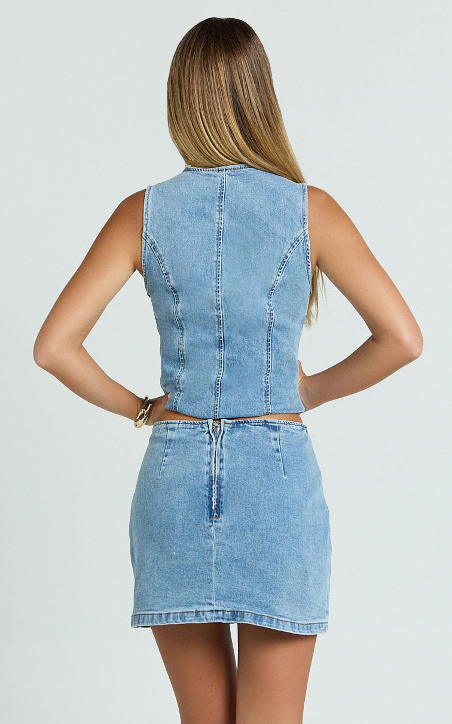 Make a statement in the Paige Mini Skirt, your new go-to piece that redefines casual chic. Crafted in a versatile mid blue wash, this high-waisted denim skirt is the epitome of effortless style for the fashion-forward woman.Product Details:Denim fabricMini lengthHigh waistZips, Buttons closureSize and FitSize S / 8 length: 36.5cm / 14.37inMaterial and Care1% Spandex, 99% CottonLow Stretch