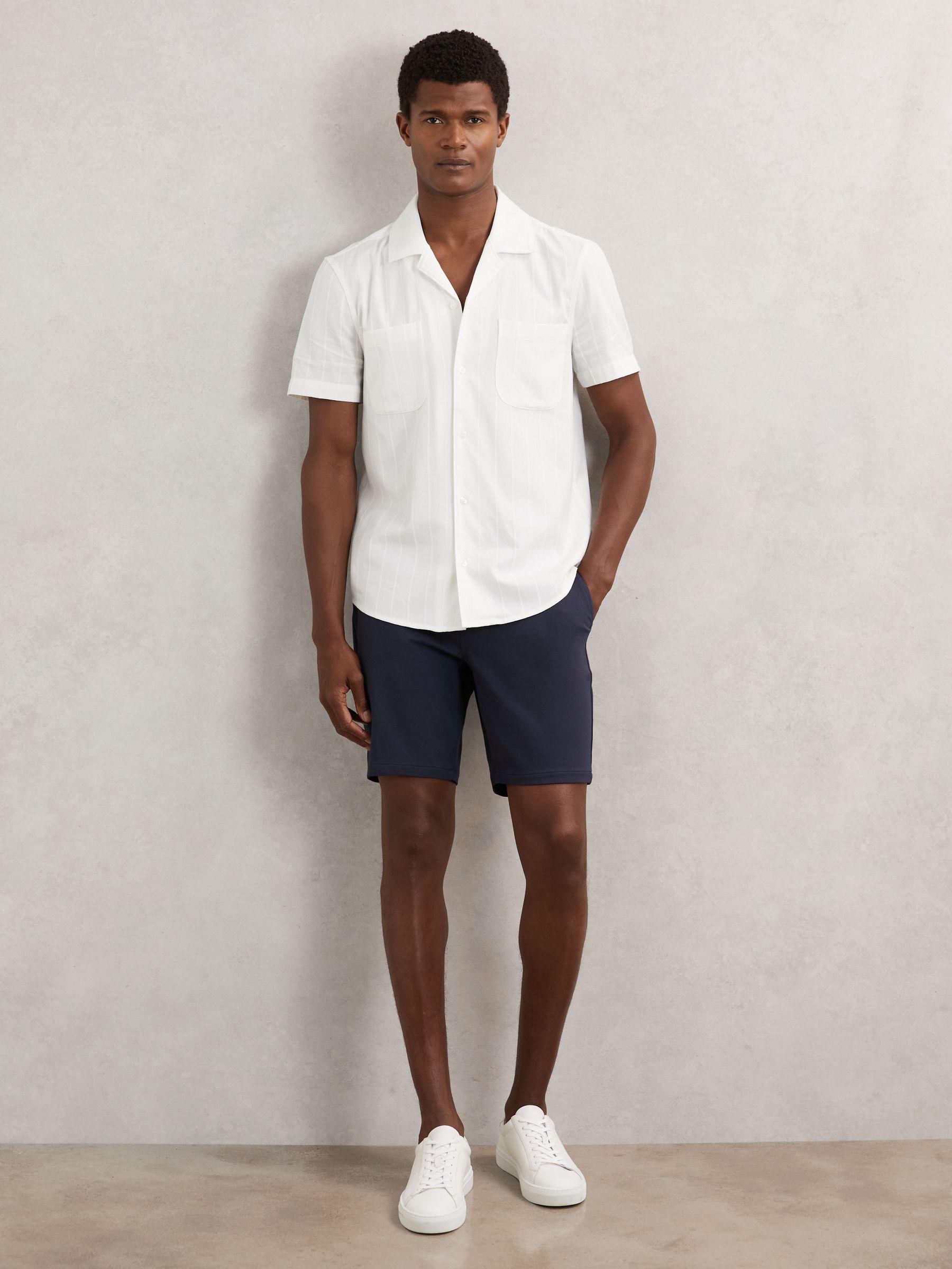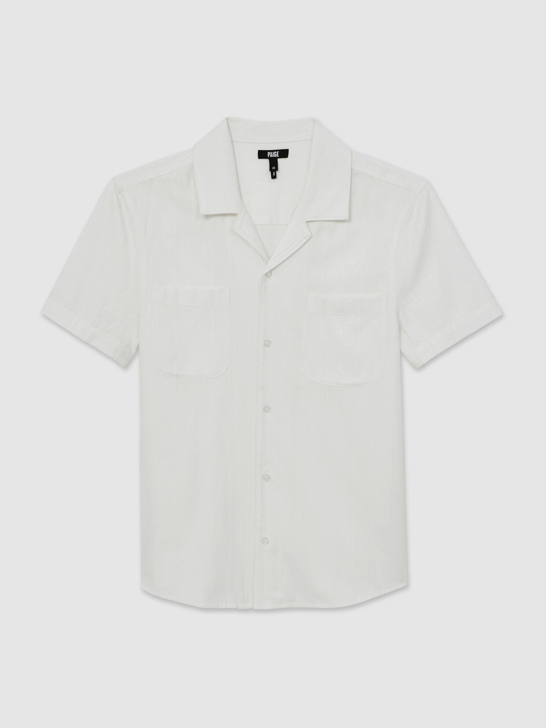 The Jacobson shirt is crafted from a soft cotton blend with a woven tonal stripe that lends subtle texture. Its Cuban collar and twin chest patch pockets enhance the laid-back aesthetic, ideal for warm-weather styling. Crafted with cotton, Woven tonal stripe, Cuban collar, Chest patch pockets, and Front buttons. Paige applies fabric technology, expert fit know-how, and a Los Angeles style sensibility to create unique denim wear and lifestyle garments with enduring appeal.
