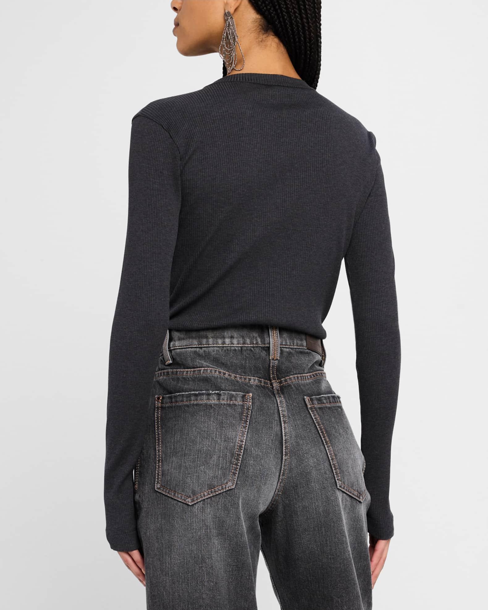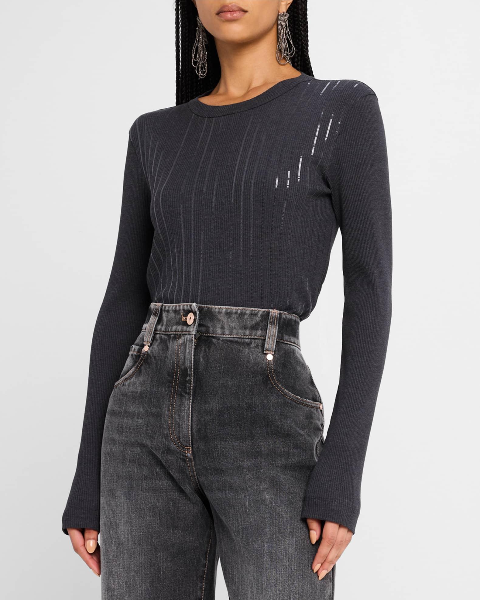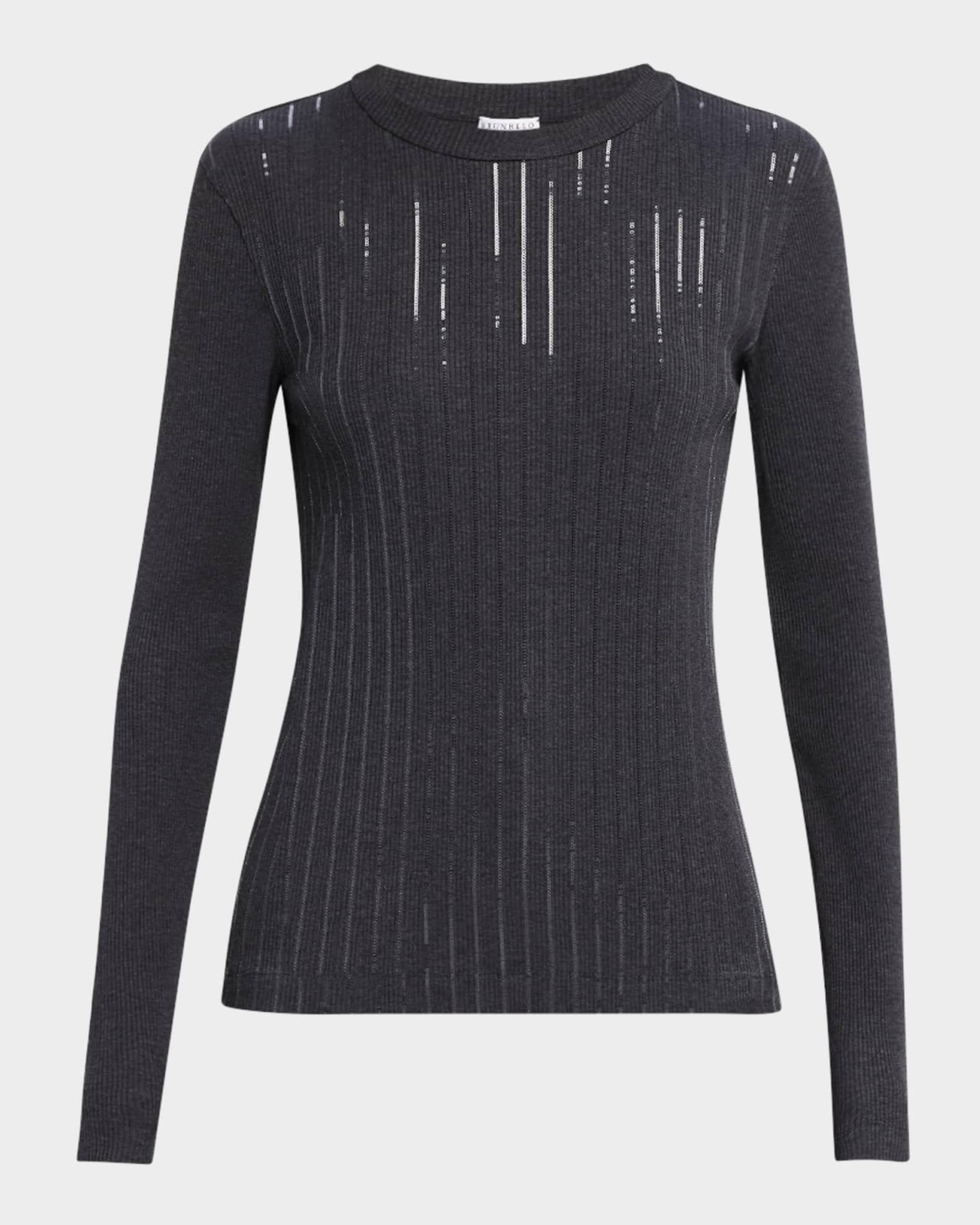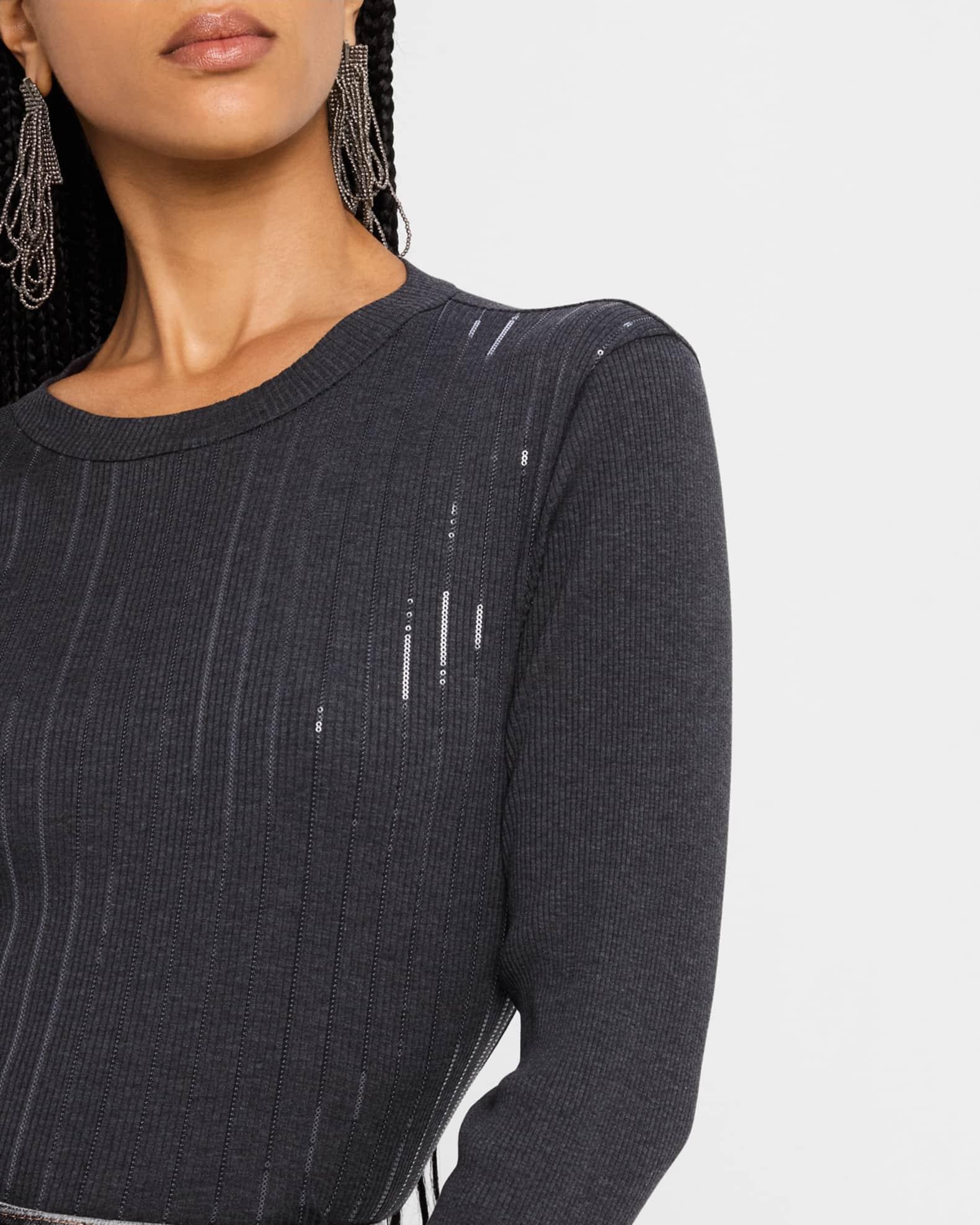 Brunello Cucinelli tee with a fitted ribbed silhouette, illuminated by reflective paillettes embroidered across the front Round neckline Long sleeves Pullover style Slim fit Cotton/elastane Made in Italy