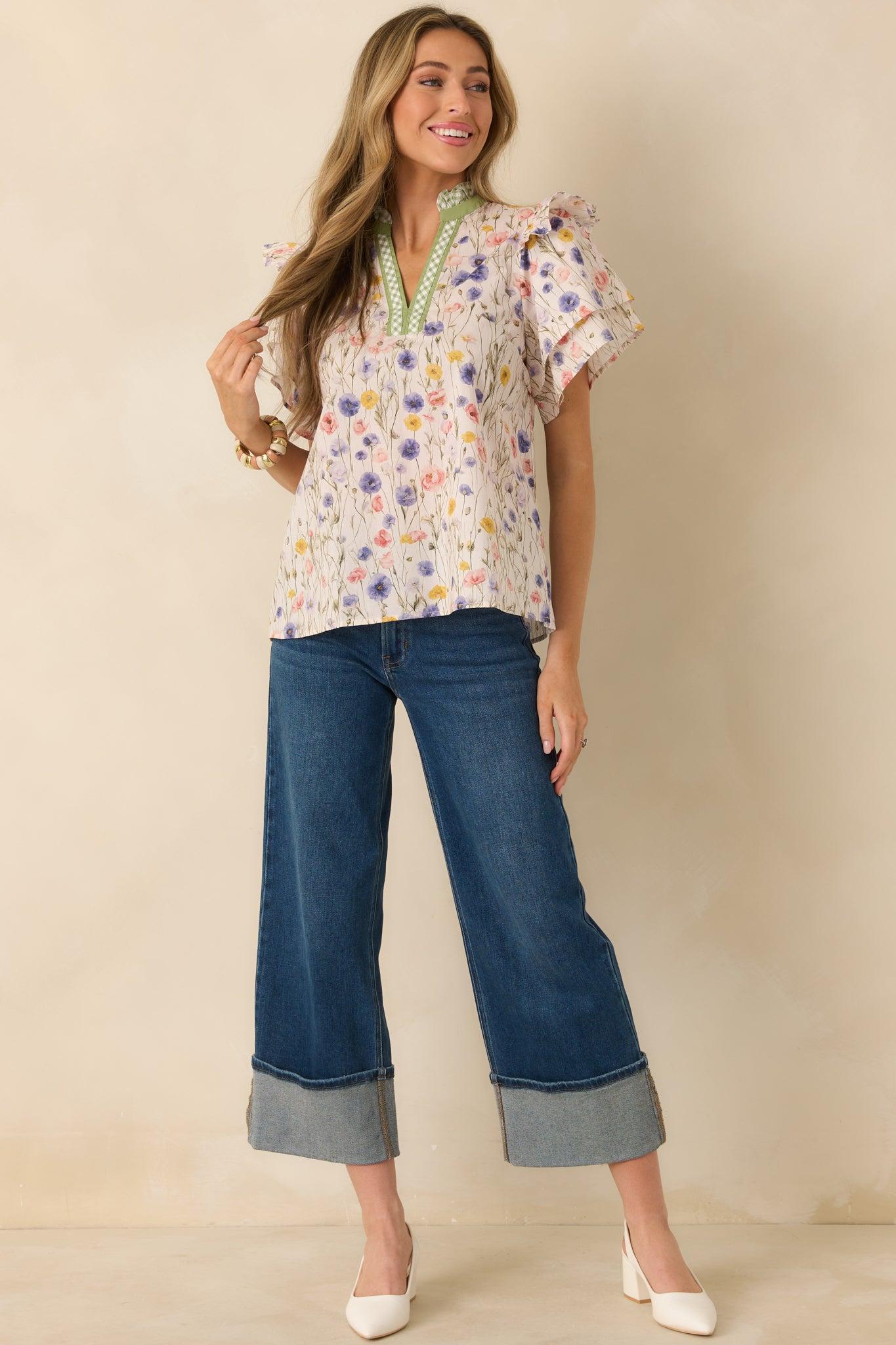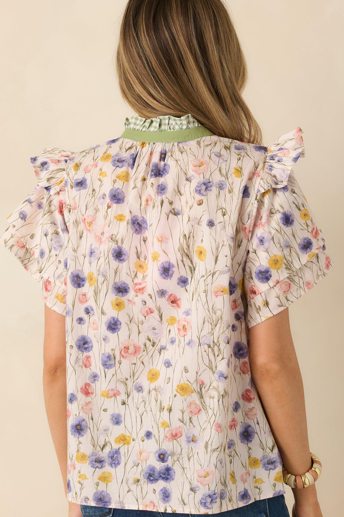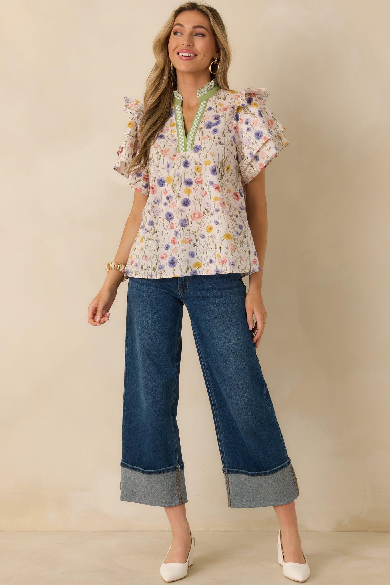 Soft florals and thoughtful details come together in the Painted Meadows Ivory Multi Cotton Floral Print Ruffle Sleeve Blouse. The airy cotton fabric features a delicate wildflower print that feels light, fresh, and timeless, while subtle ruffle sleeves add a feminine finish. Easy to dress up or down, this blouse brings a polished touch to everyday outfits. This ivory cotton blouse features a multicolor floral print throughout and a relaxed silhouette. Design details include a split neckline with contrast green trim and gingham inset, ruffled cap sleeves, and a straight hemline. Crafted from lightweight woven cotton for a breathable, comfortable fit.100% Cotton Contrast1: 65% Polyester & 32% Cotton Contrast2: 95% Polyester & 5% Spandex Hand Wash Cold Manufactured in China Designed in The USA Model is 5'8" and Wearing a Size Small, Clipped, Model is a True X-Small