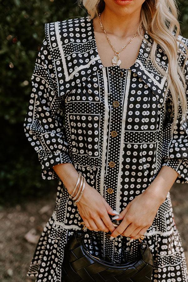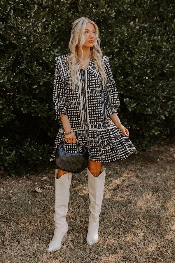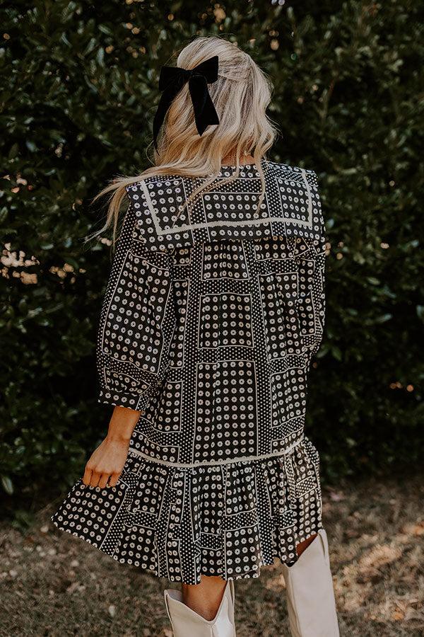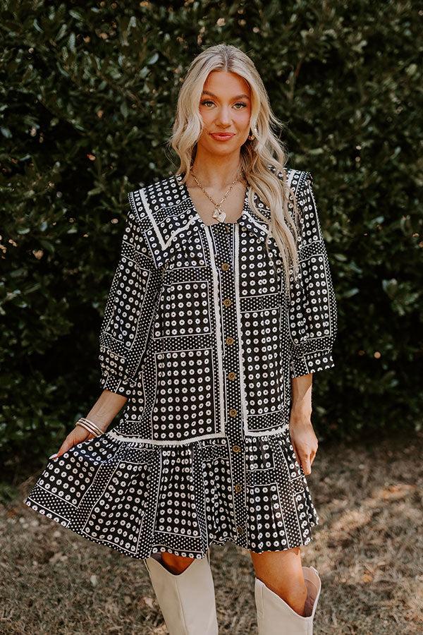 - Stay cute and effortlessly charming in this darling mini dress! The sweet collar adds a playful twist, making it perfect for twirling through your day in style. - Lightweight material with a white flower and dot print - Cream colored ribbon accents - A v-cut neckline with an oversized collar - Long sleeves - A buttoned front - Hidden side pockets - A relaxed silhouette that ends in a ruffled hemline