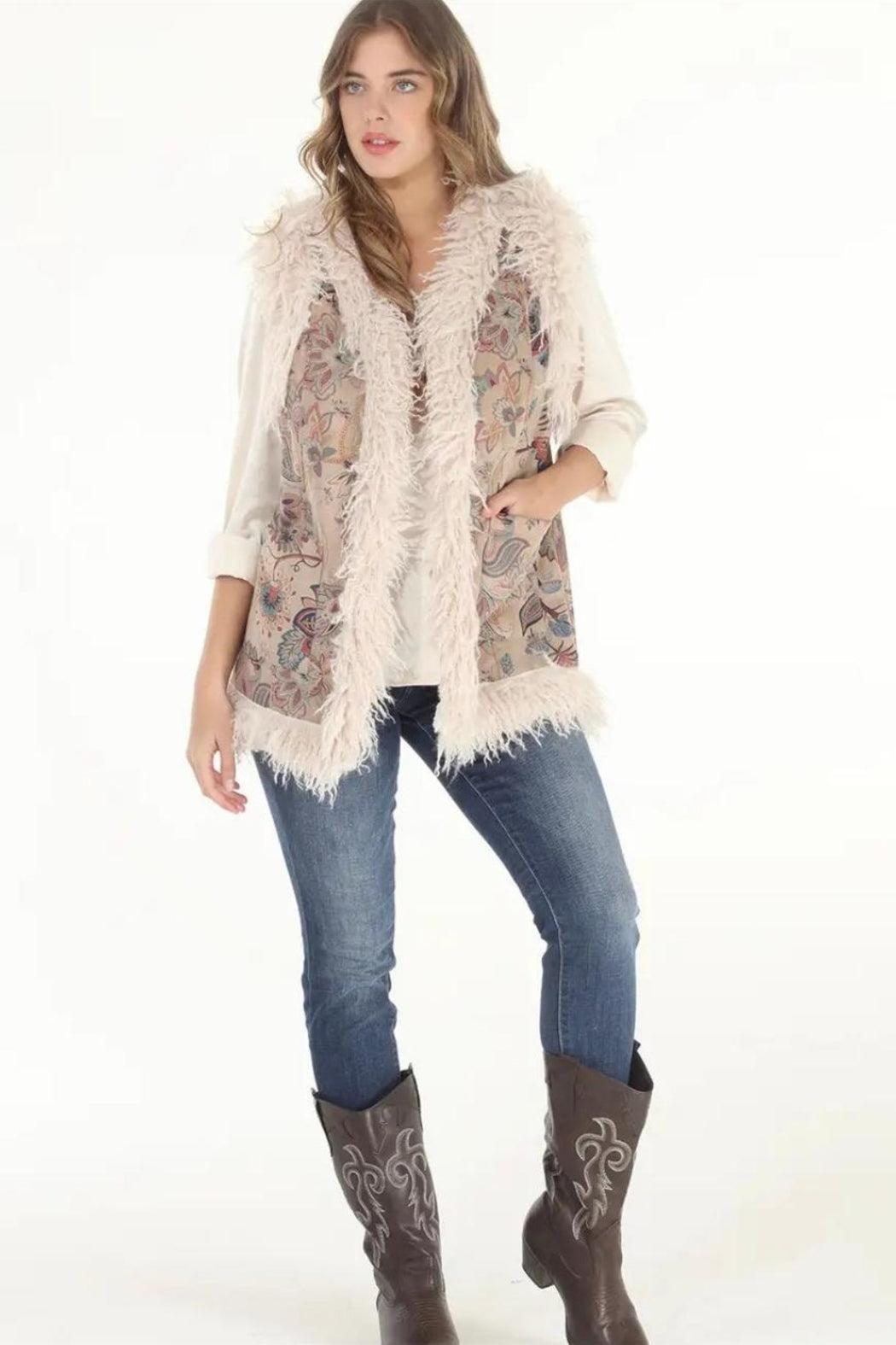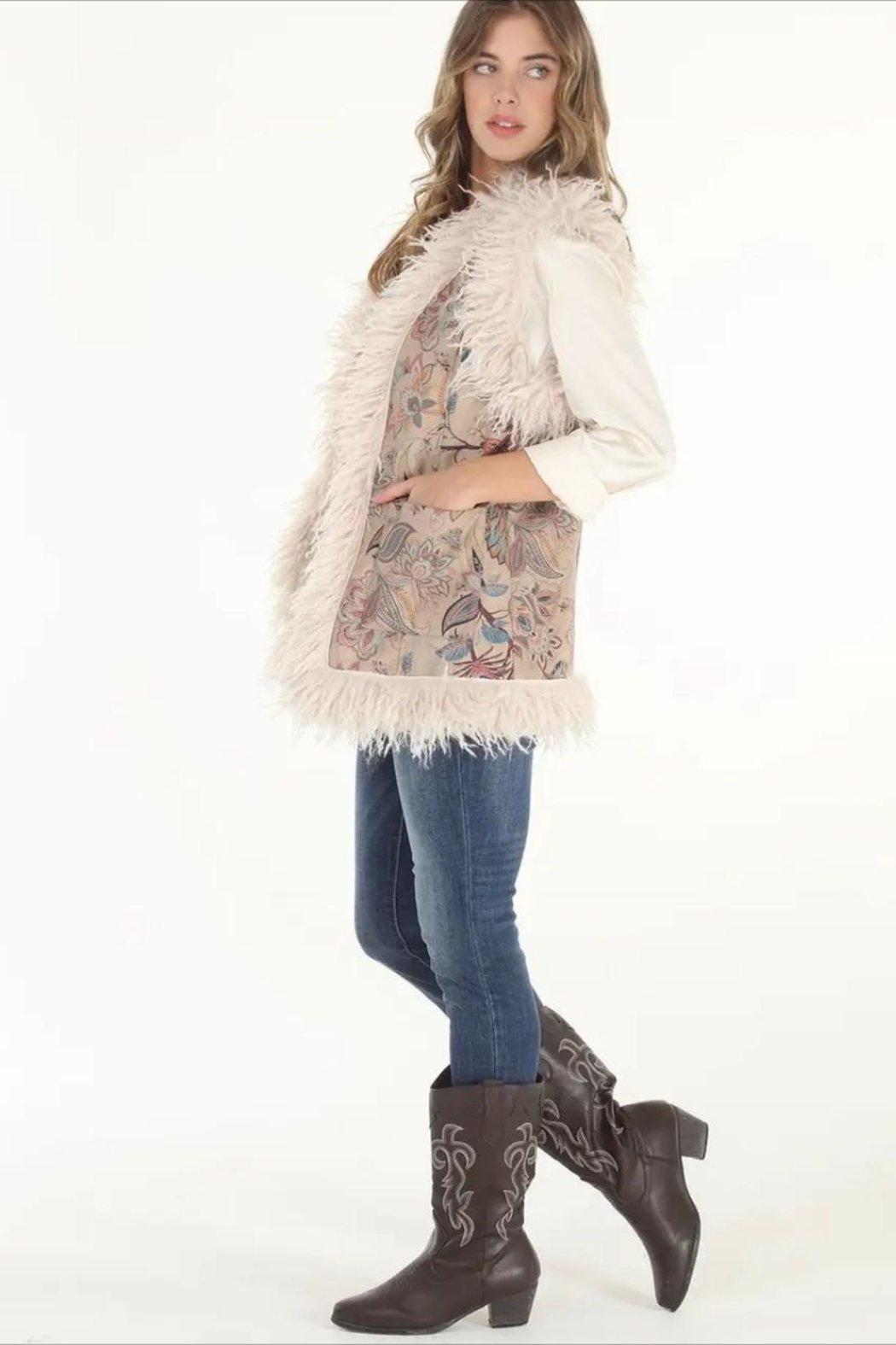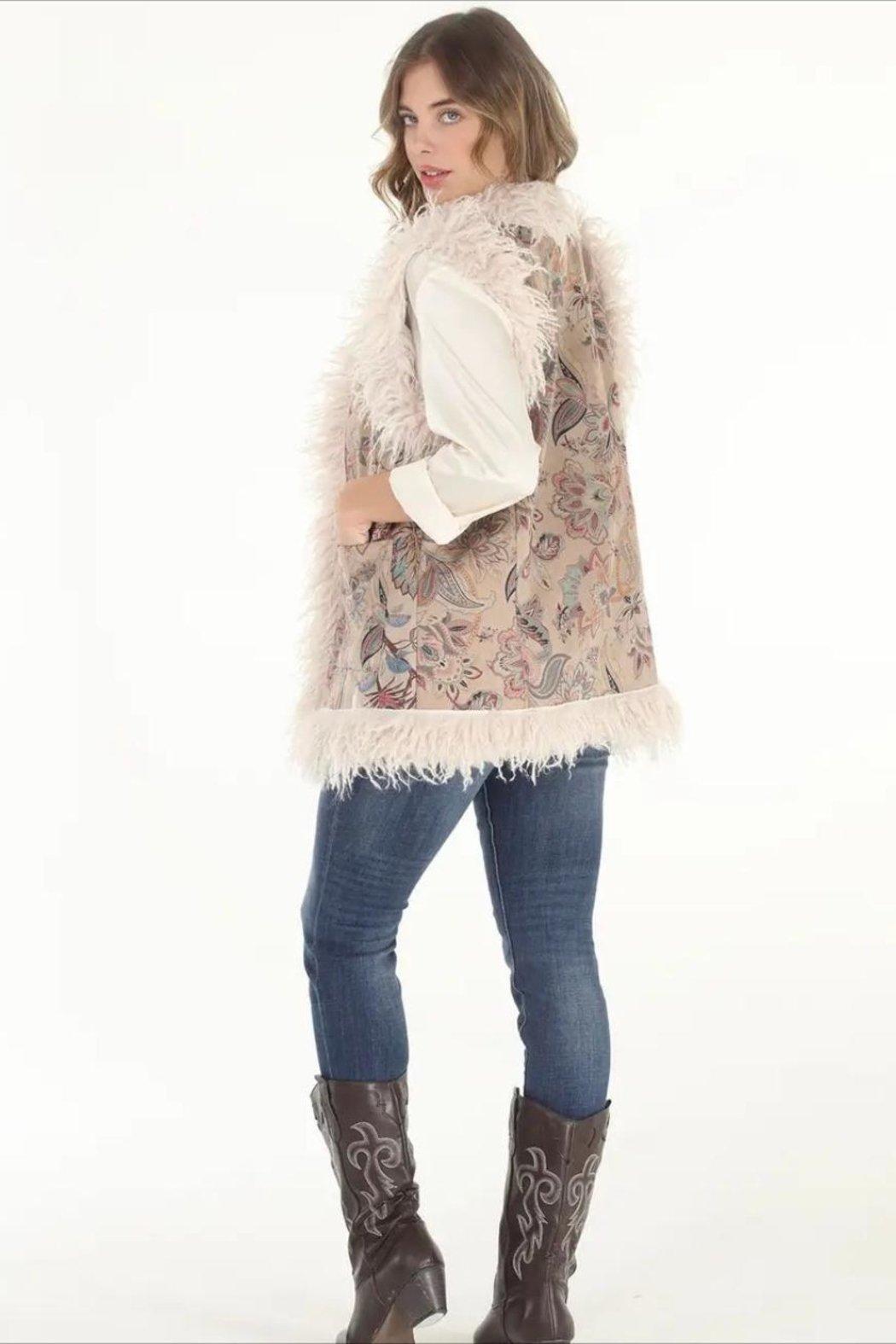Add a touch of western Boho chic in this faux suede faux fur trimmed vest featuring a paisley print. This statement piece is perfect for layering over your favorite tee or sweater for extra warmth and style. With its open front and large patch pockets it’s both fashionable and functional. Model is wearing a size small.