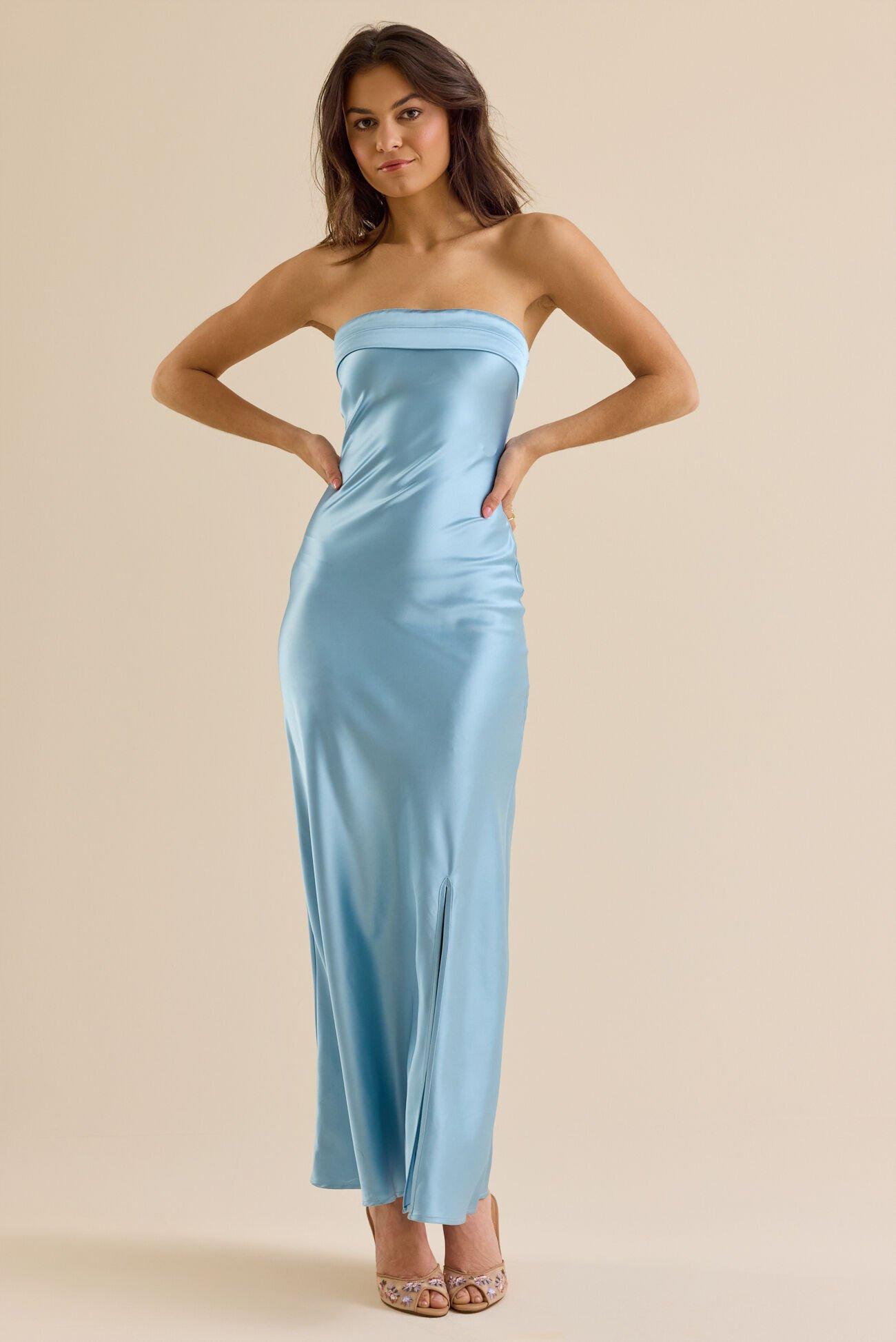 This dreamy and elegant strapless foldover top satin maxi dress with a side slit is the perfect piece for a special occasion. The soft satin fabric and flattering silhouette will make you feel like a dream, while the side slit adds movement.