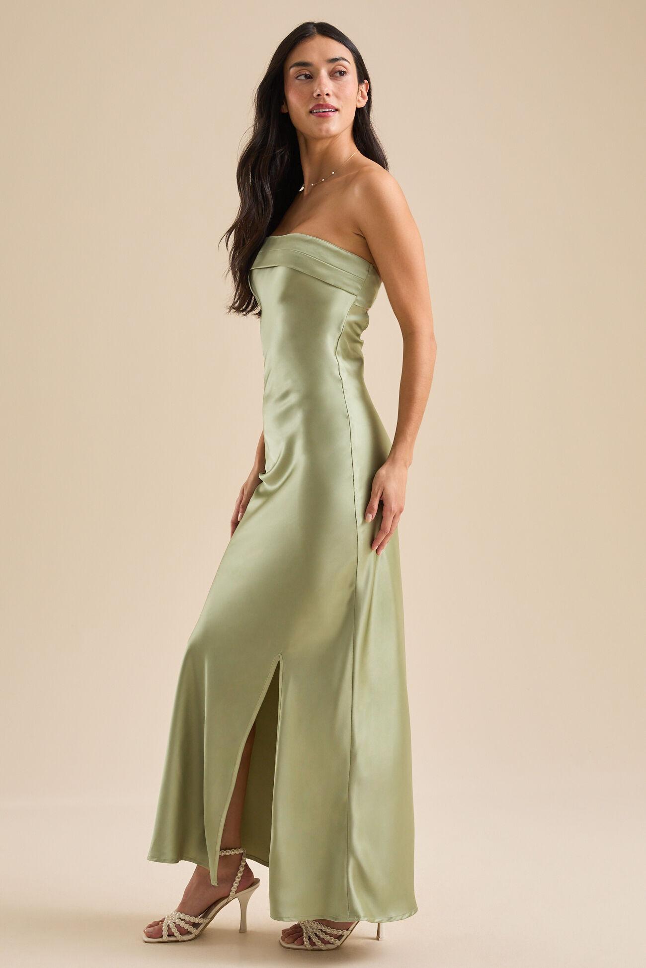 This dreamy and elegant strapless foldover top satin maxi dress with a side slit is the perfect piece for a special occasion. The soft satin fabric and flattering silhouette will make you feel like a dream, while the side slit adds movement.