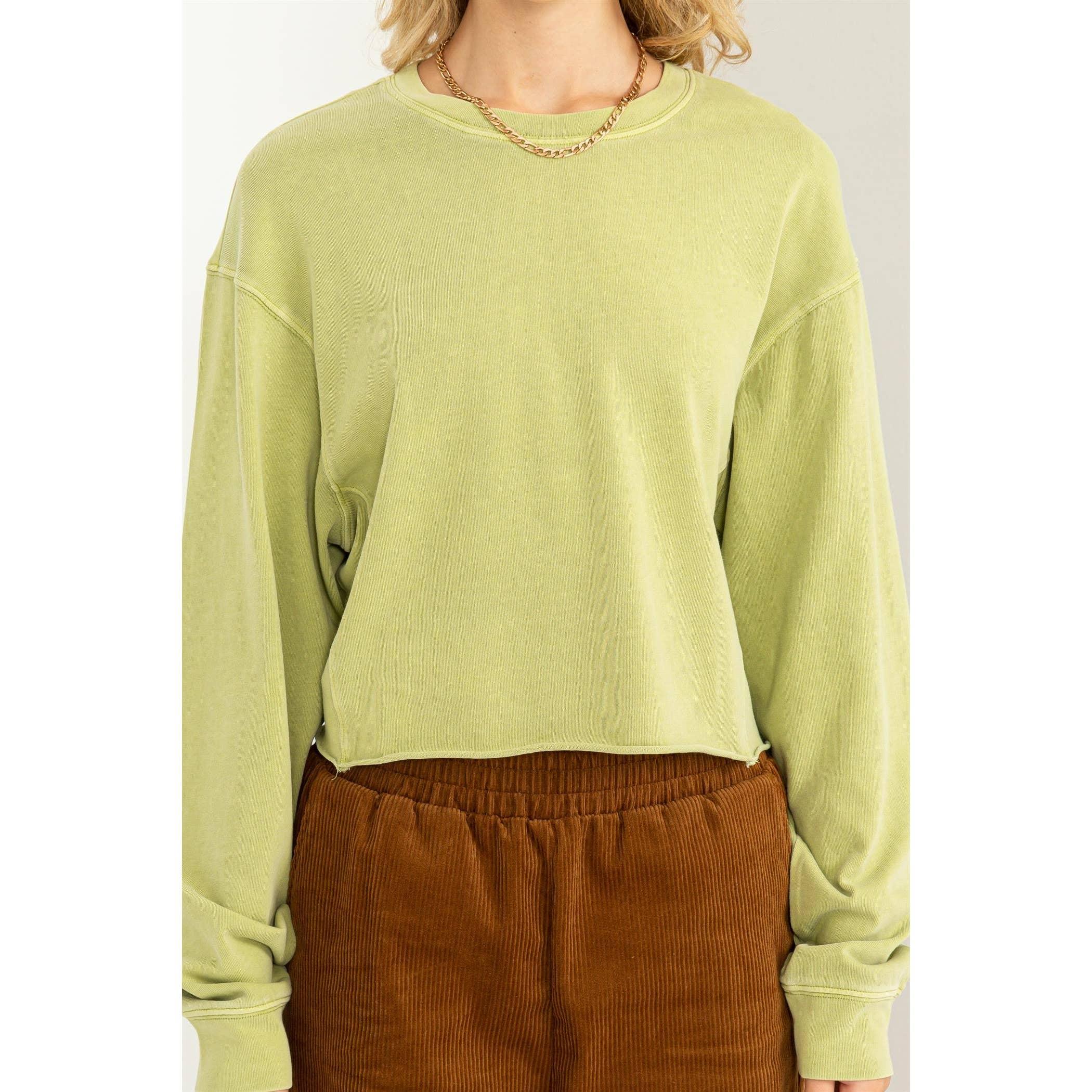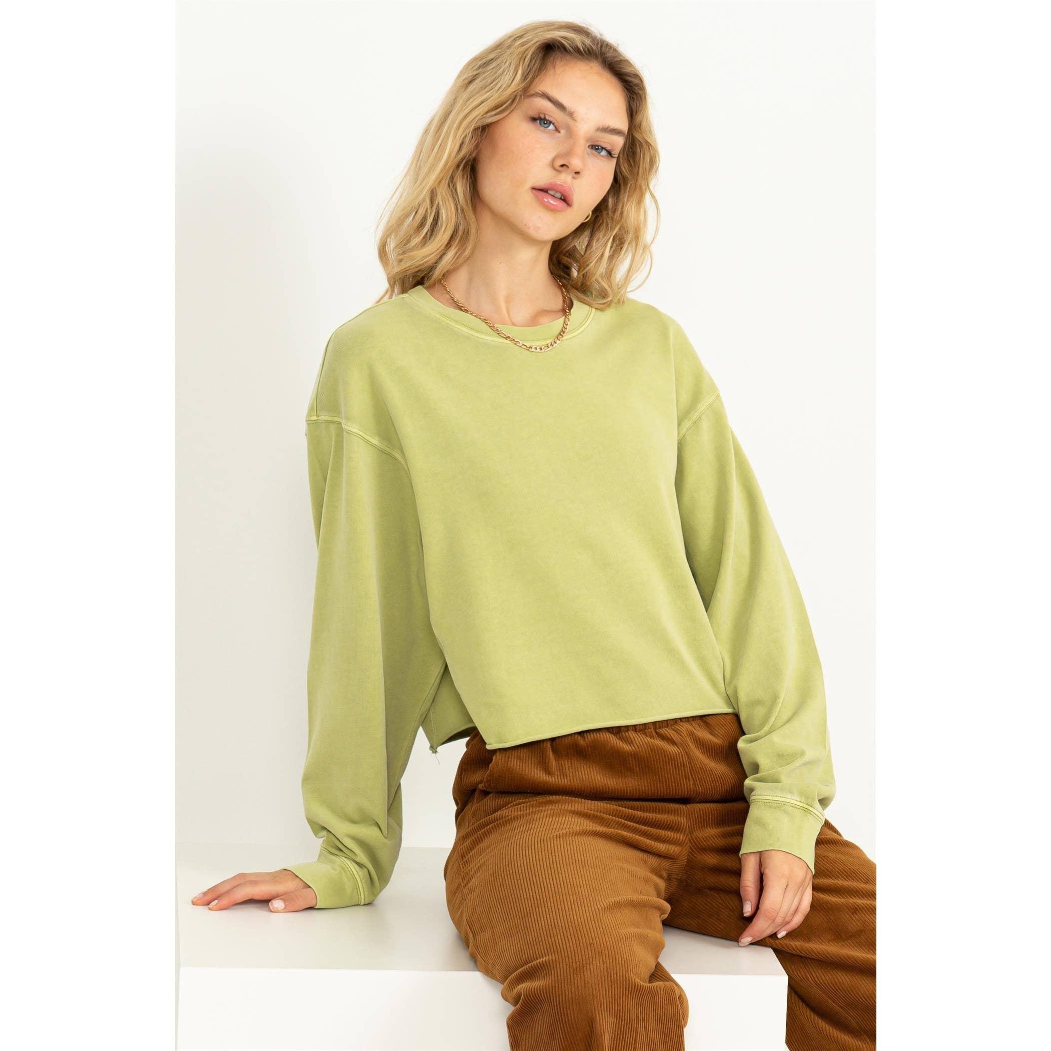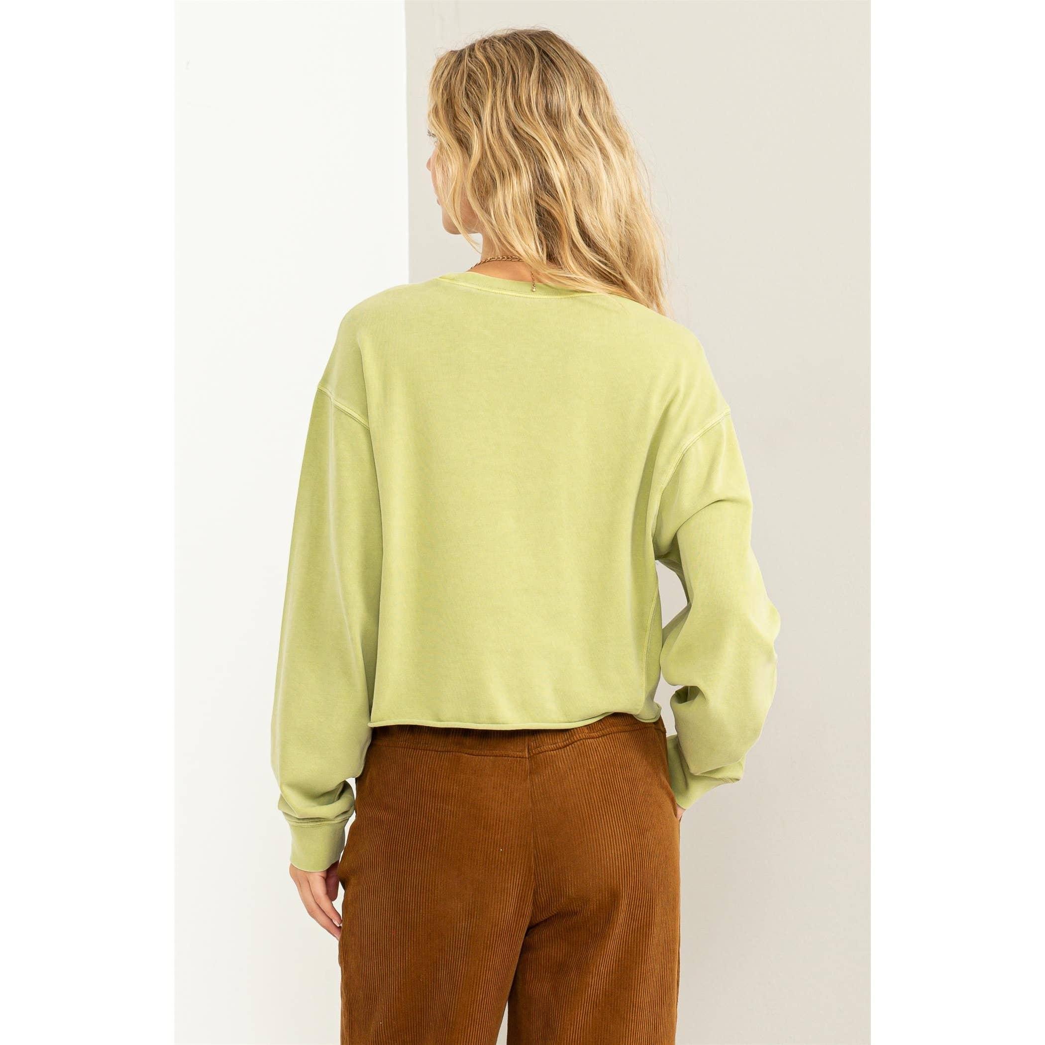 Unleash your playful side with our Pale Olive Sweatshirt! This cozy top features a round neckline, drop shoulders, and a pair of long, loose sleeves with banded cuffs. The slightly cropped, relaxed-fit bodice adds a touch of laid-back charm. Perfect for a casual and fun day out.