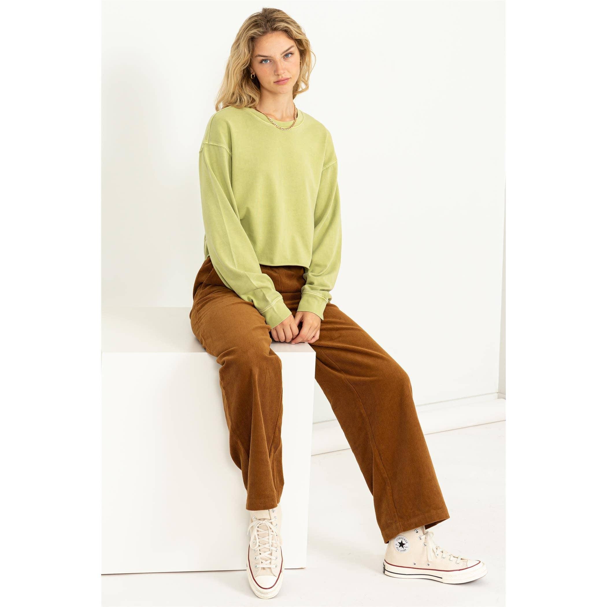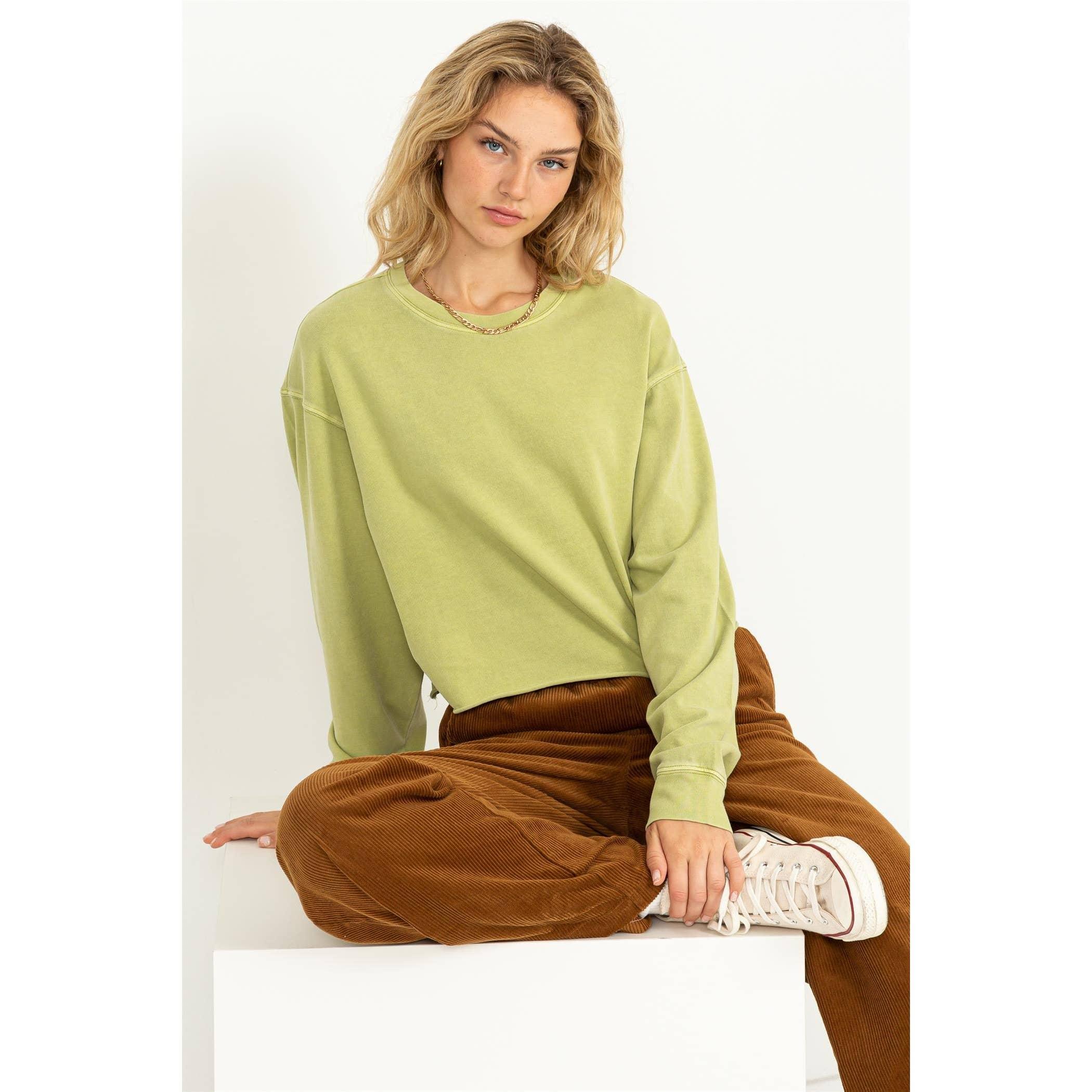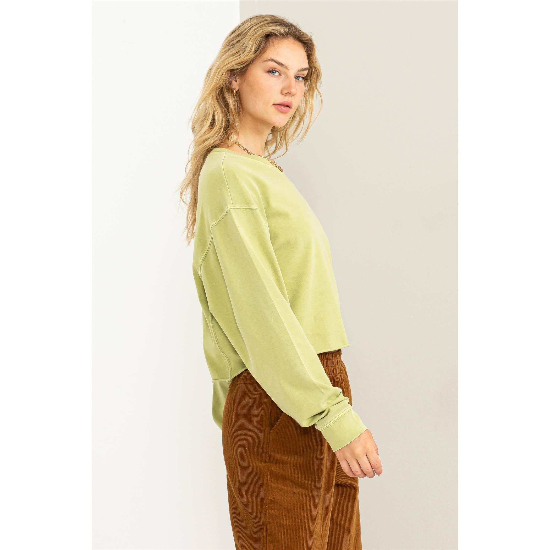 Unleash your playful side with our Pale Olive Sweatshirt! This cozy top features a round neckline, drop shoulders, and a pair of long, loose sleeves with banded cuffs. The slightly cropped, relaxed-fit bodice adds a touch of laid-back charm. Perfect for a casual and fun day out.