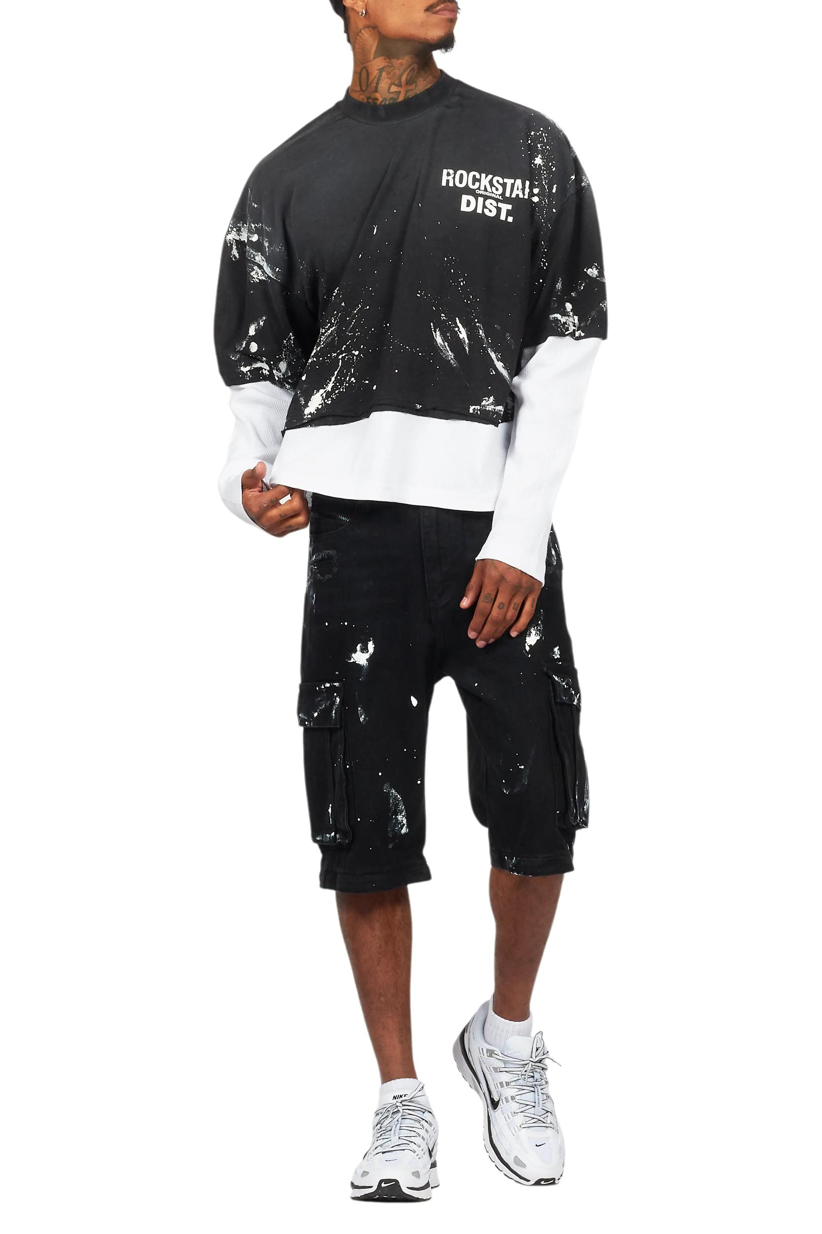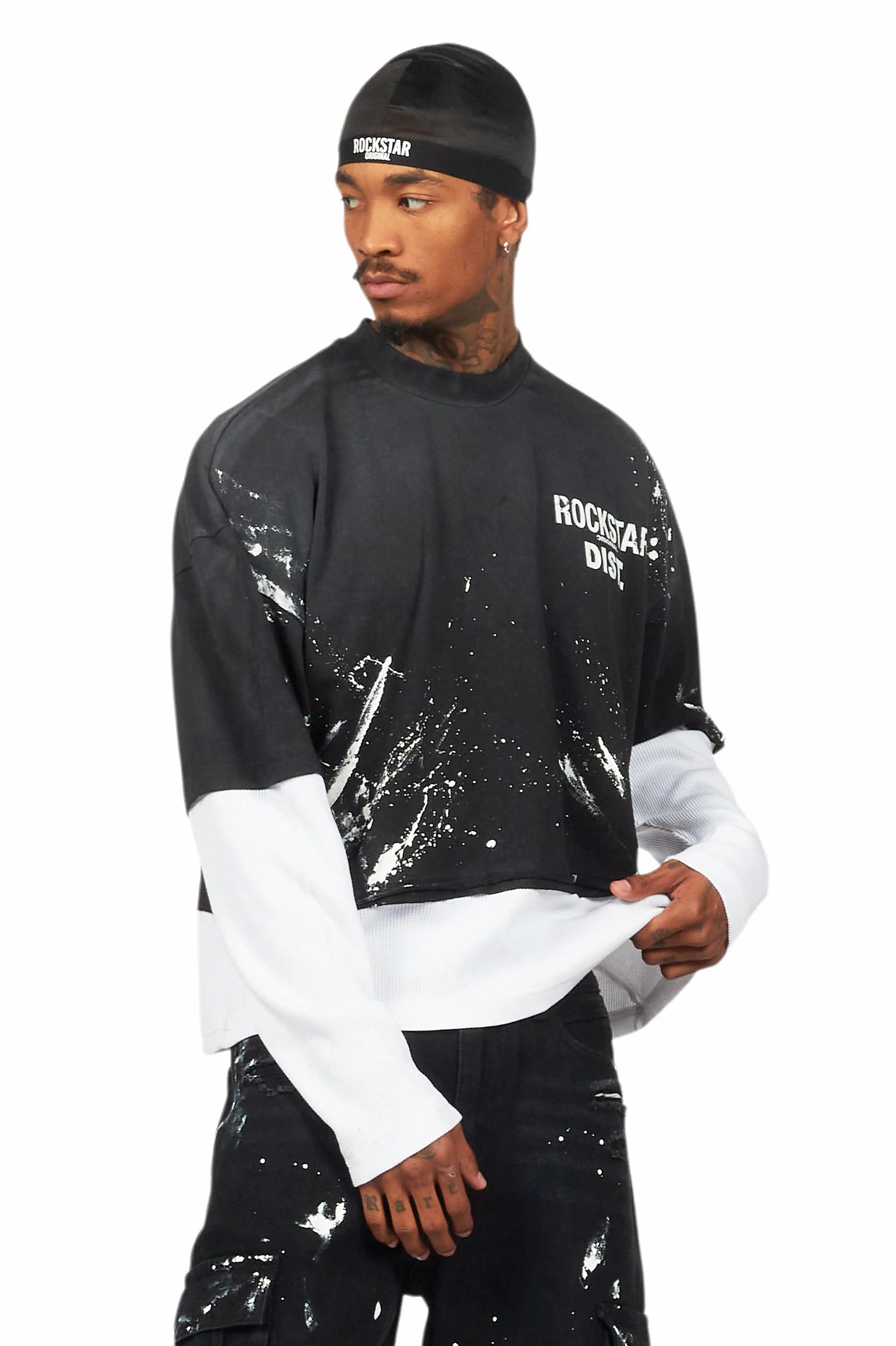 An urban double layer long sleeve thermal and short sleeve tee for men in black. Designed with organic cotton and a boxy-fit for a dope streetwear style. Crew neckline Long sleeves Ribbed knit trims Short sleeves Boxy-fit Pullover style Soft textured thermal fabric Custom paint splatter Printed RSO logos