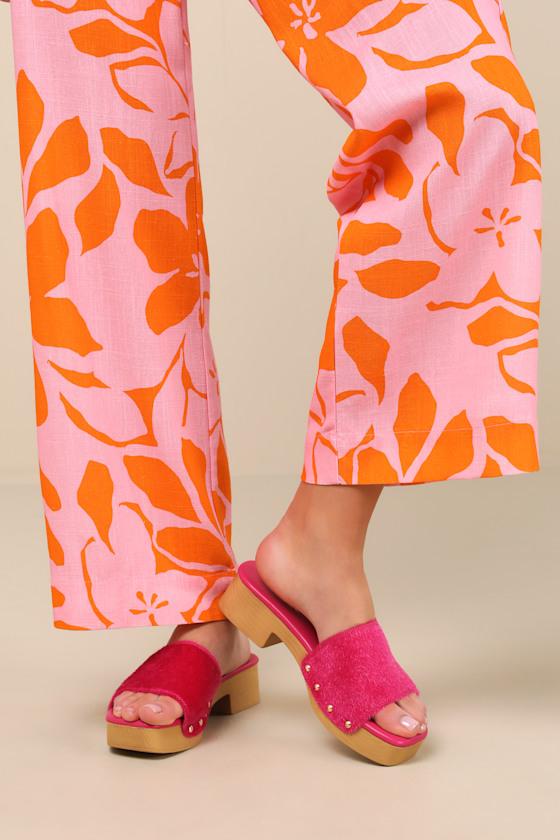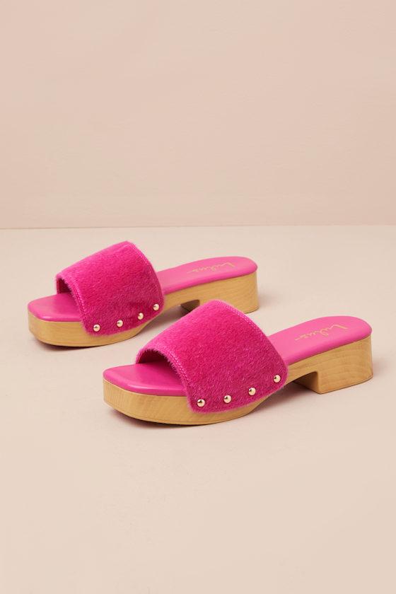 The Lulus Paley Fuchsia Faux Fur Platform Slide Sandals will make any OOTD an iconic, pose-worthy moment! These sandals are as fun as can be with their wide, fuzzy faux fur toe strap that creates an open-toe upper atop a square-shaped footbed. The effortless slide-on design features a wood-look platform sole that lends a clog-like aesthetic to these colorful sandals! Available in whole sizes only.