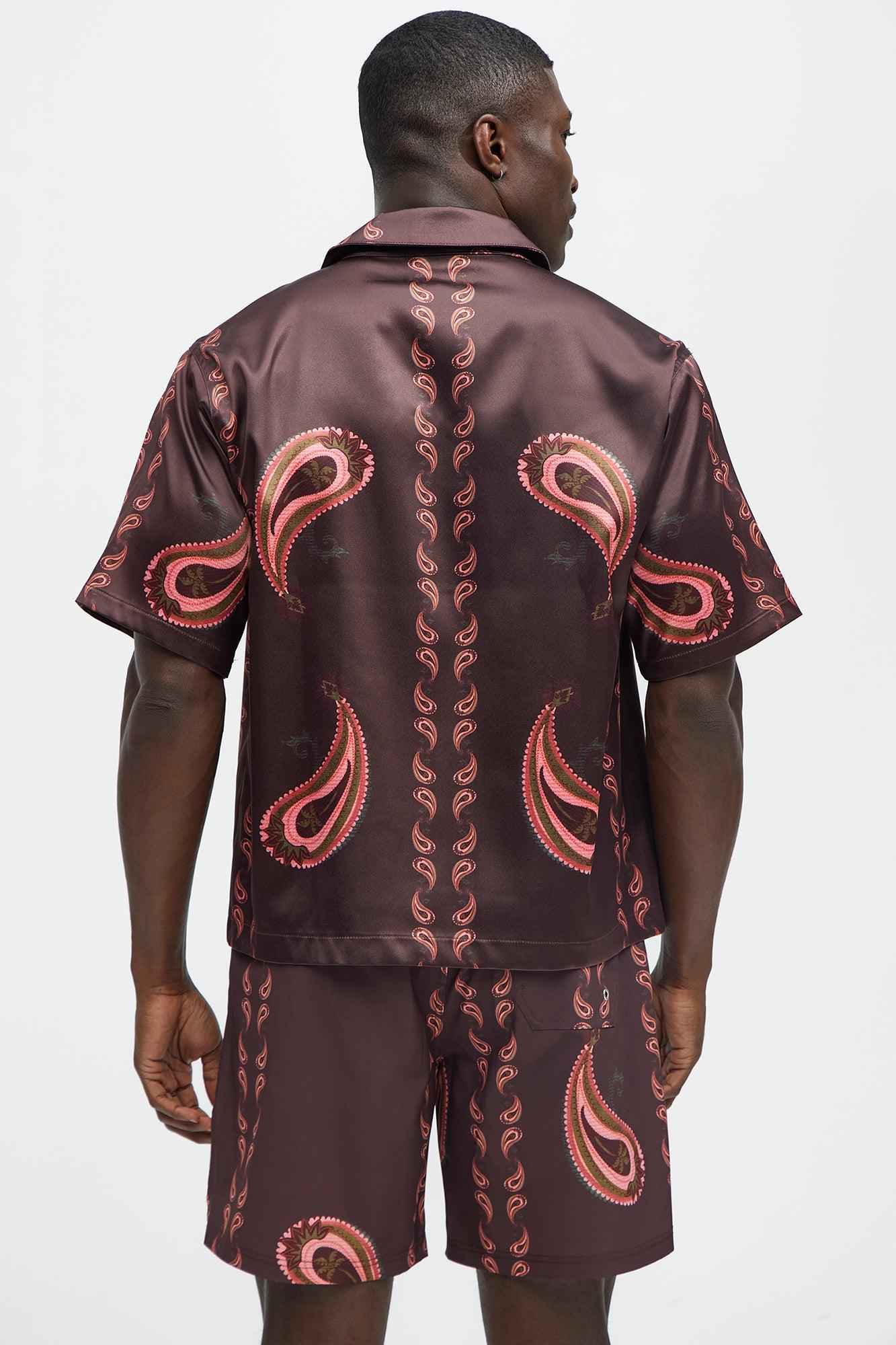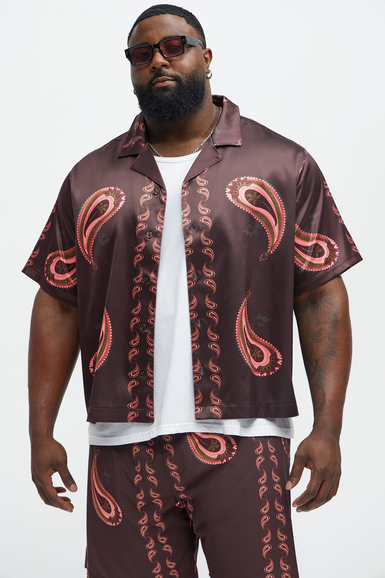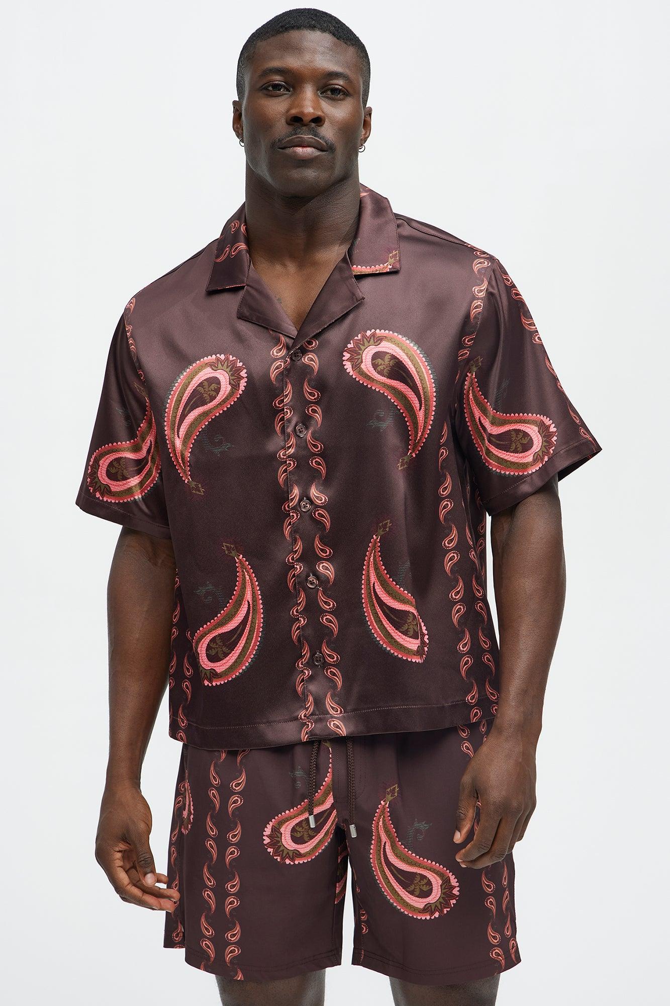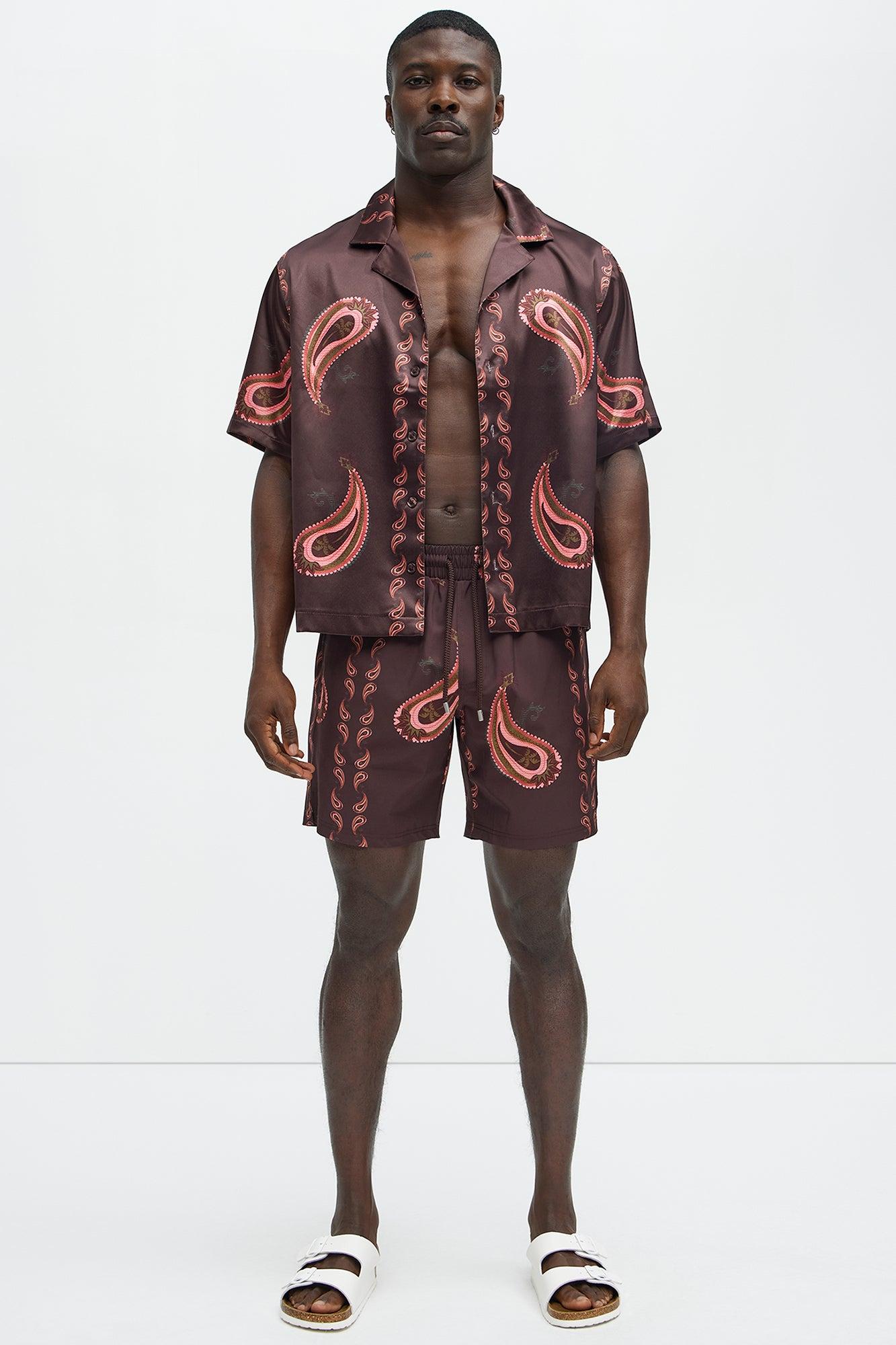 Available In Burgundy. Fold Down Collar Front Button Closure Short Sleeves Pair With " Palm Paisley Swim Trunks" Shell: 97% Polyester 3% Spandex Disclaimer: Pattern Placement May Vary. Imported California Proposition 65WARNING: Cancer and Reproductive Harm - www.P65Warnings.ca.gov.
