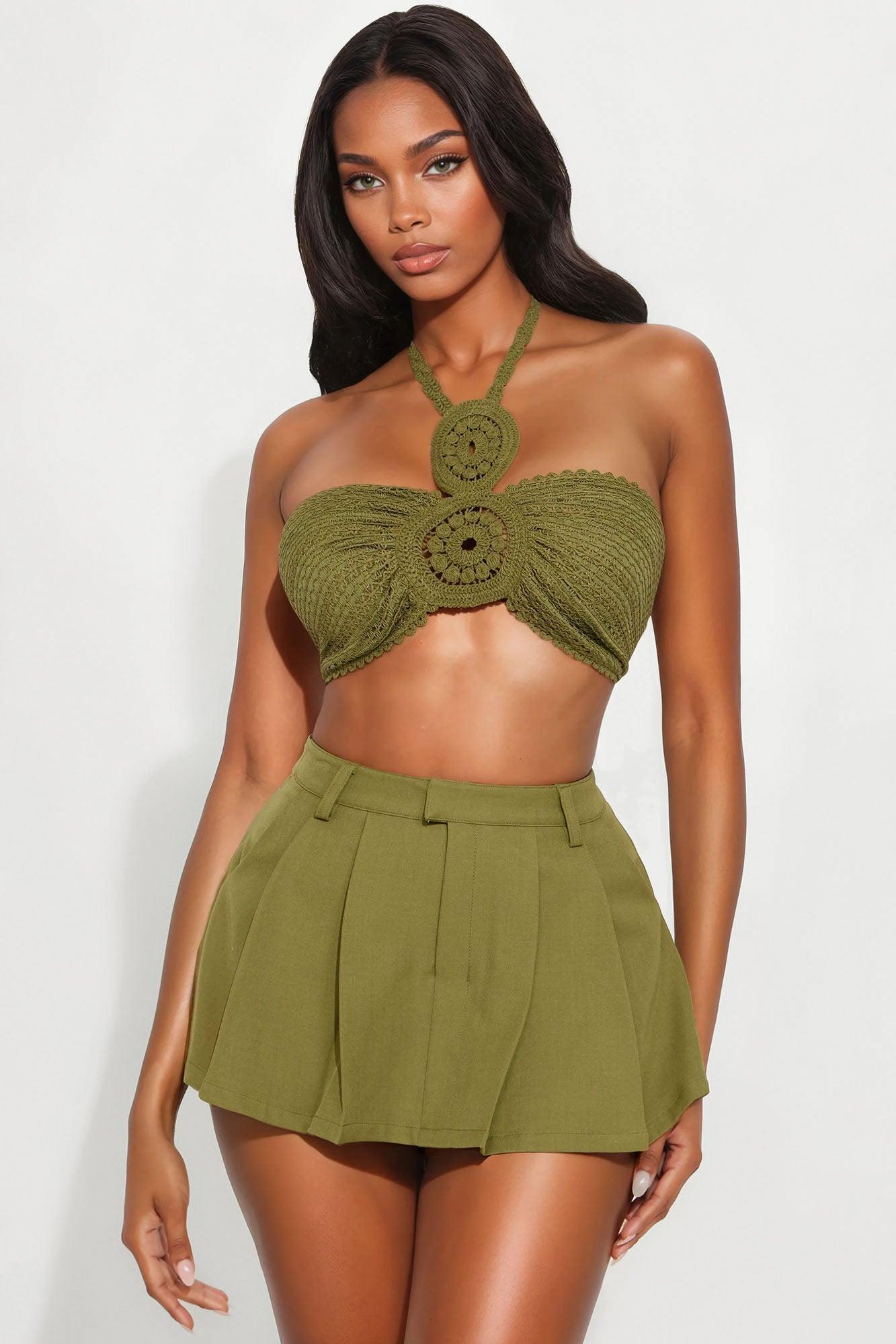 Palm Paradise Embroidered Crochet Halter Top - Olive Female