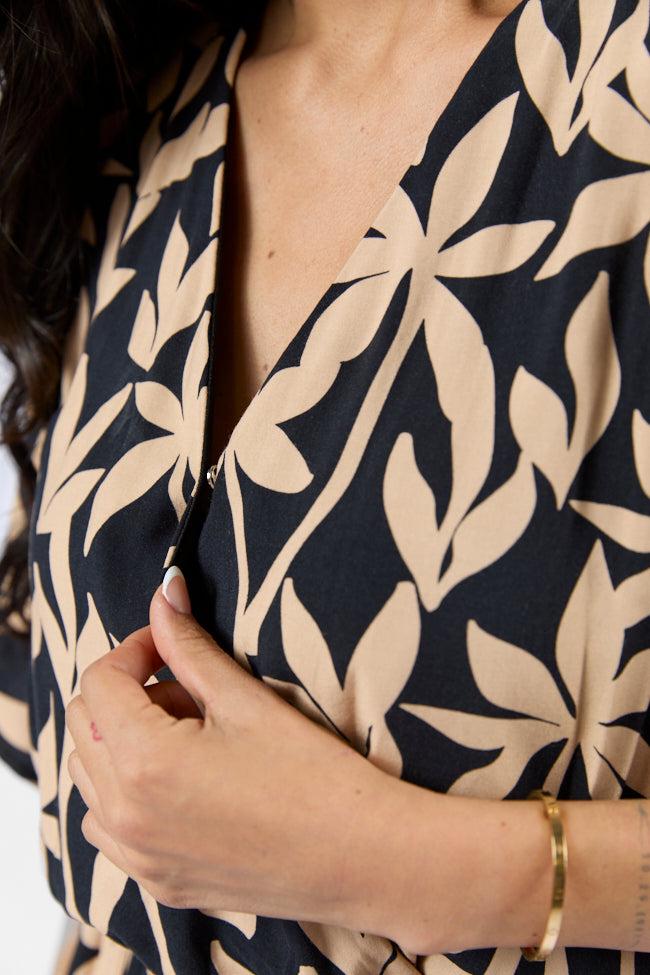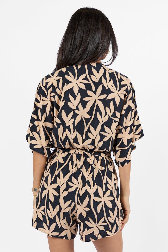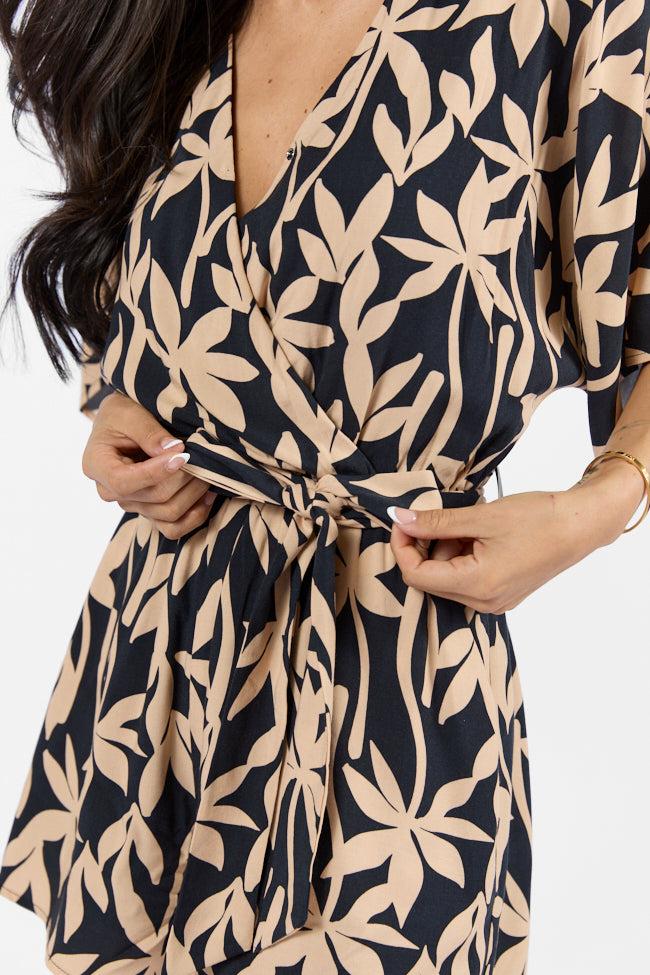 Details Neutral Print Surplice Romper Fabric has no stretch V-neckline with snap closure, dolman sleeves, elastic waistband, functional pockets, adjustable belt Lined Size small from shoulder to hem: 3" Material and Care Self: 100% rayon Lining: 100% polyester Hand wash cold, line dry Patterns may vary Materials may have natural variations Colors may vary from different viewing devices