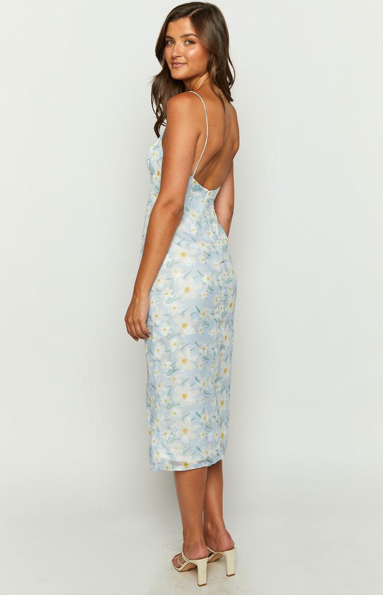 Blue Floral Midi Dress HOW TO STYLE: Our blue floral midi dress is perfect to add to your summer wardrobe! Style with some cute sandals and some dainty jewellery to finish off the look. FEATURES: Light weight material Non-stretch material Lined Slightly sheer Spaghetti strap Scoop neckline Midi length Invisible zips in centre back Tie at centre bust