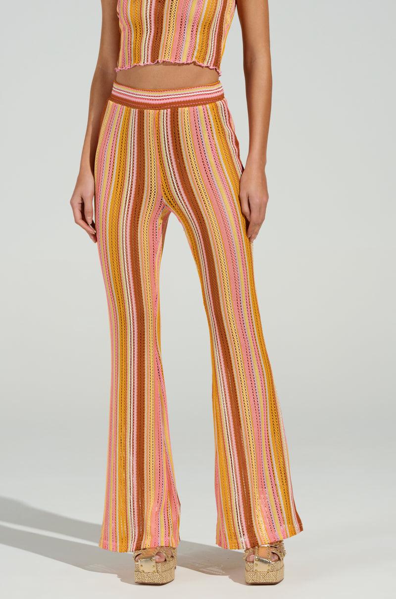 Tides are high in The AKIRA Label Paloma Knit Flare Pants. These beachy bottoms are crafted from an unlined, stretchy knit base and features a colorful, striped pattern throughout, a high-rise fit, an elasticized waistband, and a sleek, flared leg silhouette. Pair it with the matching AKIRA Label Paloma Knit Collared Top, strappy stilettos, and mini sunnies to hit the sand in style. - 95% Polyester 5% Spandex- Hand Wash Cold- Stretchy- Imported (all measurements approximate from size small)- 13” Rise- 32” Inseam- Model is 5’9” and is wearing size small Product ID: 1028035