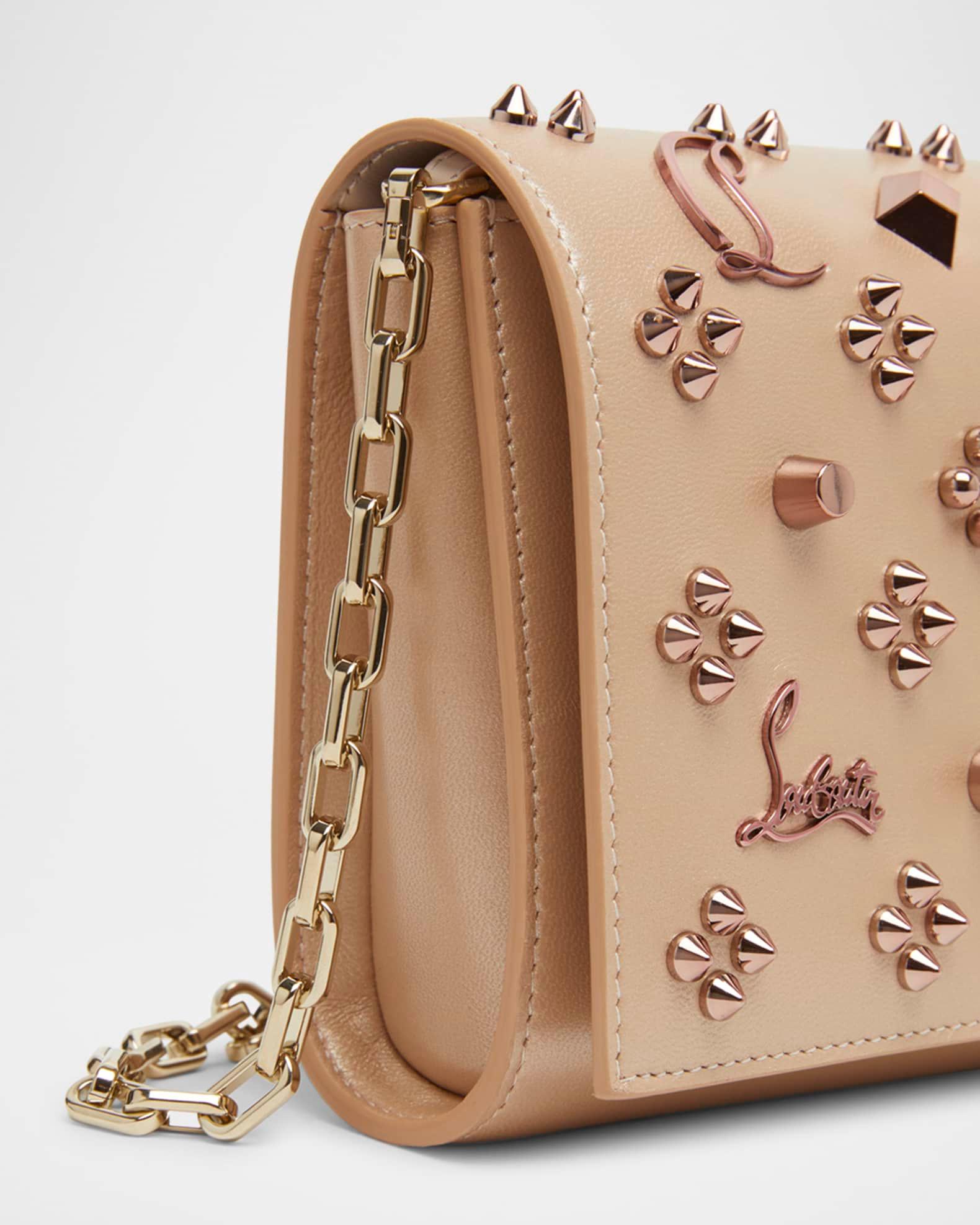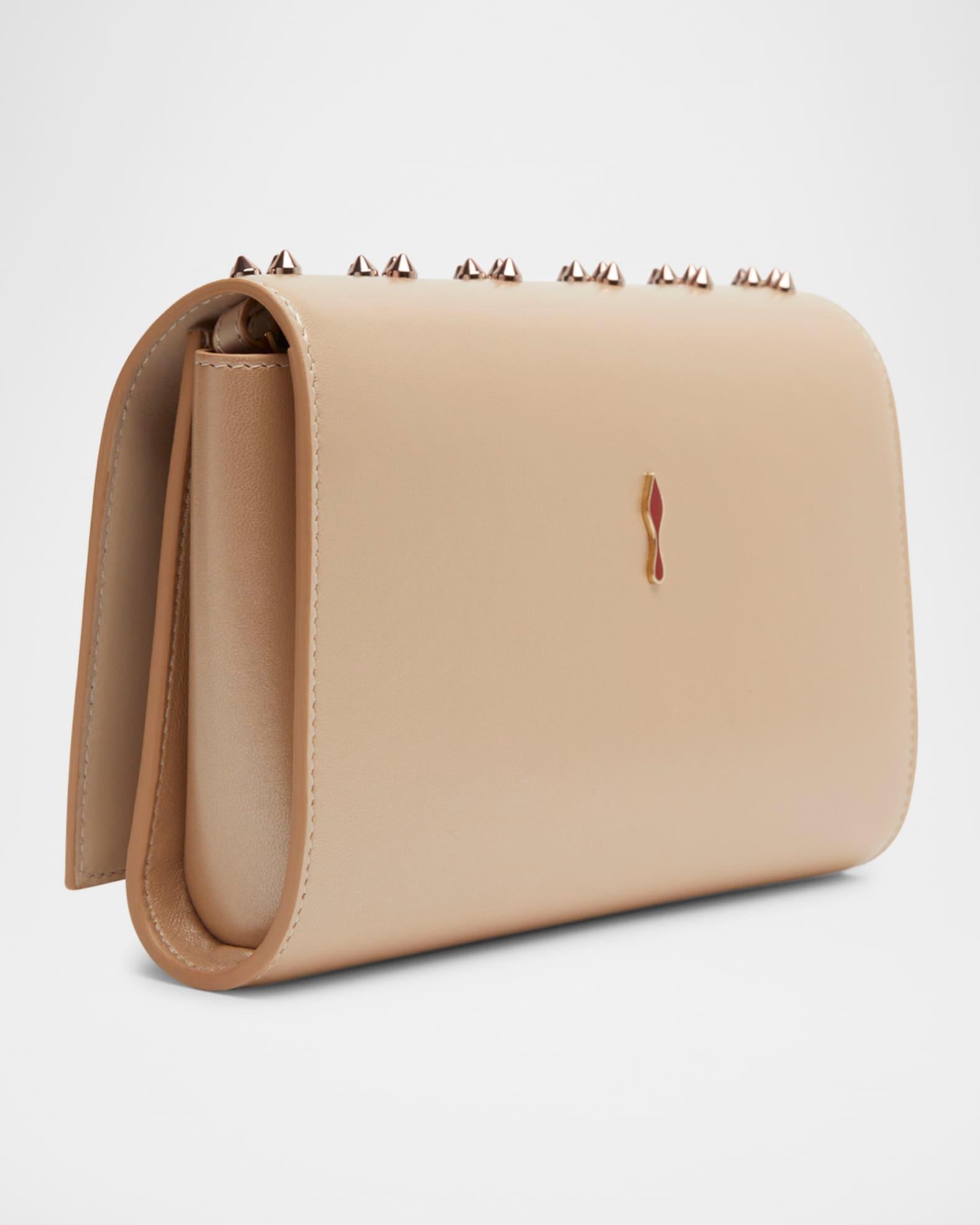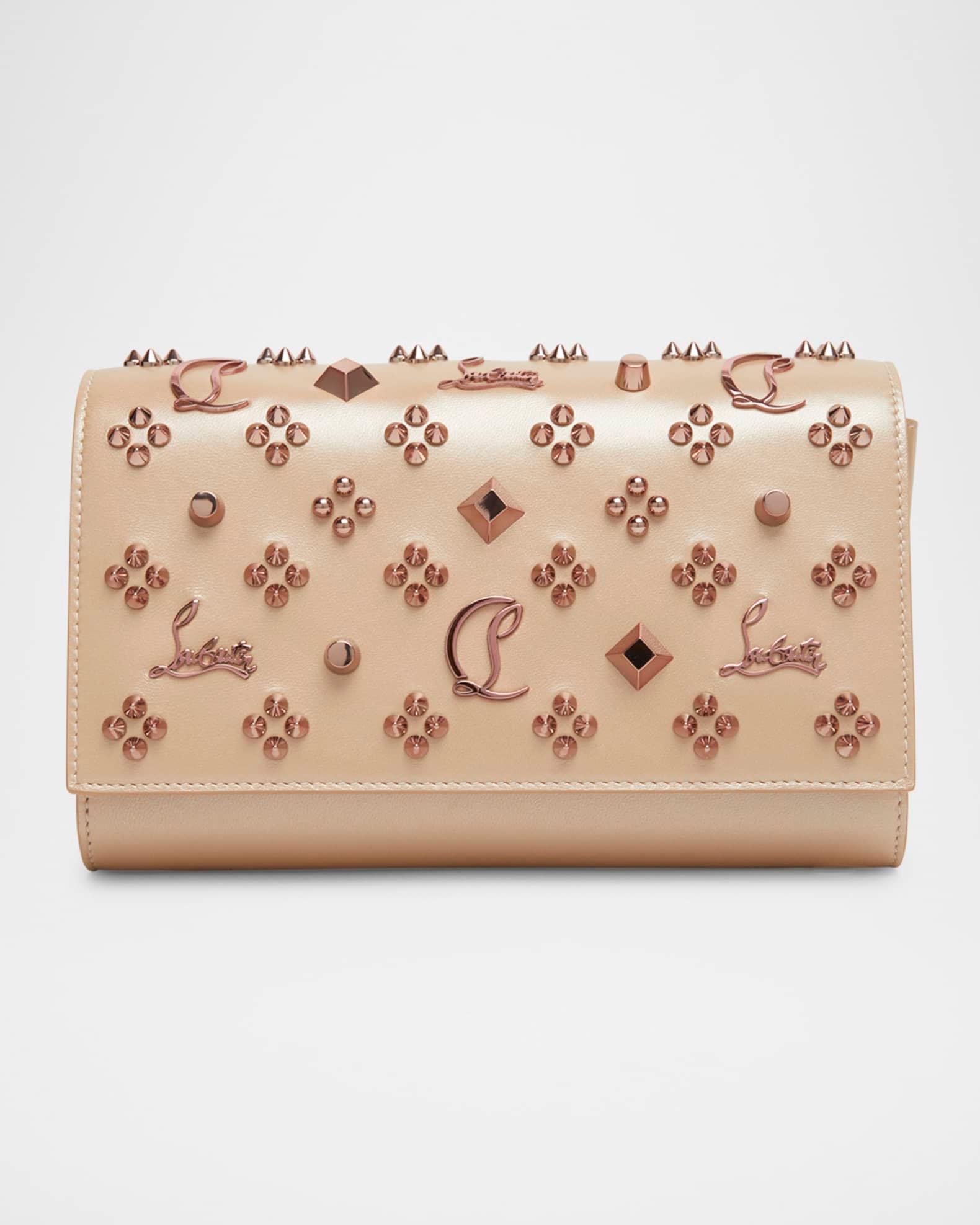 Christian Louboutin "Paloma" clutch bag in nappa perle leather studded with Loubinthesky spike motif Embellished with CL and Louboutin script logo Detachable chain crossbody strap Flap top with magnetic closure Interior, one zip pocket and four card slots Signature red leather interior Approx. 5.7"H x 9"W x 2.3"D Made in Italy