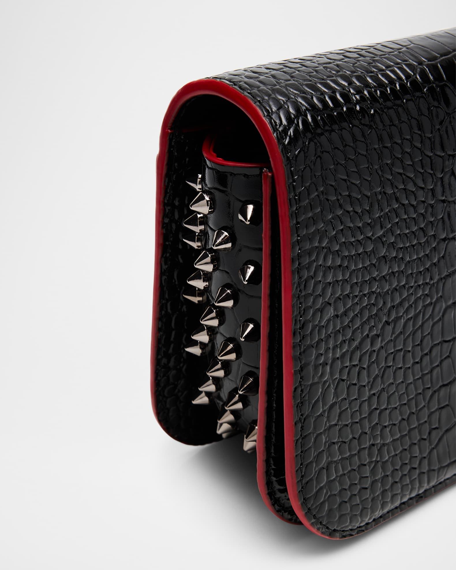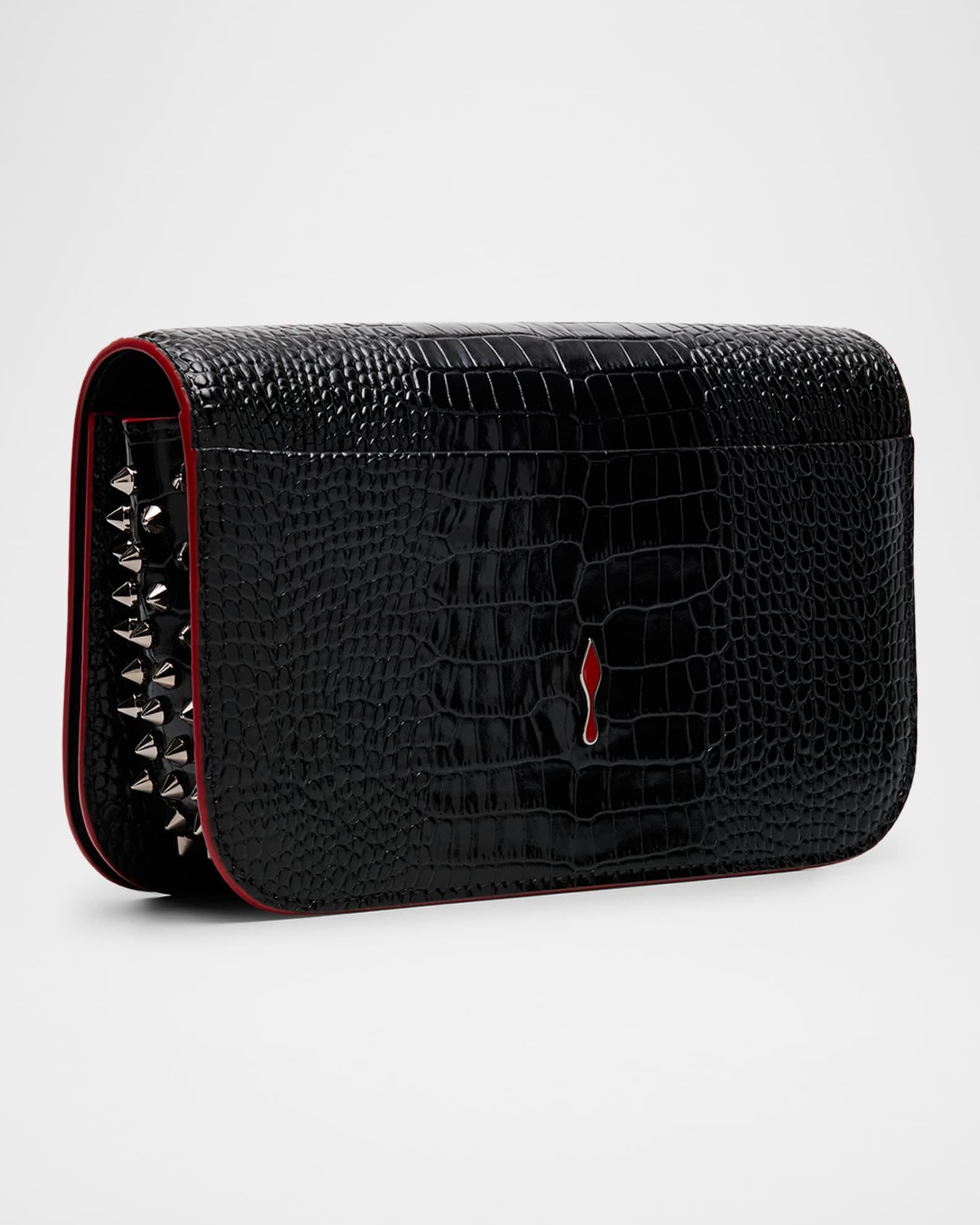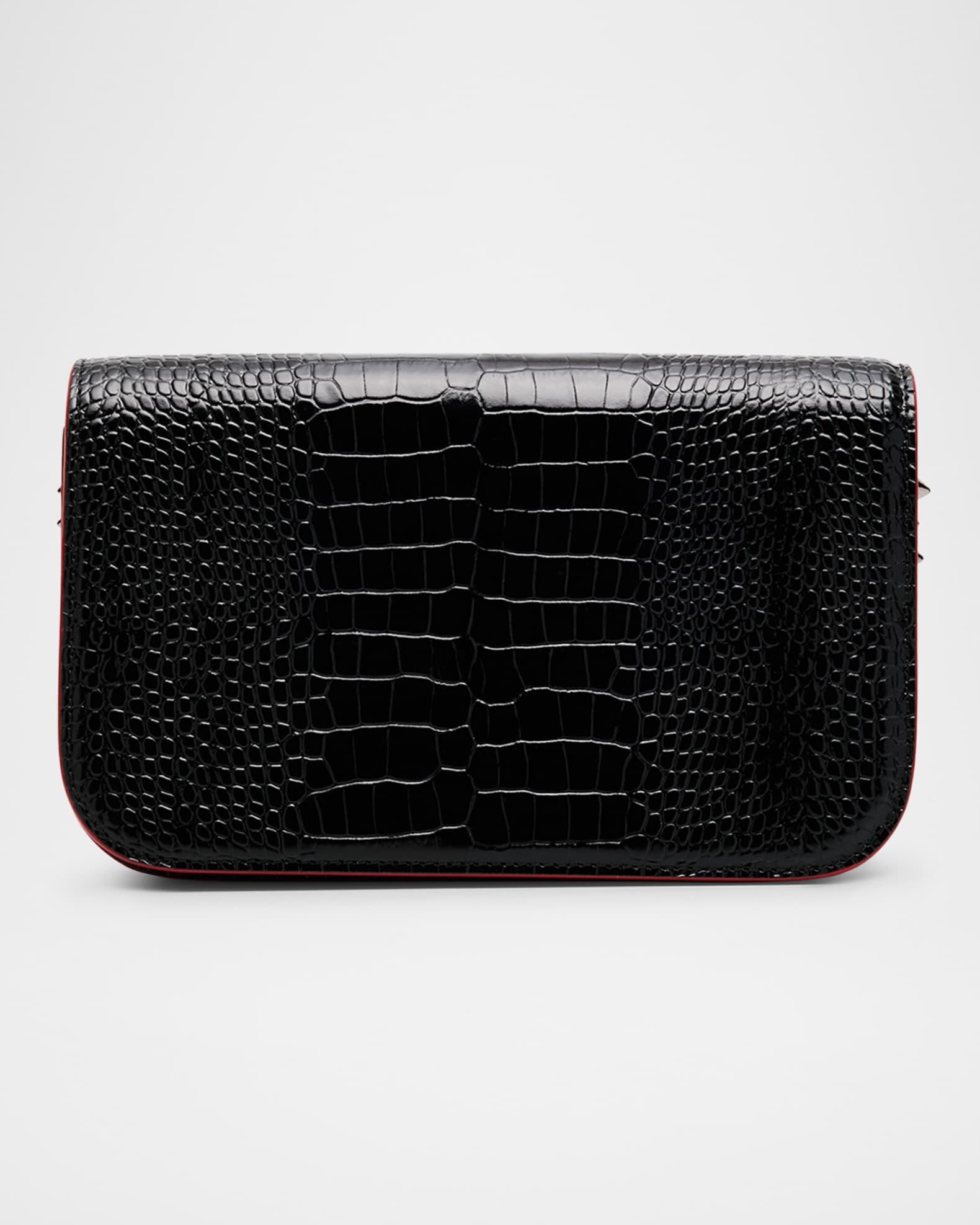 Christian Louboutin "Paloma" small clutch bag in glossy croc-embossed calfskin leather, complete with signature red painted edges Elevated by side gussets studded with spikes Stowable chain shoulder strap Can be worn as a clutch or shoulder bag Flap top with magnetic closure Signature red interior Approx. 5.1"H x 8.3"W x 2.2"D Made in Italy