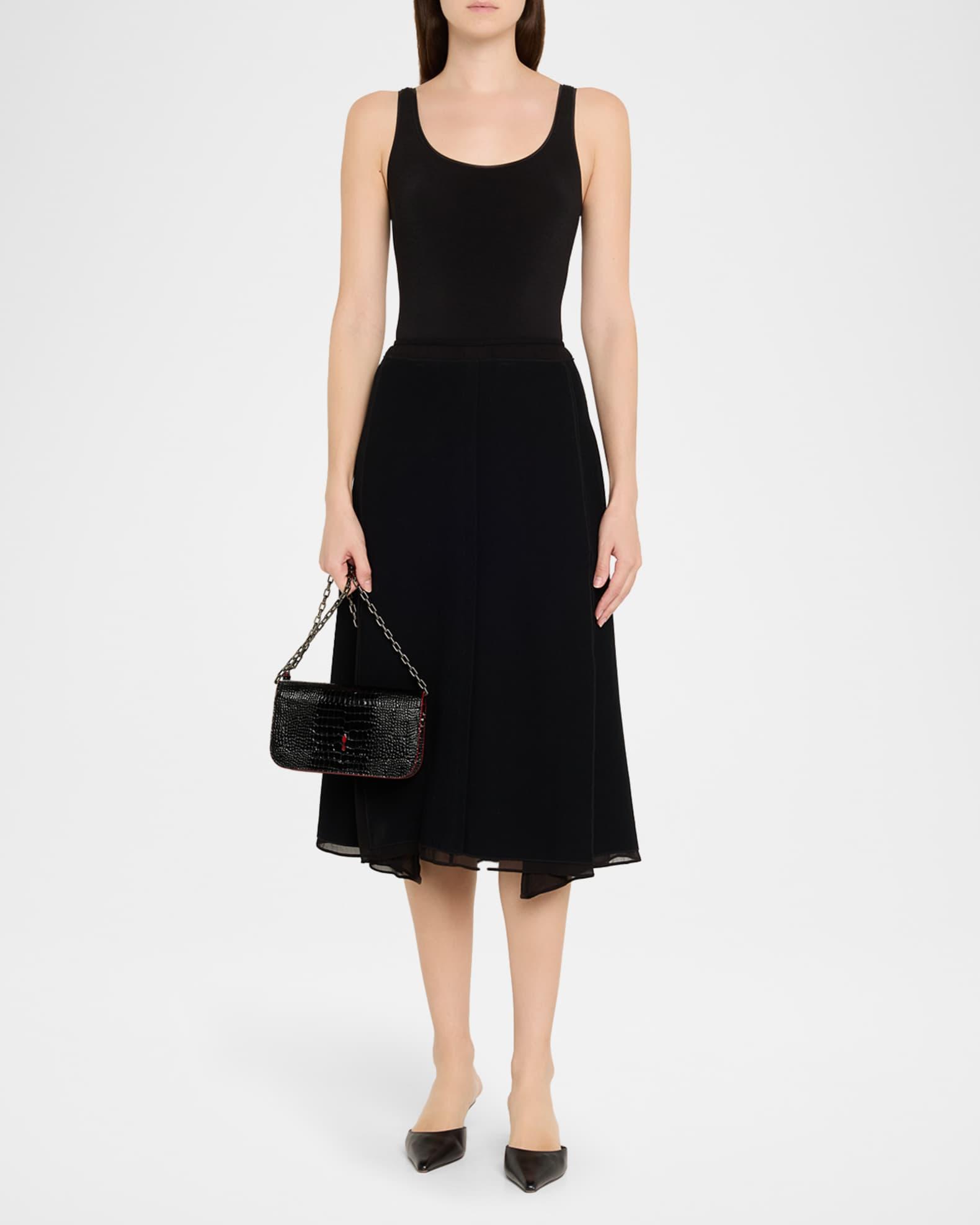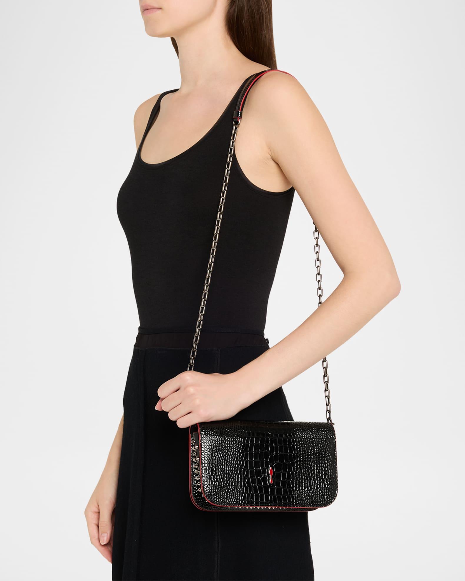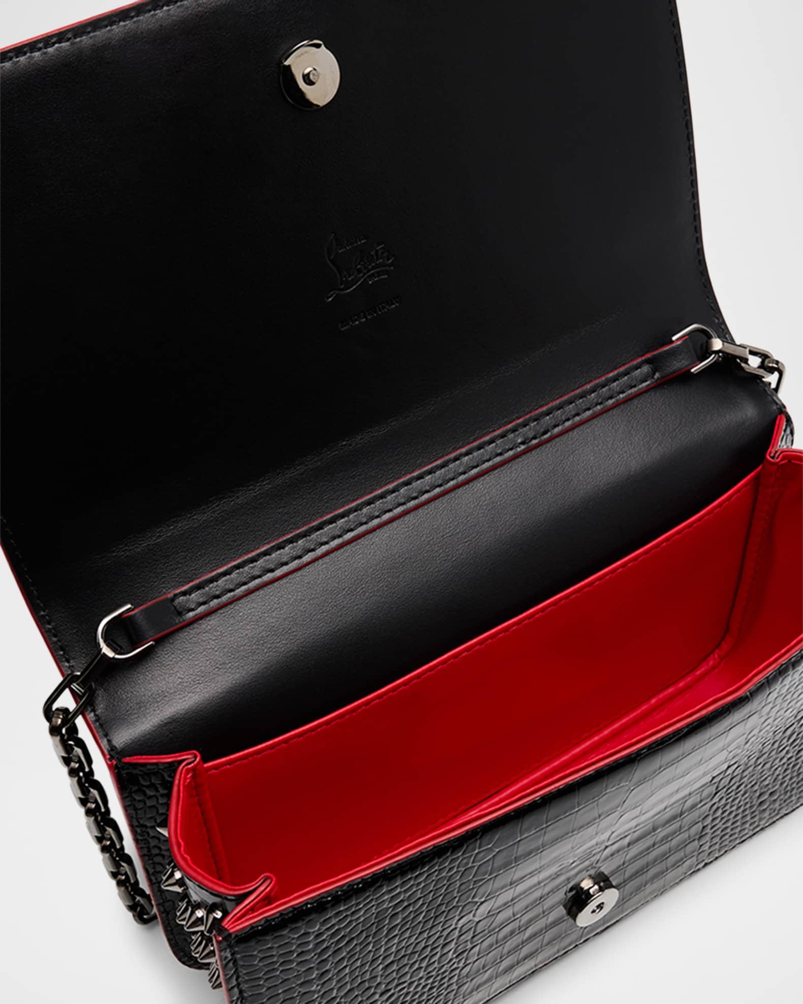 Christian Louboutin "Paloma" small clutch bag in glossy croc-embossed calfskin leather, complete with signature red painted edges Elevated by side gussets studded with spikes Stowable chain shoulder strap Can be worn as a clutch or shoulder bag Flap top with magnetic closure Signature red interior Approx. 5.1"H x 8.3"W x 2.2"D Made in Italy