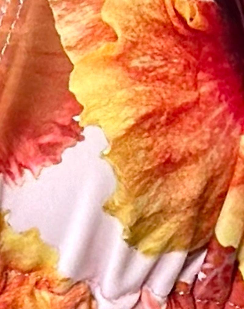 Our Pami bikini top, displaying a halterneck design with triangle cups and adjustable ties at neck and at back. Finished in an orange and peach hibiscus print, cut from stretch swim spandex and made from recycled materials. Paired with our Leyna bikini bottom. MODEL WEARS SIZE:EXTRA SMALL - MODEL HEIGHT:5'7