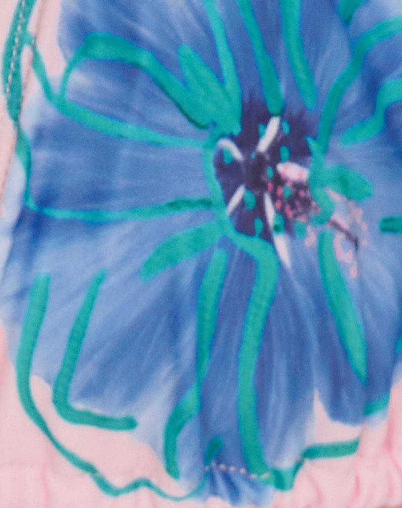 Halterneck triangle bikini top with adjustable ties at neck and at back in a soft pink colourway finished with a tonal blue printed flower on the right cup, cut from stretch swim spandex made from recycled materials. Get the matching bottoms, Letra. MODEL WEARS SIZE: EXTRA SMALL - MODEL HEIGHT: 5'7