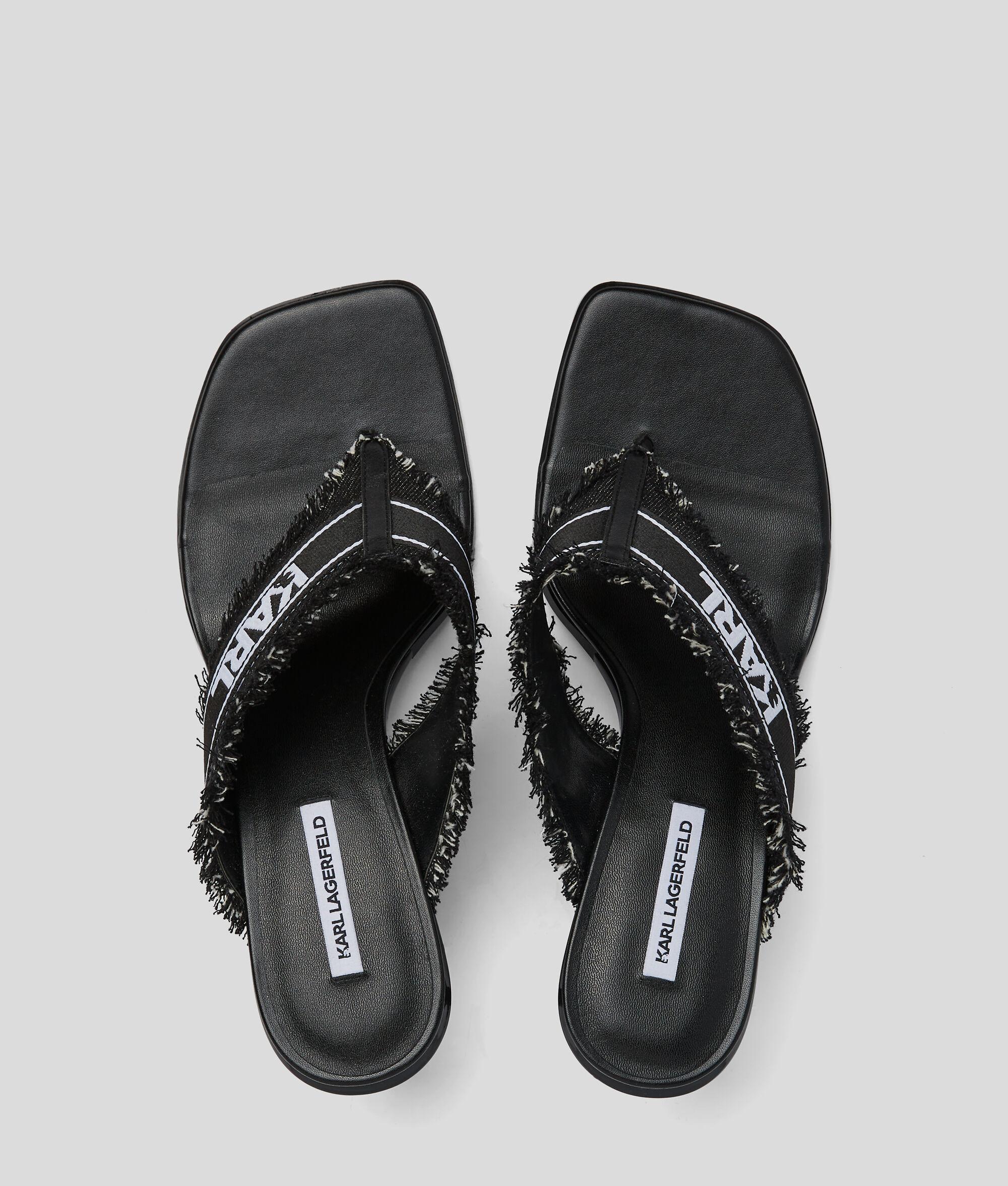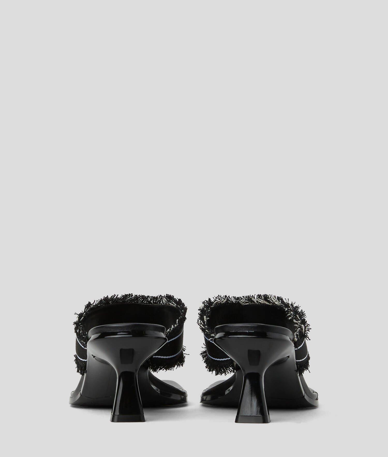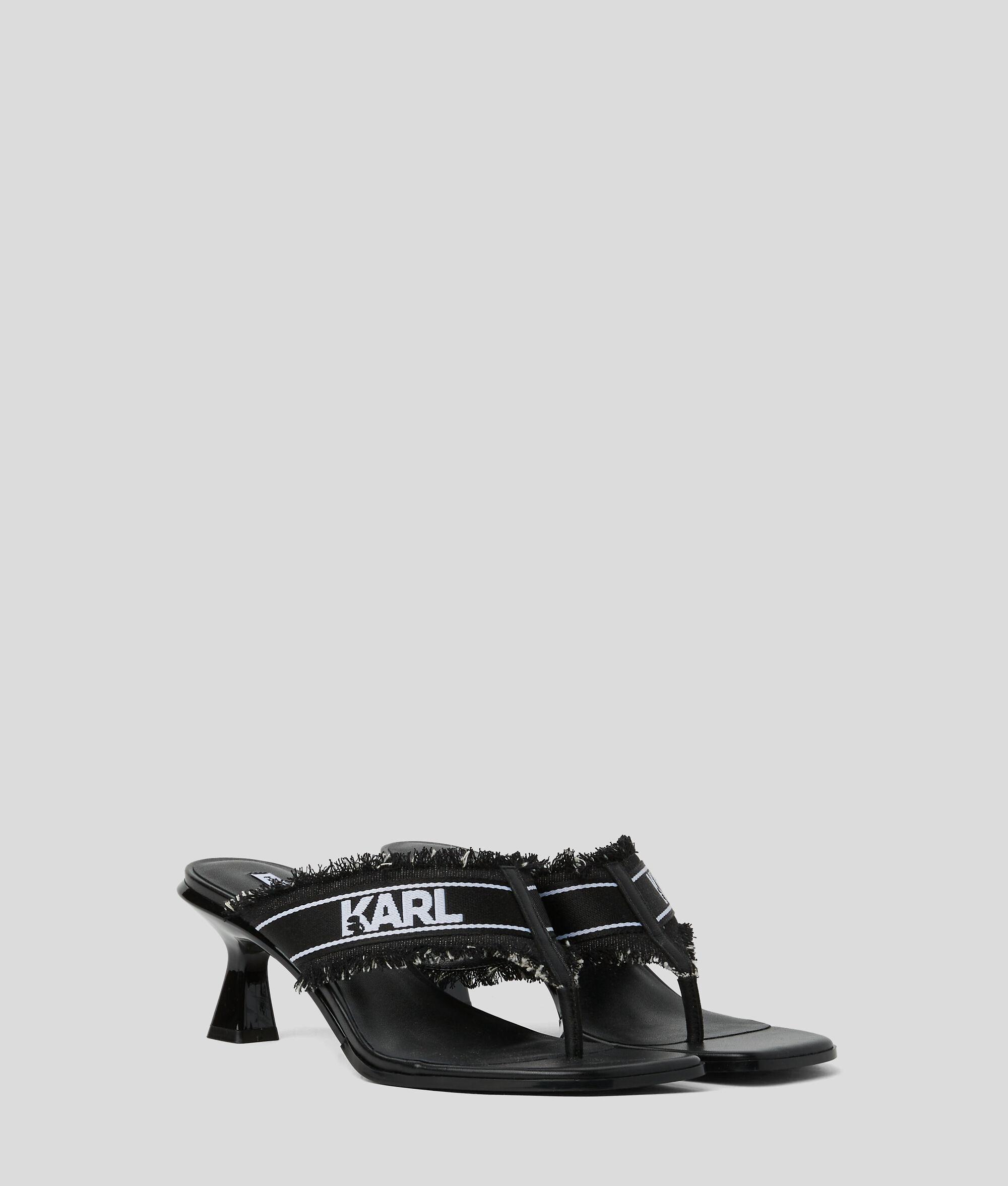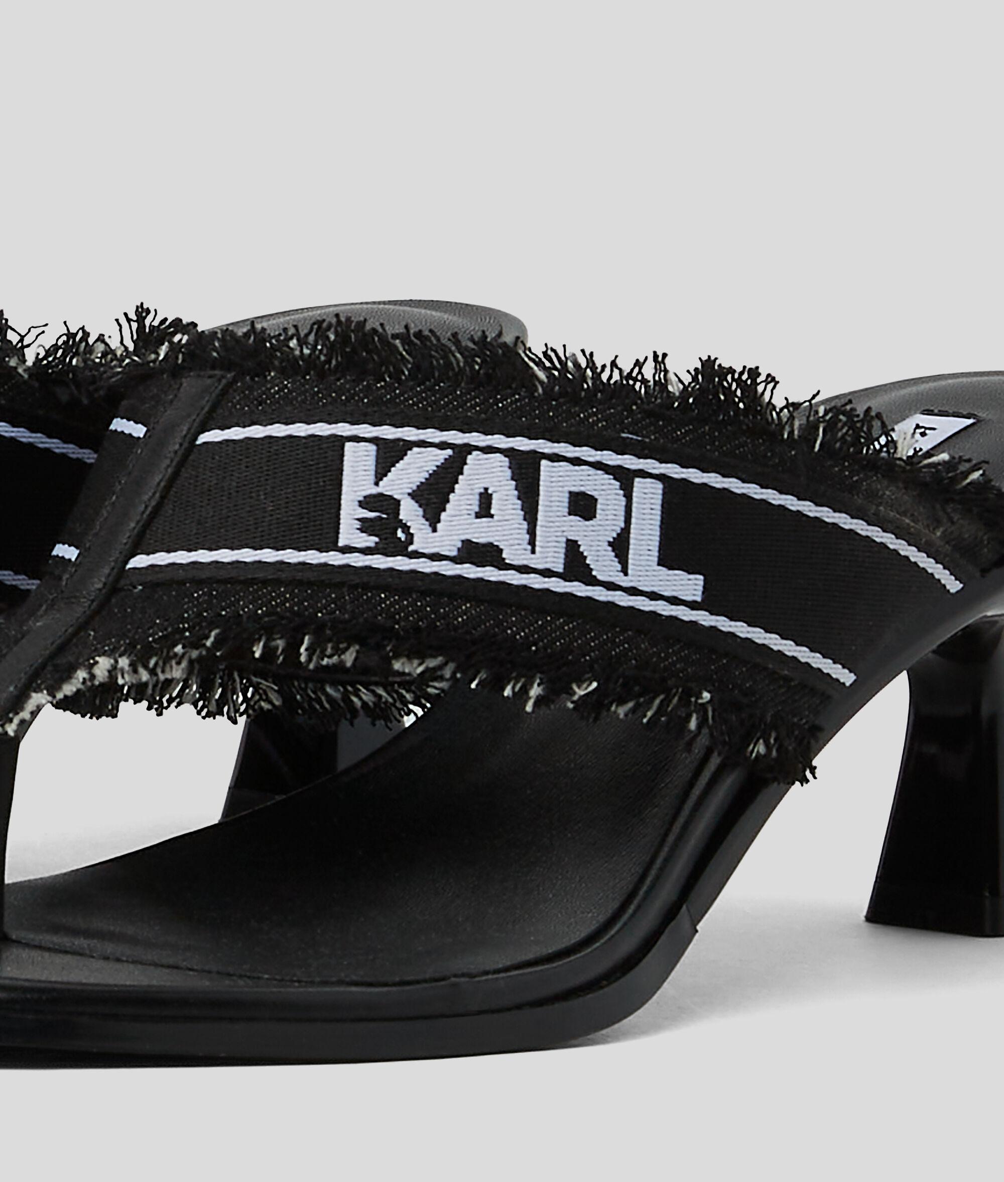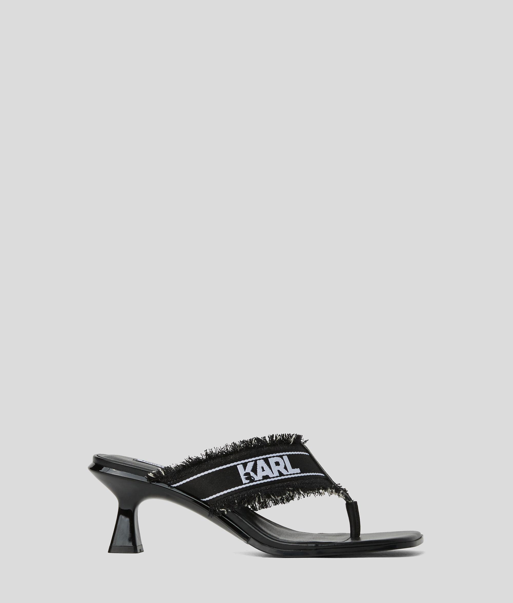 Upgrade your summer footwear with these statement slip-on sandals featuring a contemporary denim strap with edgy frayed detailing and bold contrasting KARL LAGERFELD logo. A high-shine kitten heel provides just the right amount of lift, making these sandals perfect for both casual and dressier occasions.