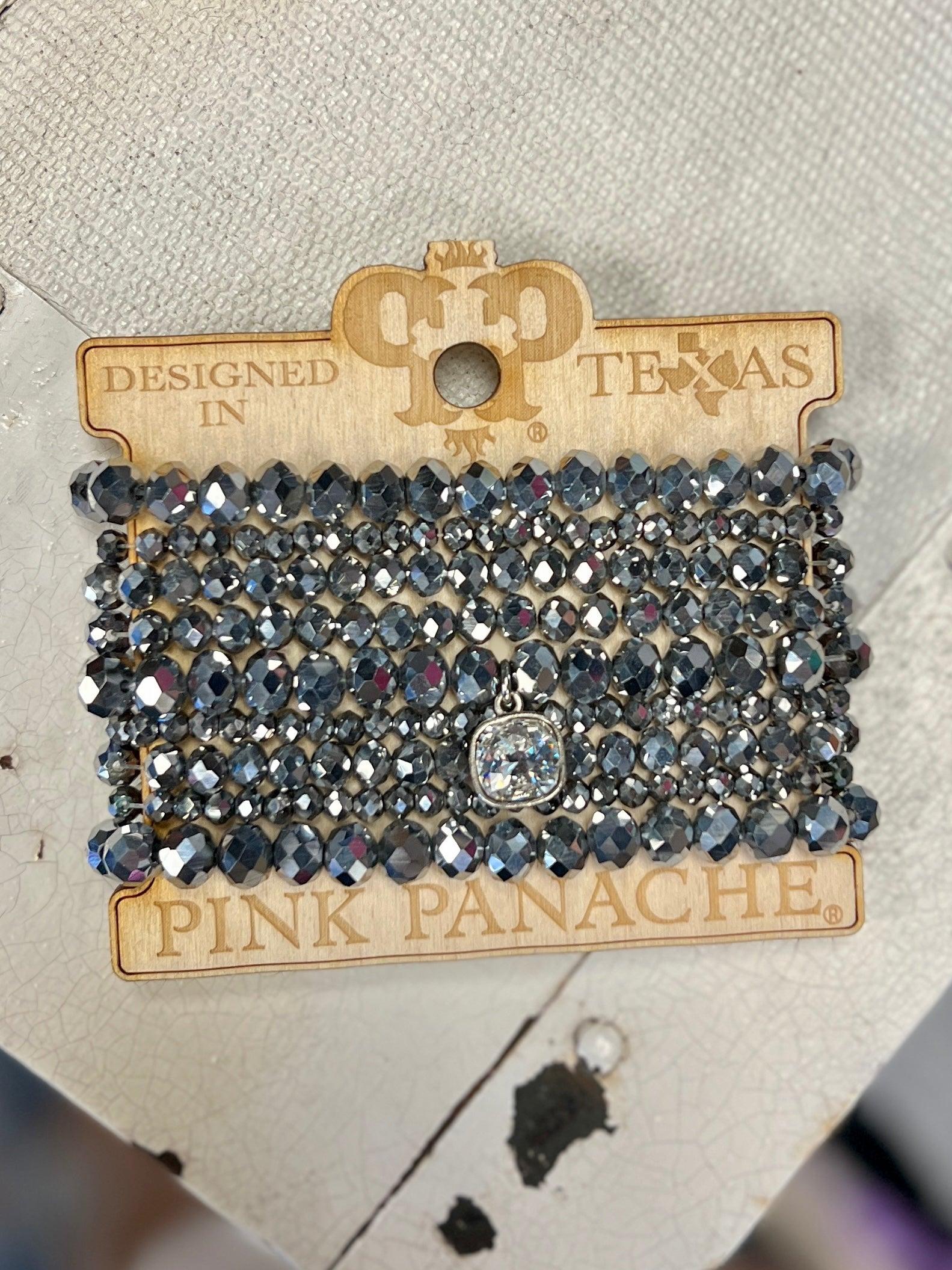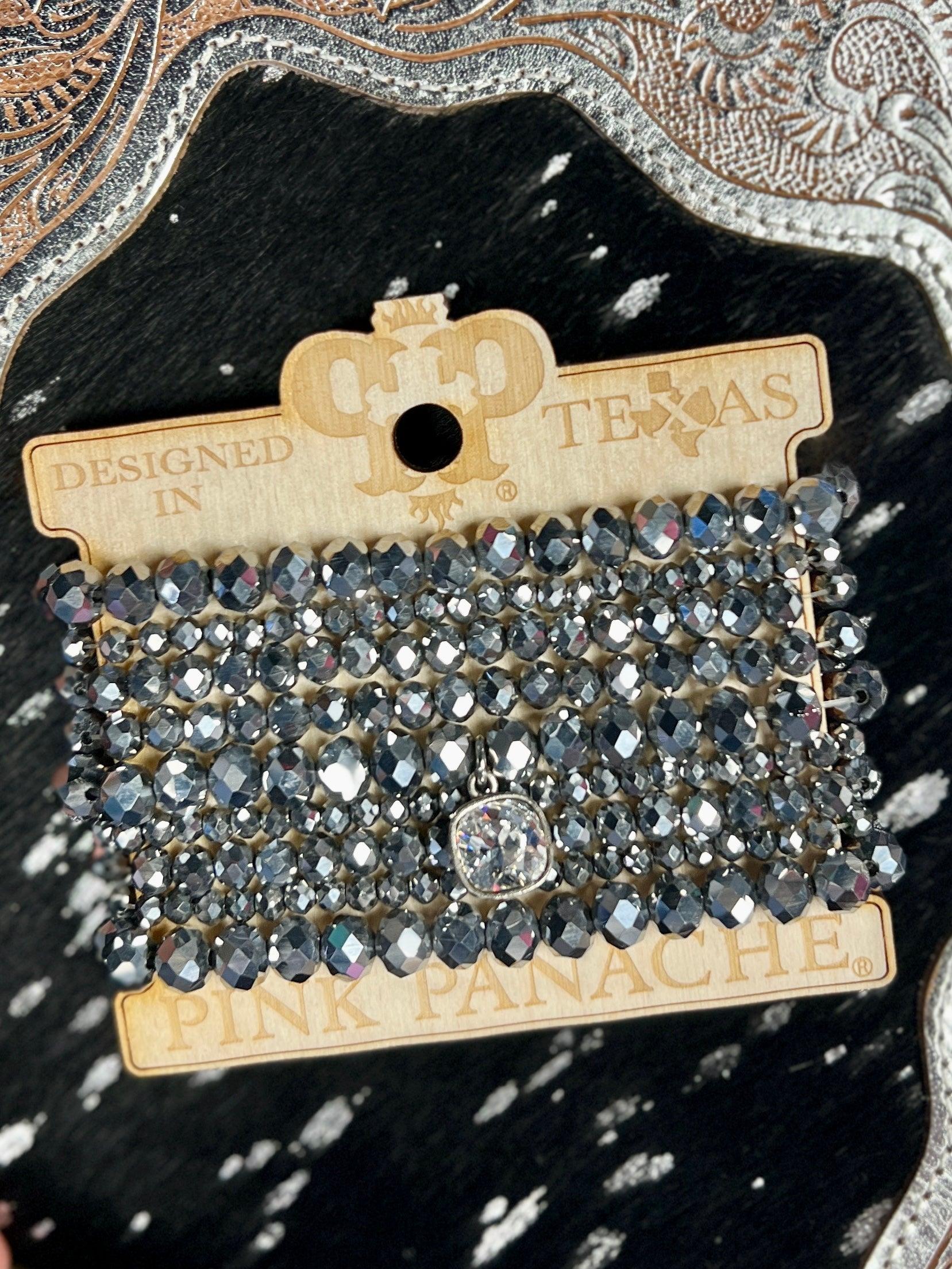 Get ready to layer on the charm with this 9strand, stretchy bracelet featuring strands of multi size silver beads and topped off with a 1/4" clear rhinestone dangle stone.