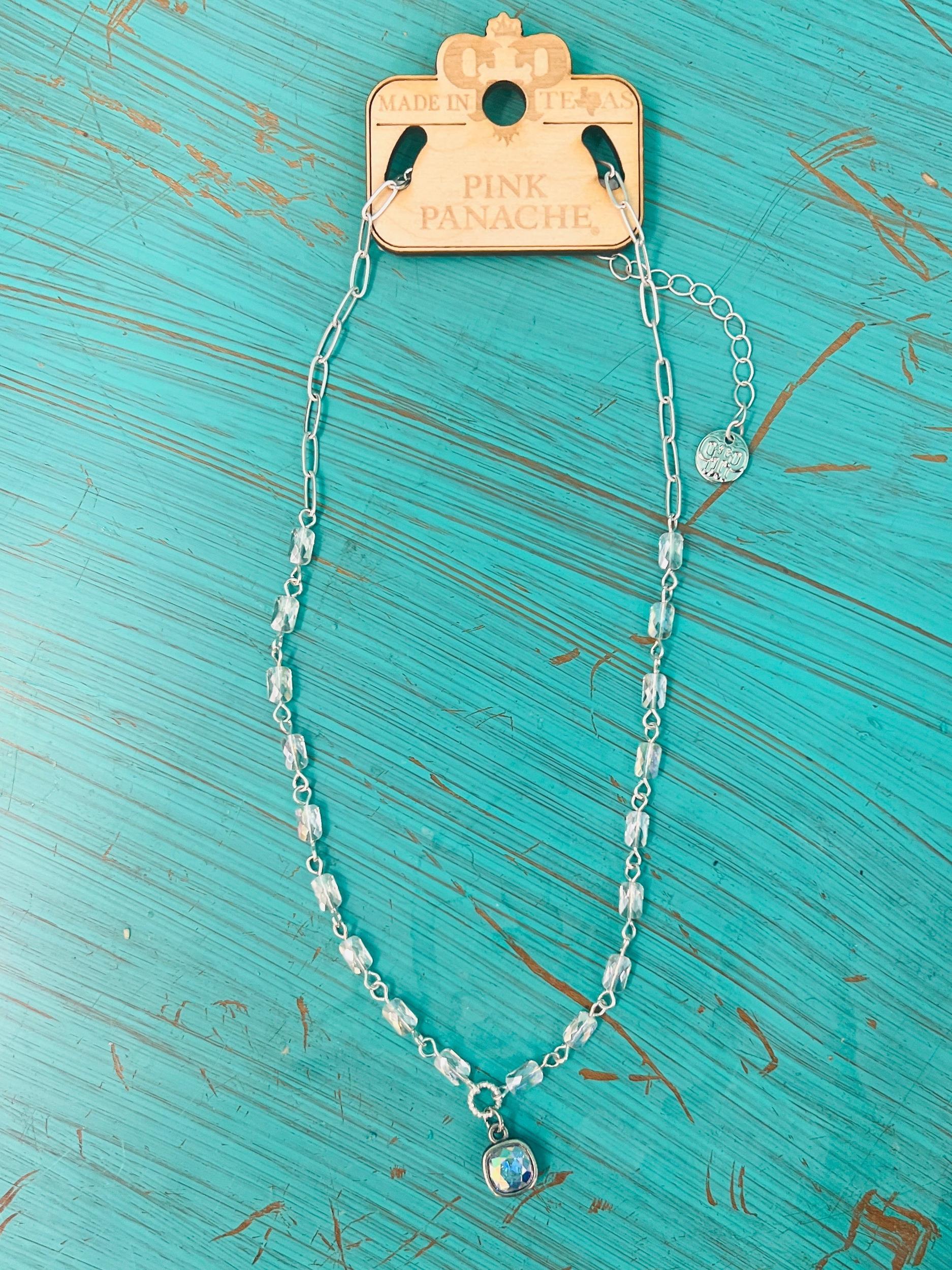 Make a statement with the Panache Vegas Lights Necklace. Featuring a trendy 16" paper clip chain, delicate silver accents, and sparkling clear beads, this necklace is perfect for any occasion. Plus, the 1/4" iridescent stone adds a touch of glamour. Easily adjust the length with the 3" lobster clasp extender. Shine on! **Matching Earrings Sold Separately**