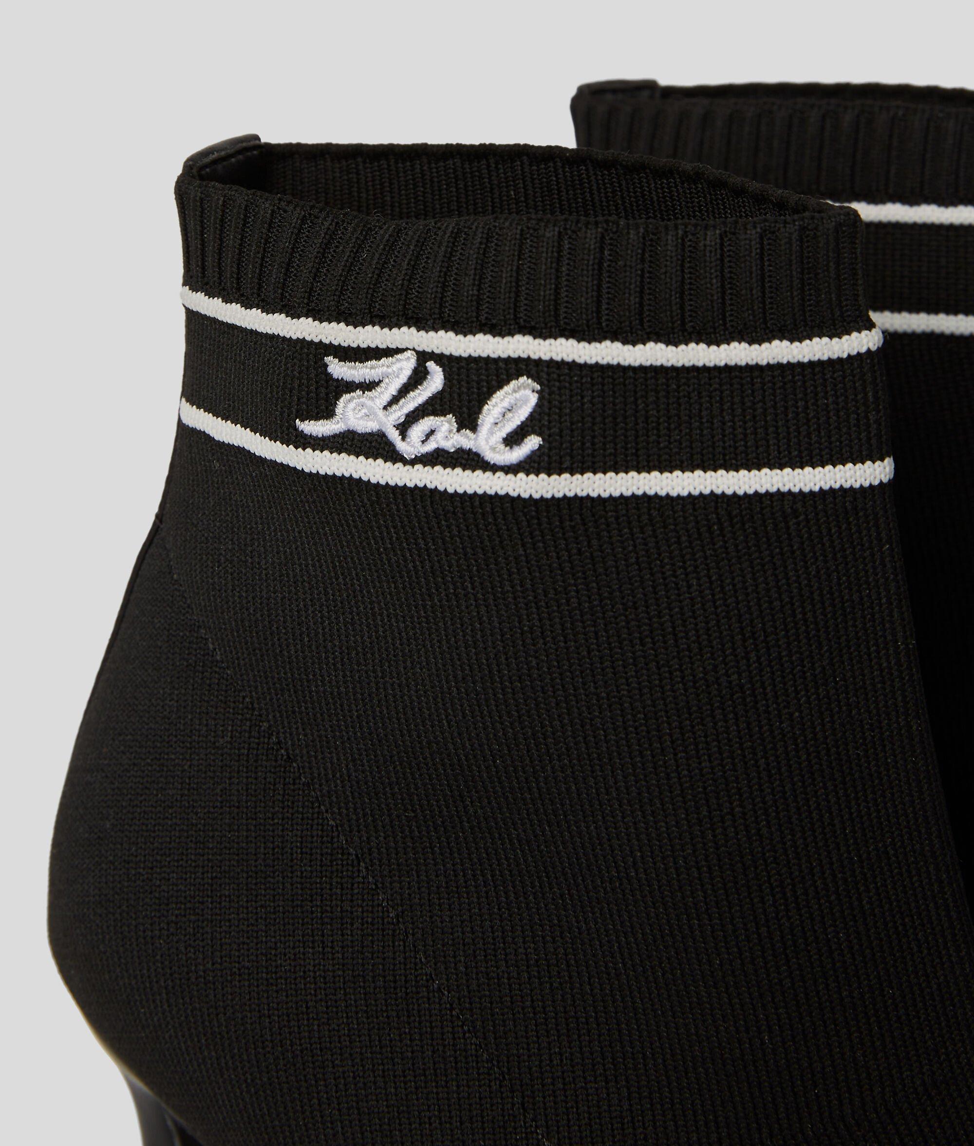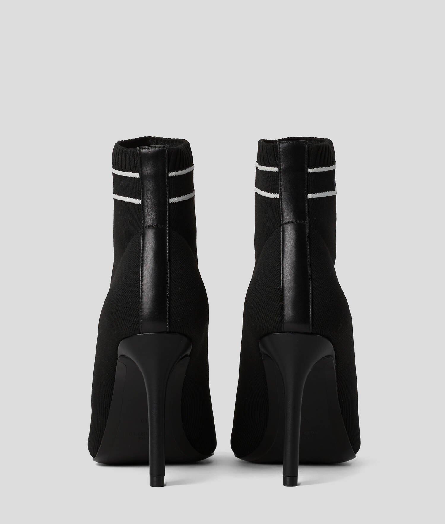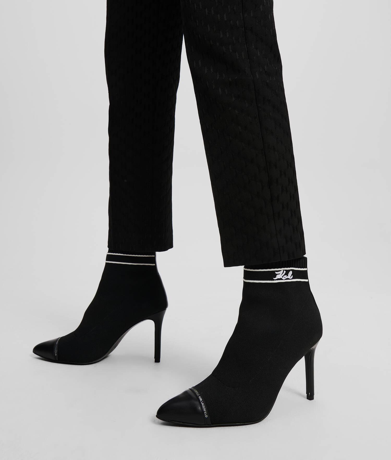 Elevate your style with these slip-on boots featuring a pointed toe and high stiletto heel. The KARL Signature knitted ankle cuff adds a unique touch. Crafted from a quality knit material and leather blend, these boots are a must-have for your wardrobe.