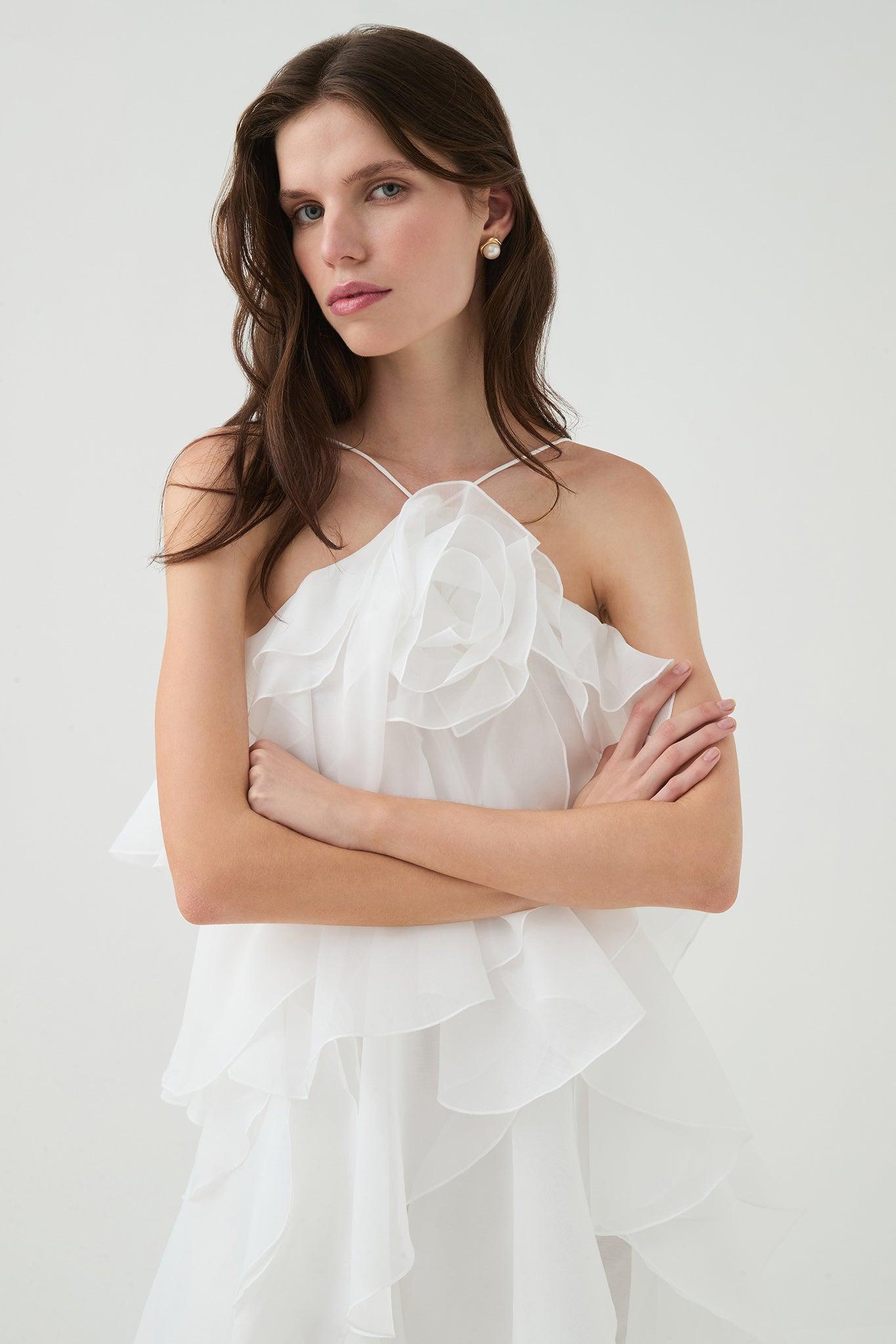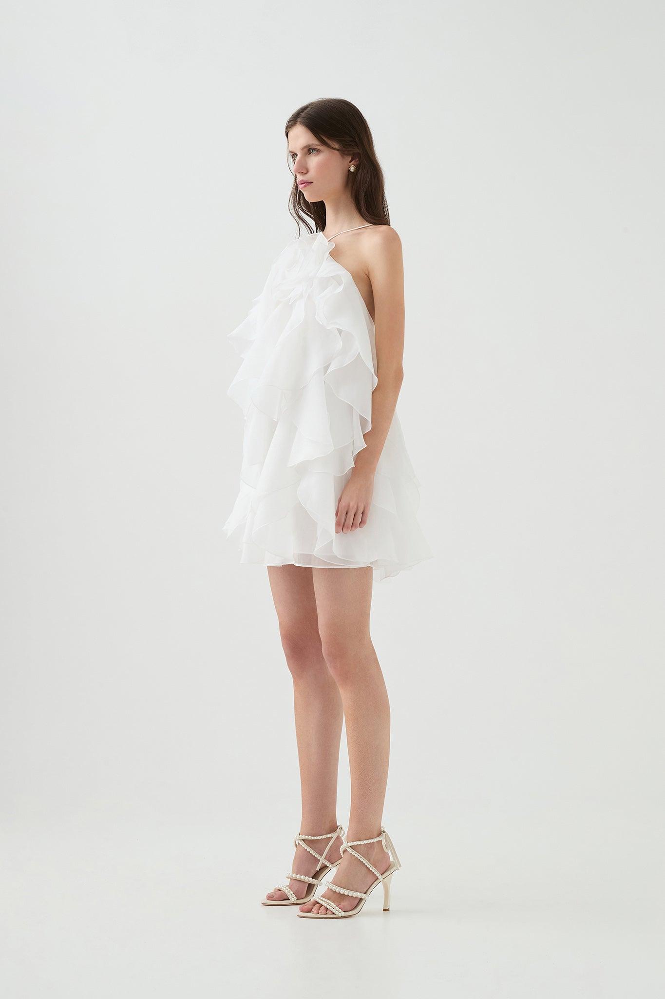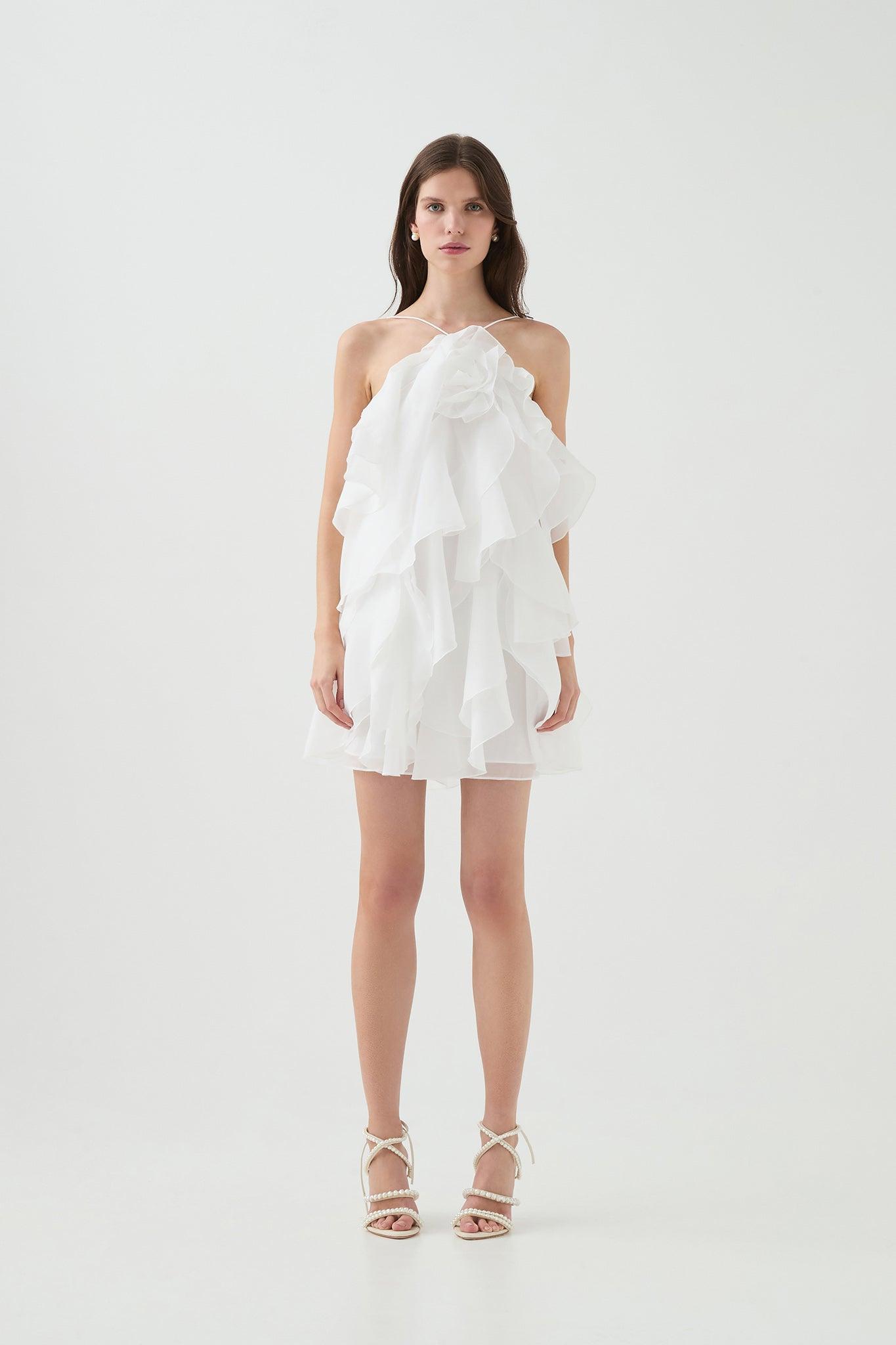 PRODUCT DETAILS Women's mini dress Voluminous silhouette Layered ruffles throughout Halter neckline Adjustable straps with back ties Lined 100% Polyester Dry Cl...