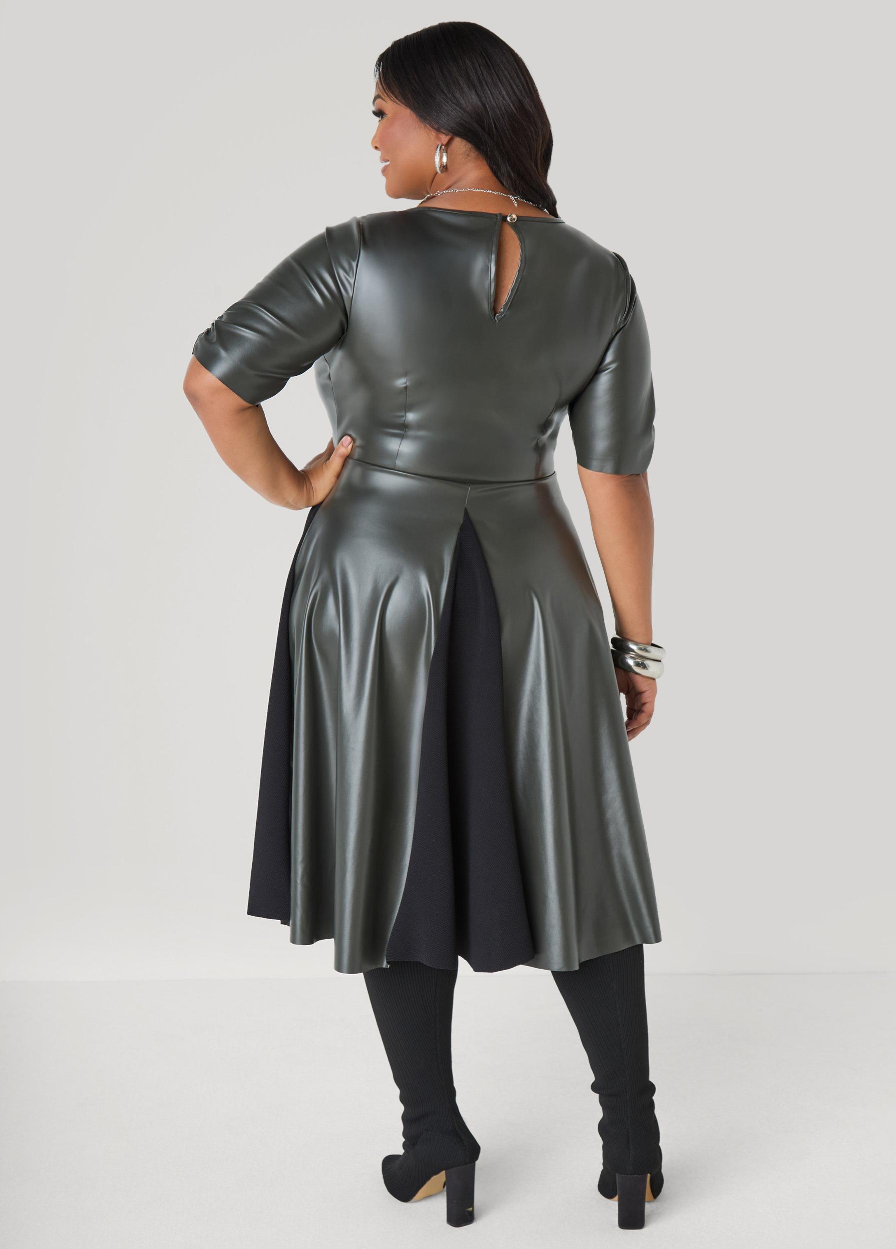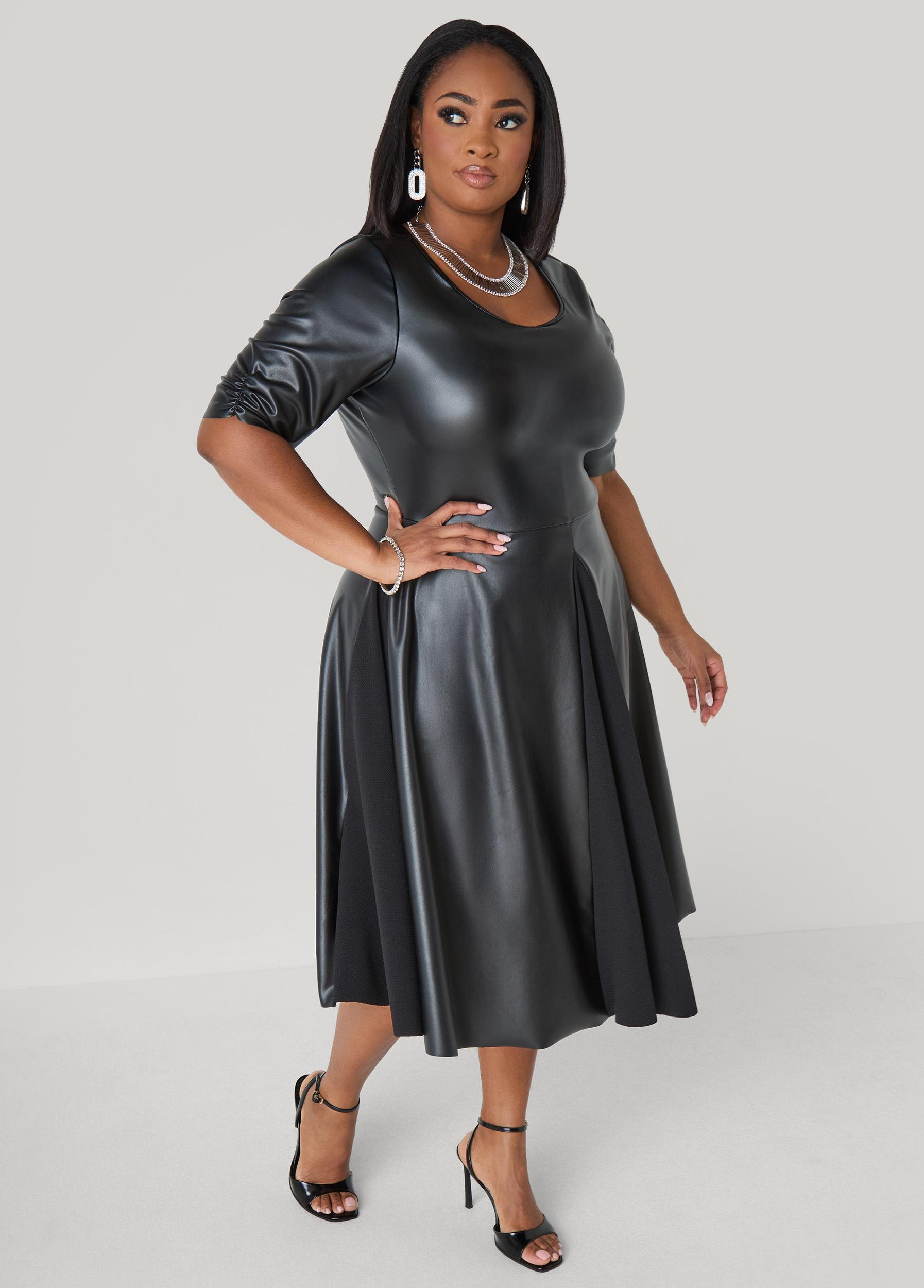 This faux leather dress is an instant hit with ruched sleeves and playful textured-knit panels along the A-line skirt.