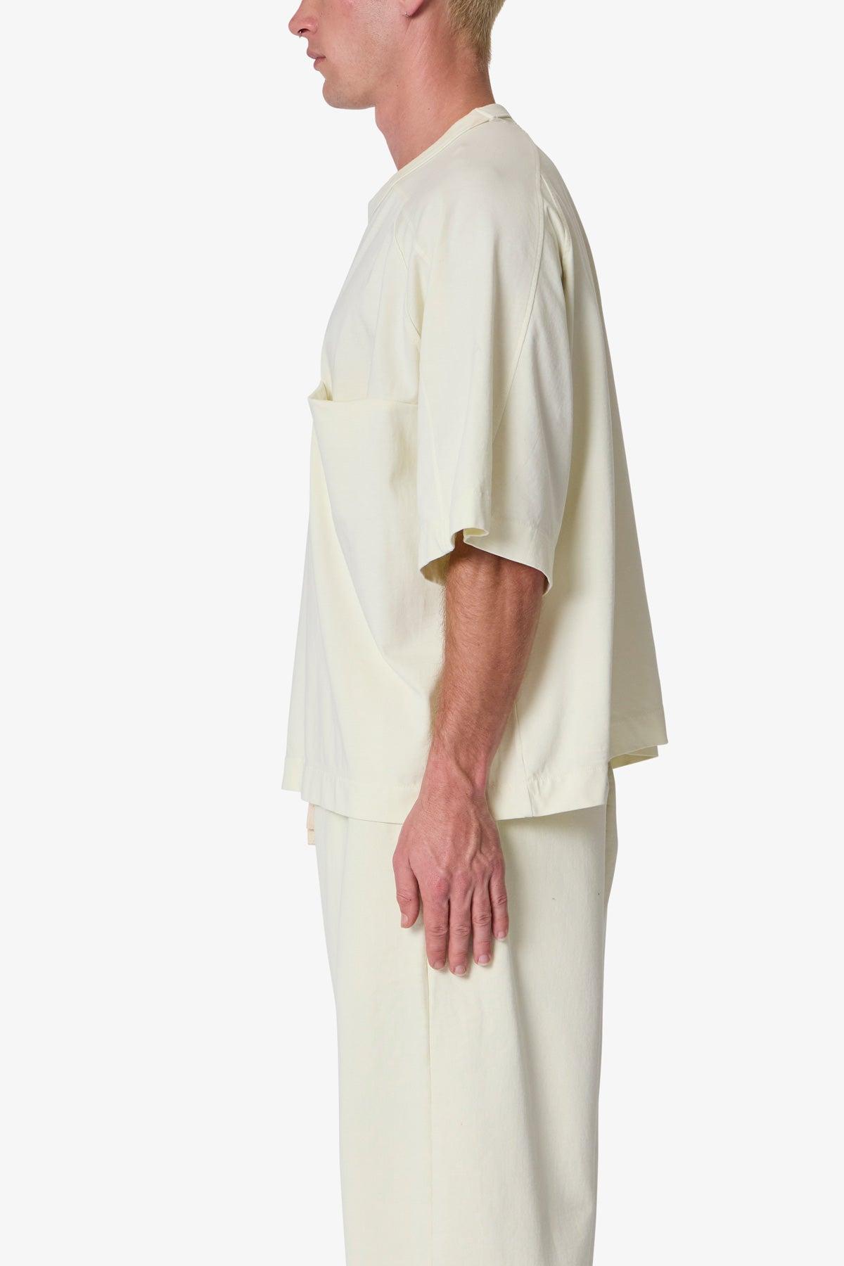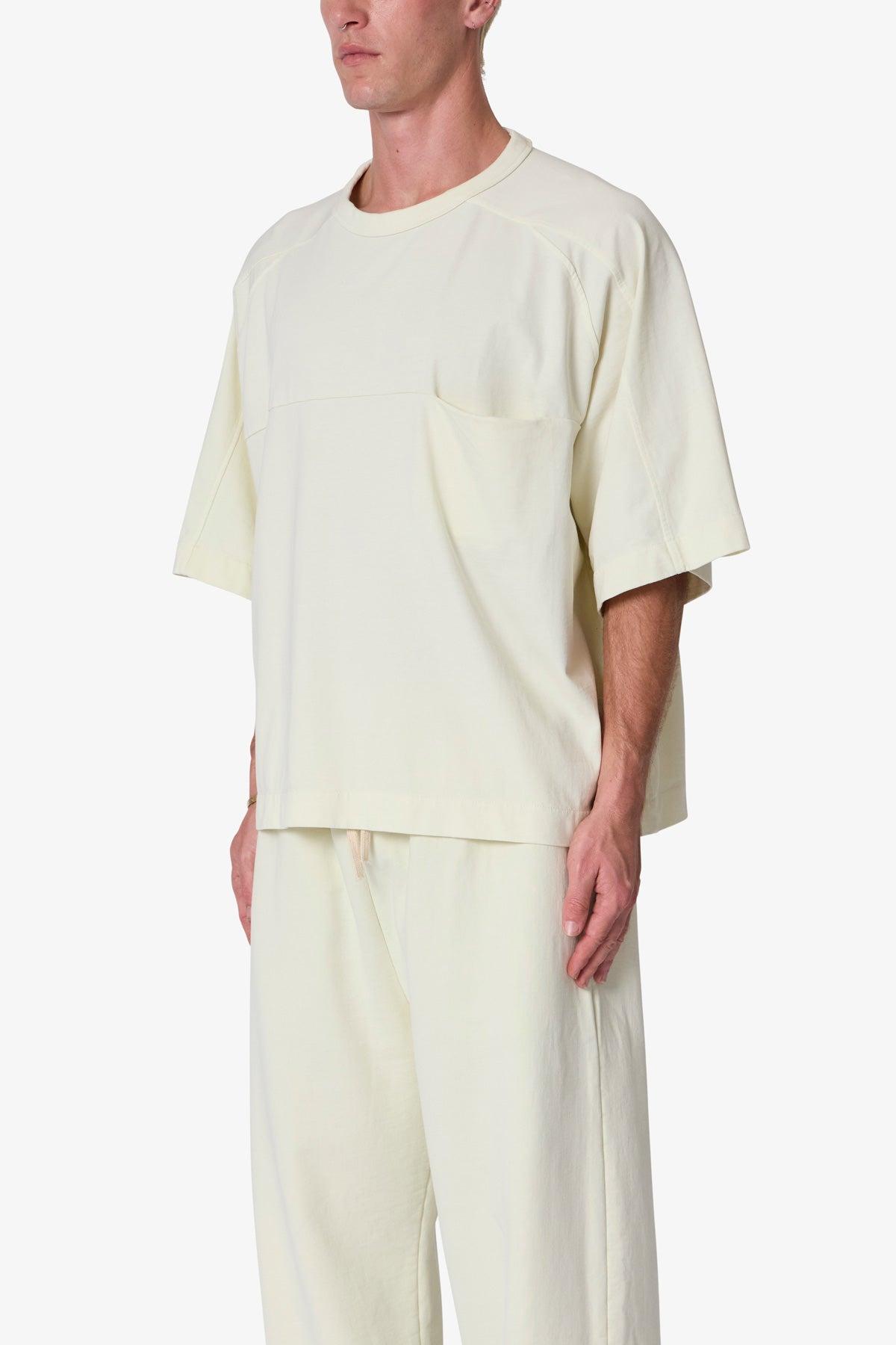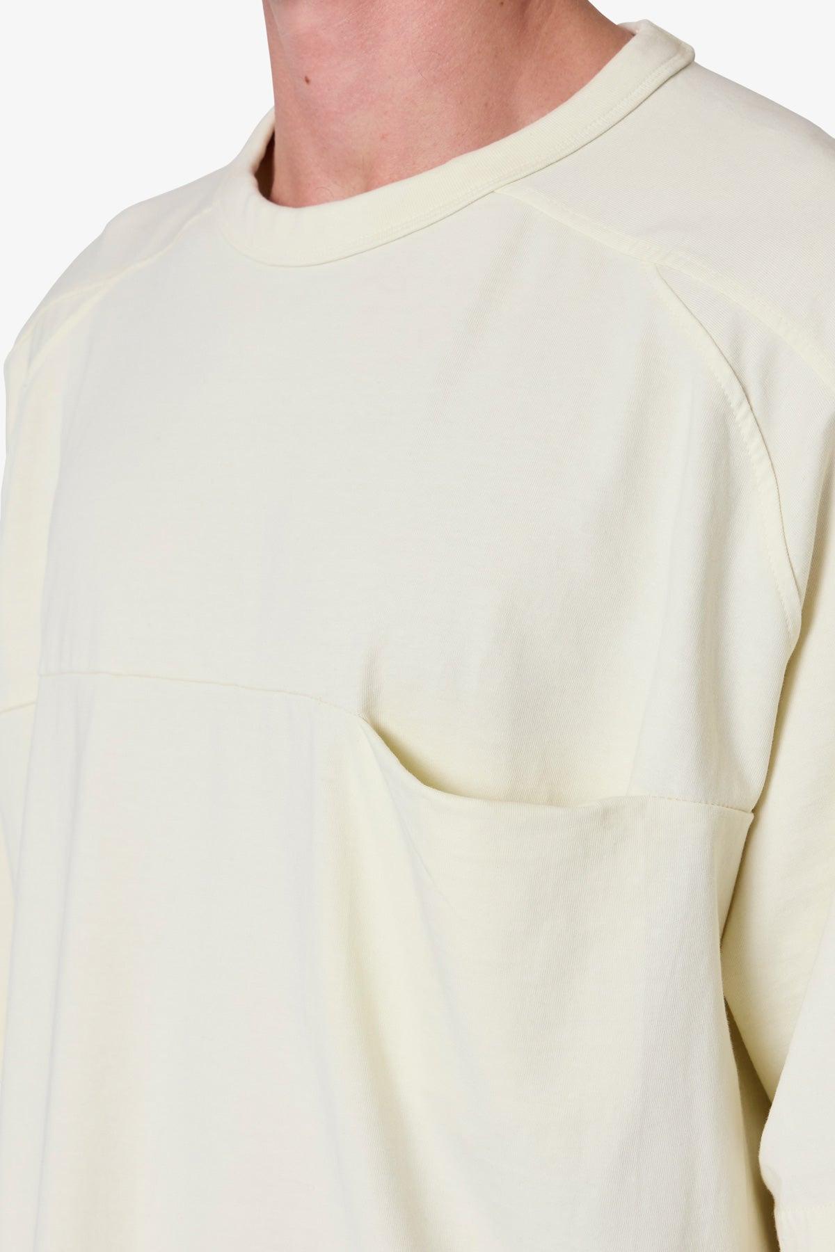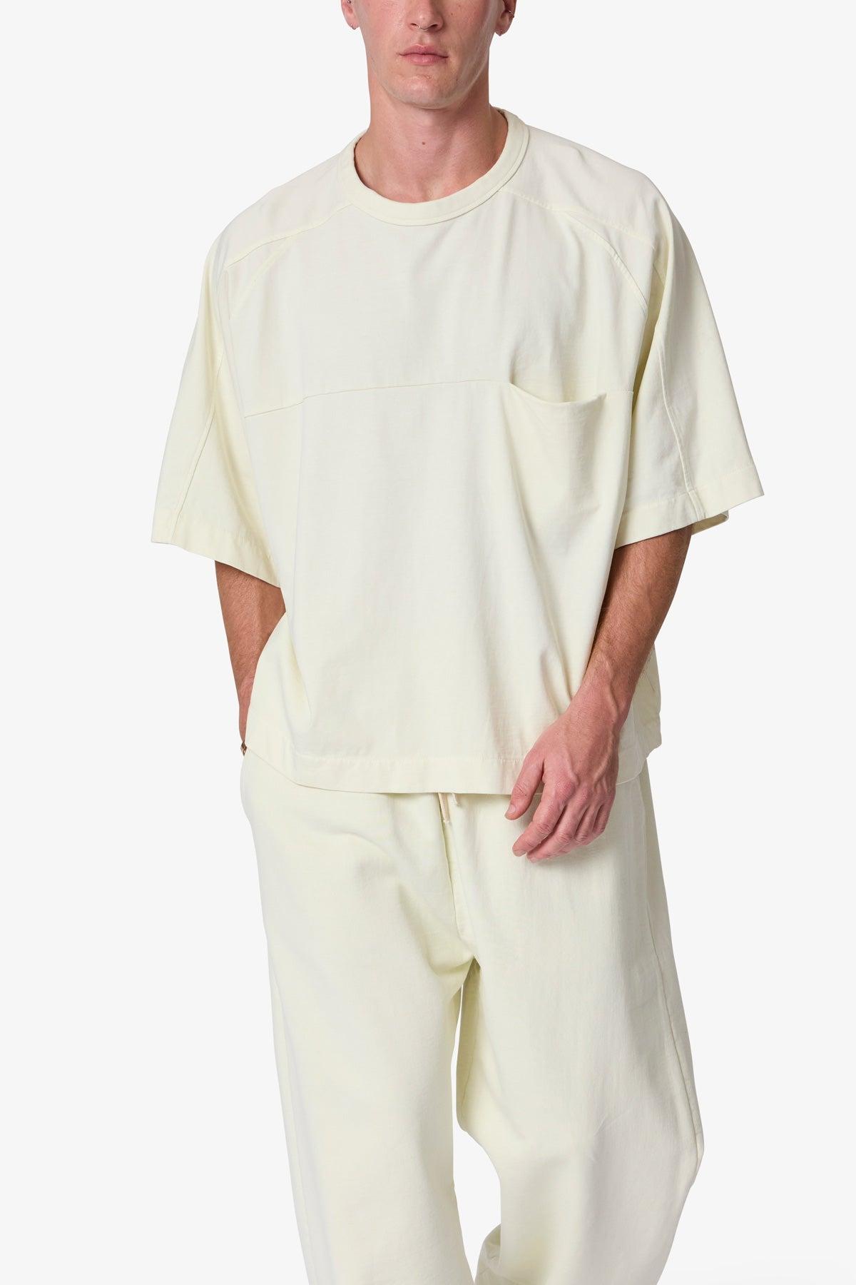 the Paneled Hidden Pocket Tee features a flat hem line and an extended shoulder seam for a relaxed, dropped shoulder fit, constructed from a washed cotton fabric, panel across the chest with an integrated pocket, and finished with an exaggerated oversized fit. details oversized fit 100% cotton model is 6’1, 140 lbs and